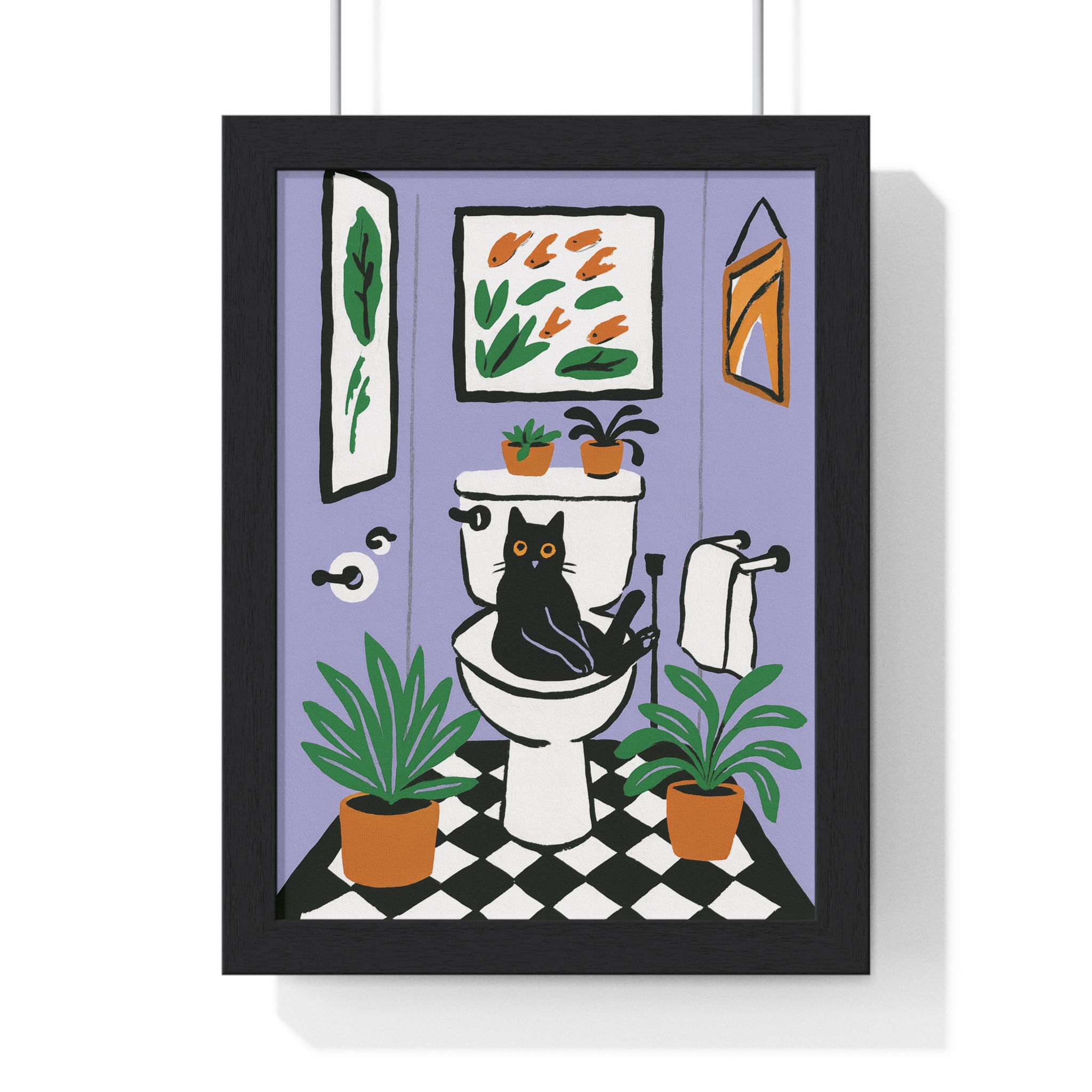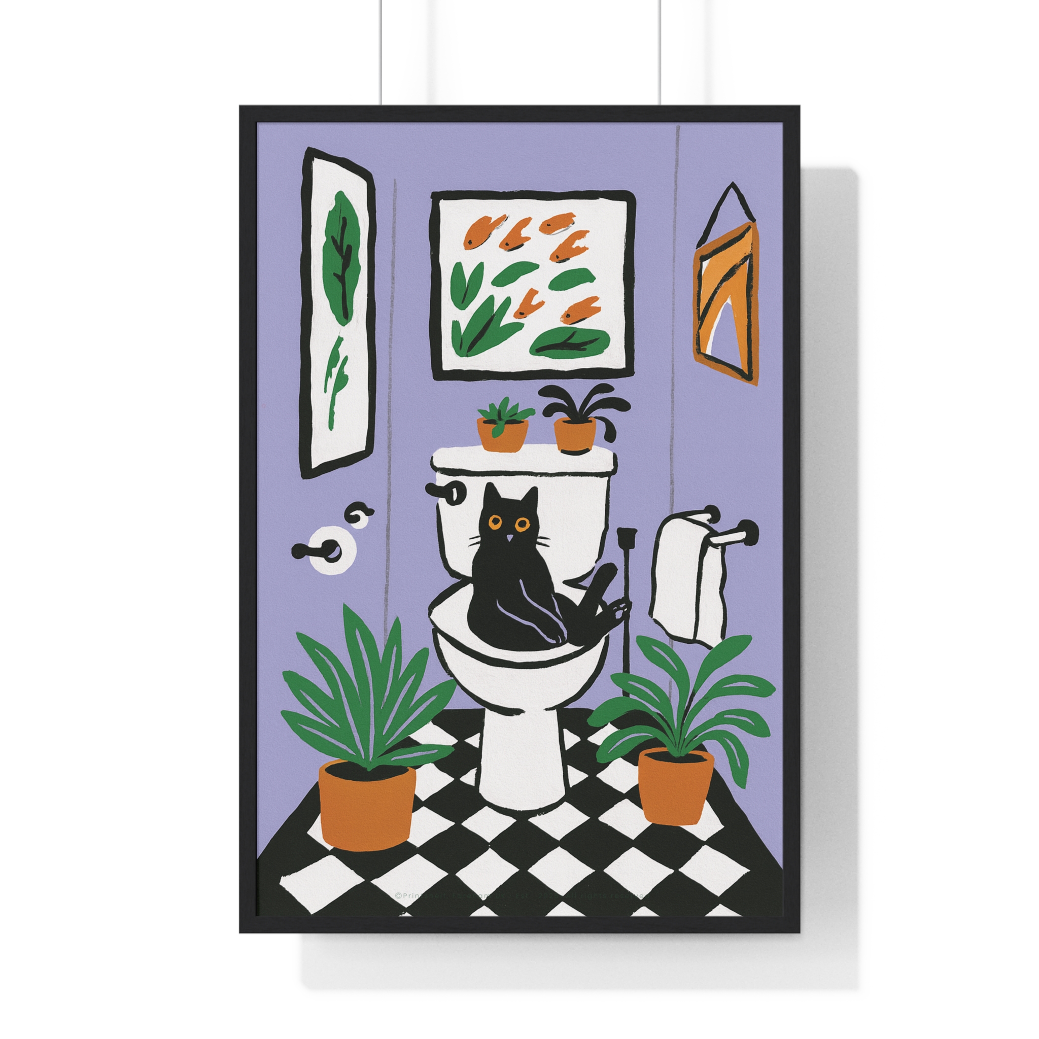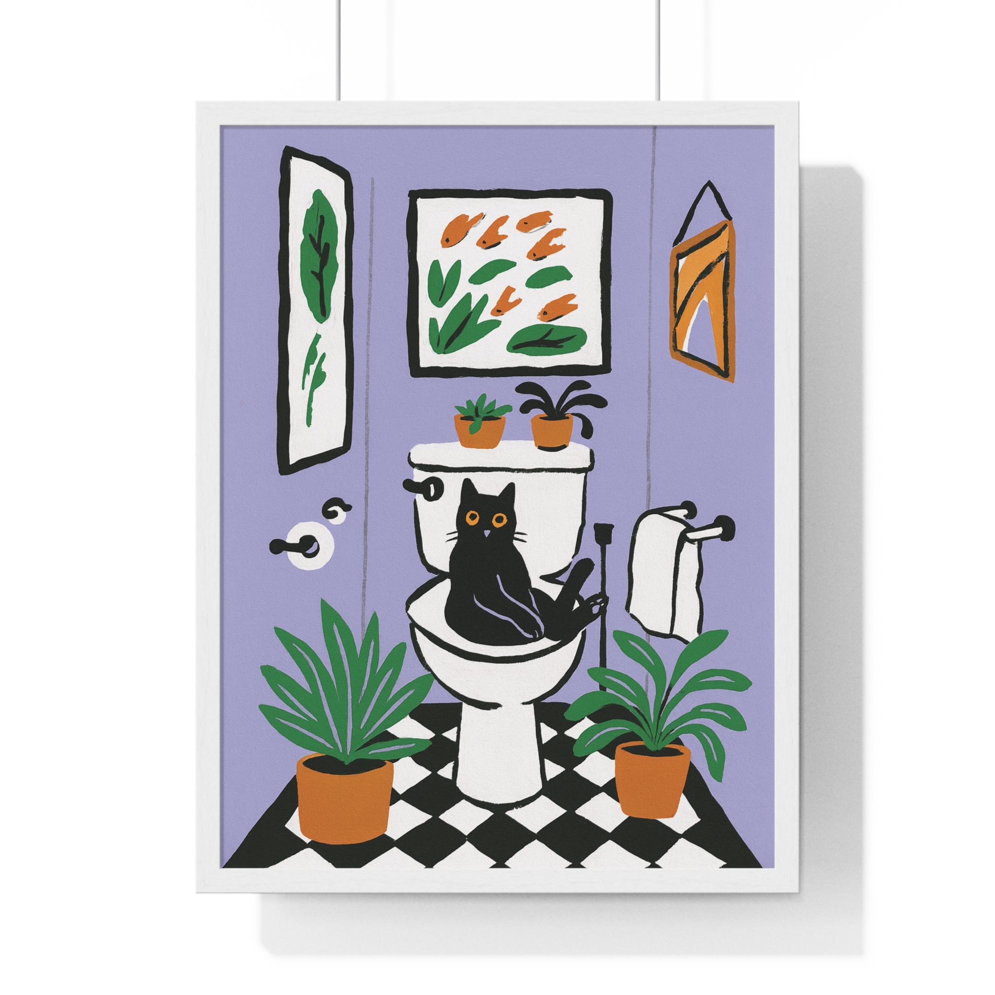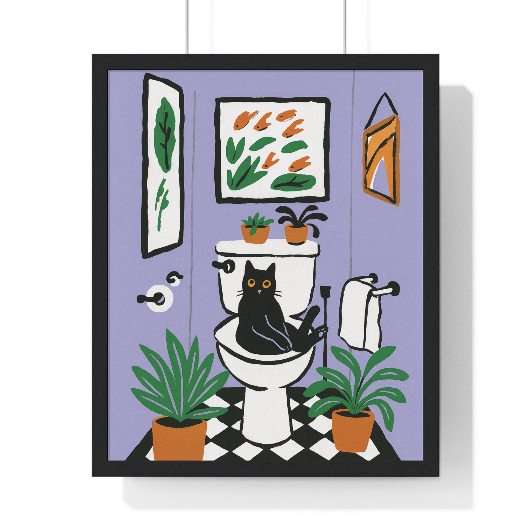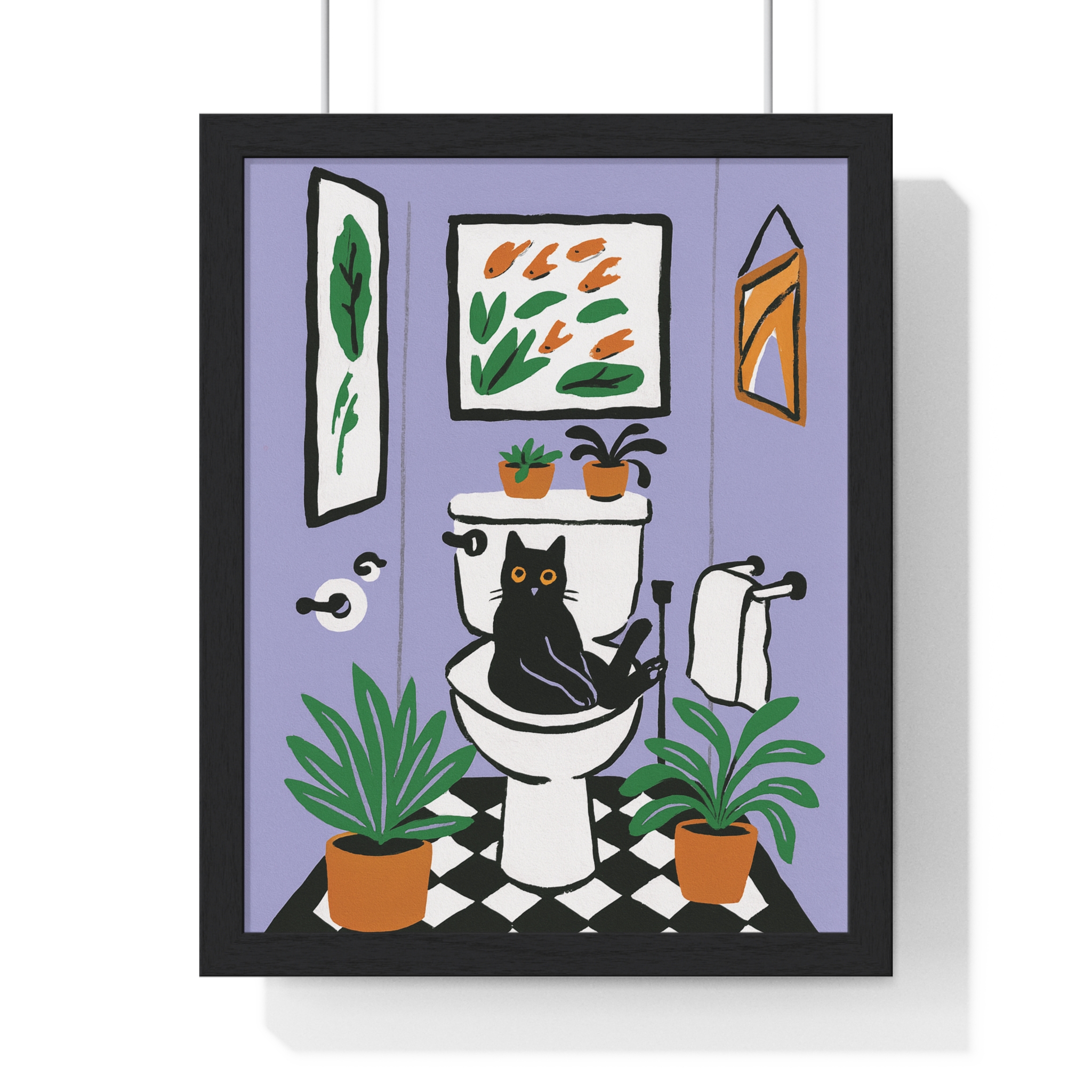 This vertical framed poster brings a playful, cozy moment into your home — a quirky black cat perched on a toilet amid leafy houseplants and framed art, rendered in bold pigment inks on matte museum-grade paper. The wooden frame and plexiglass give it a gallery-ready presence while the pre-installed hanging hardware makes it simple to add personality to a bathroom, hallway, or snug reading nook. Colors stay bright and true over time thanks to archival materials and pigment printing. It reads like a whimsical snapshot that invites a smile every time you pass by.