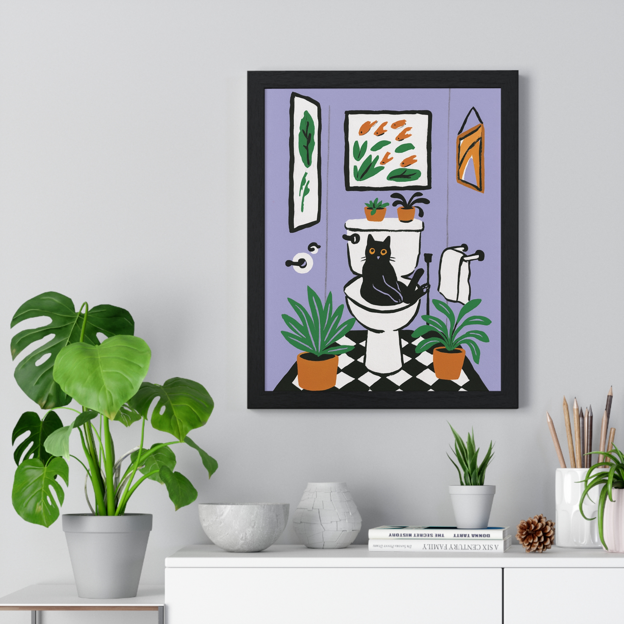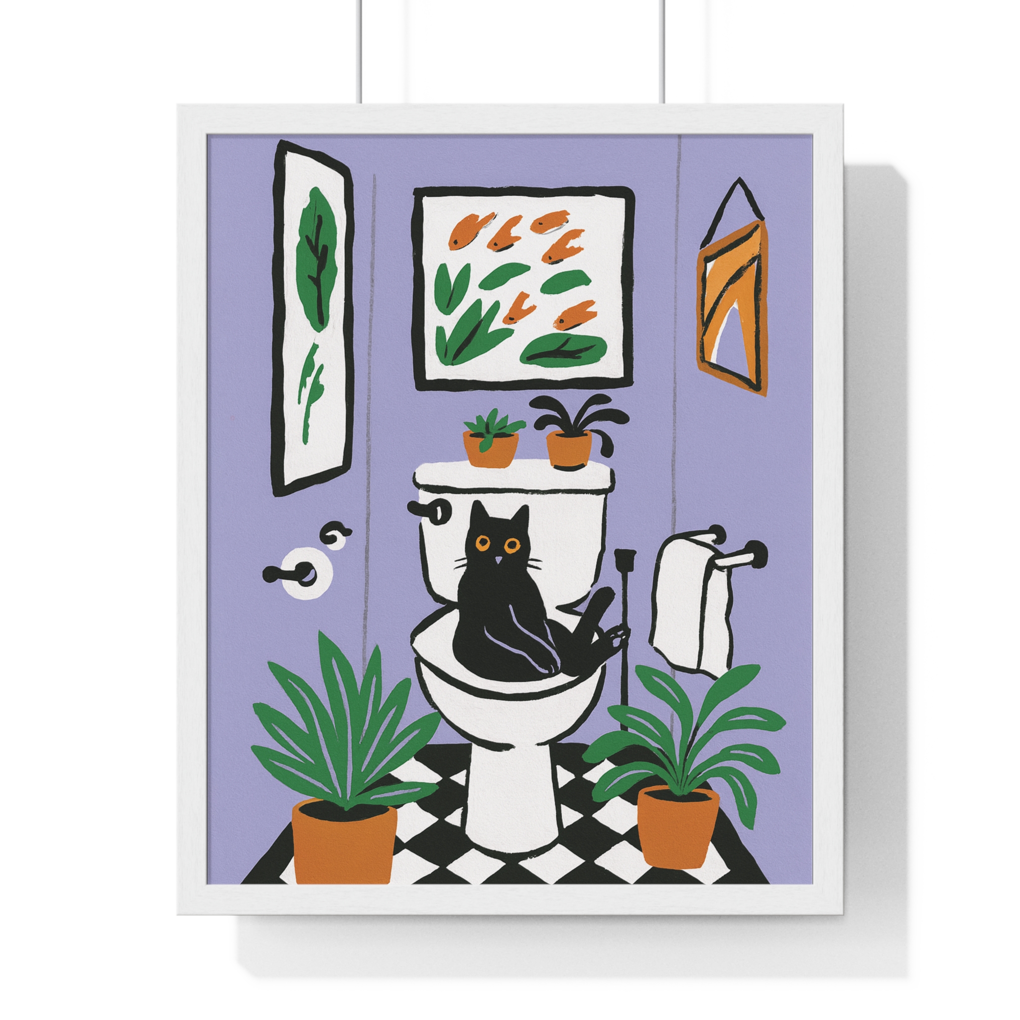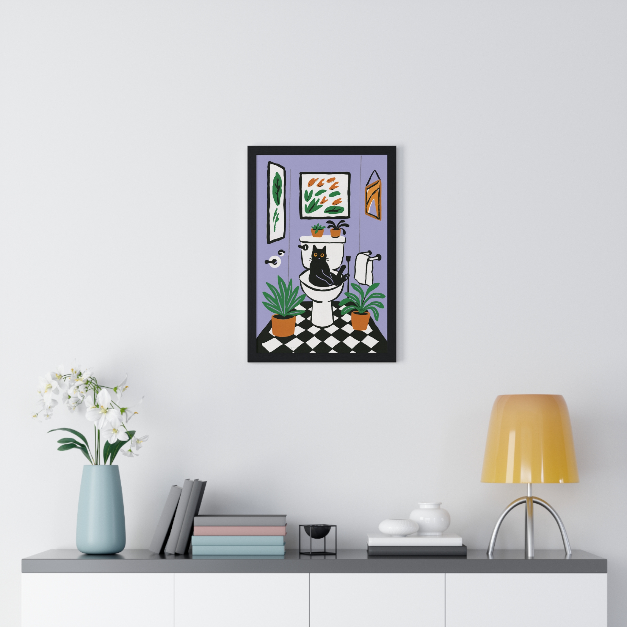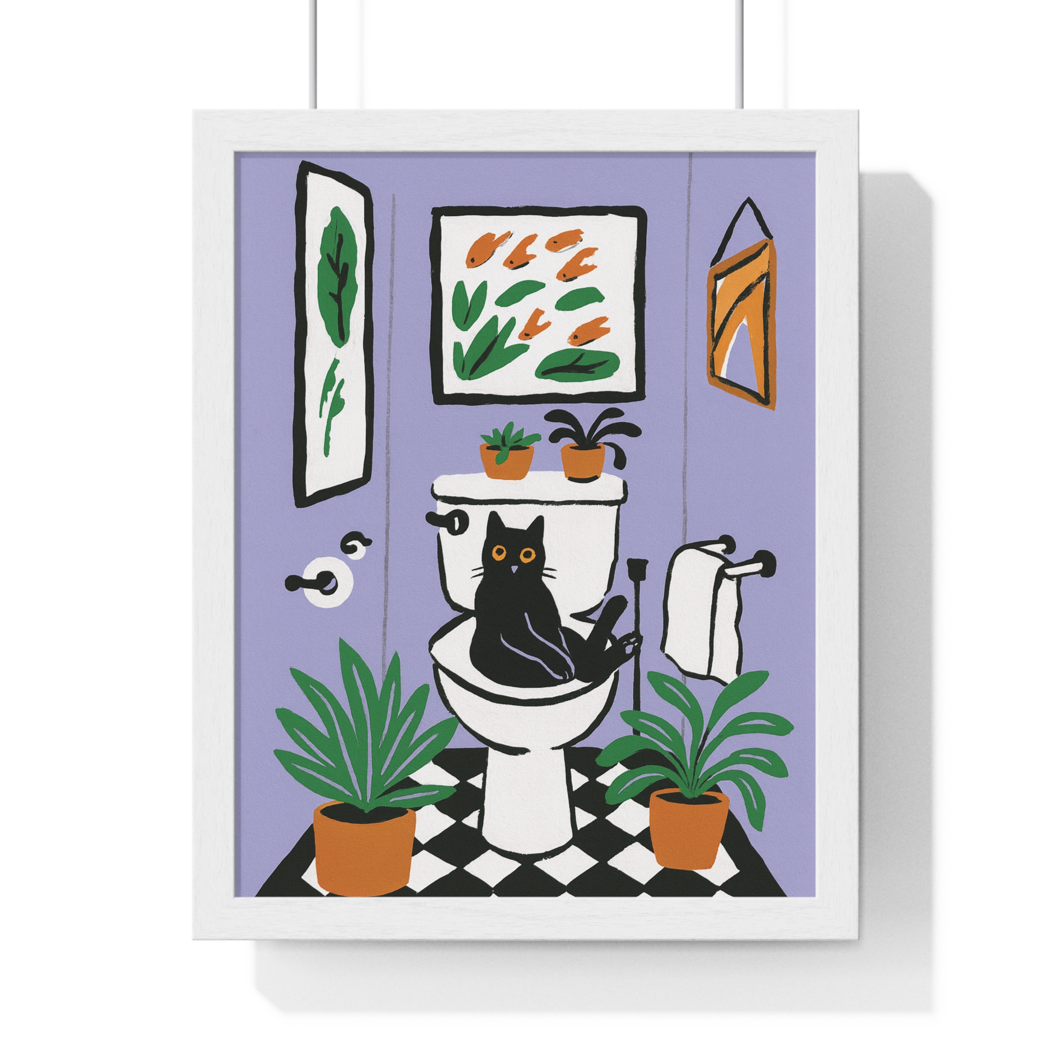 This vertical framed poster brings a playful, cozy moment into your home — a quirky black cat perched on a toilet amid leafy houseplants and framed art, rendered in bold pigment inks on matte museum-grade paper. The wooden frame and plexiglass give it a gallery-ready presence while the pre-installed hanging hardware makes it simple to add personality to a bathroom, hallway, or snug reading nook. Colors stay bright and true over time thanks to archival materials and pigment printing. It reads like a whimsical snapshot that invites a smile every time you pass by.