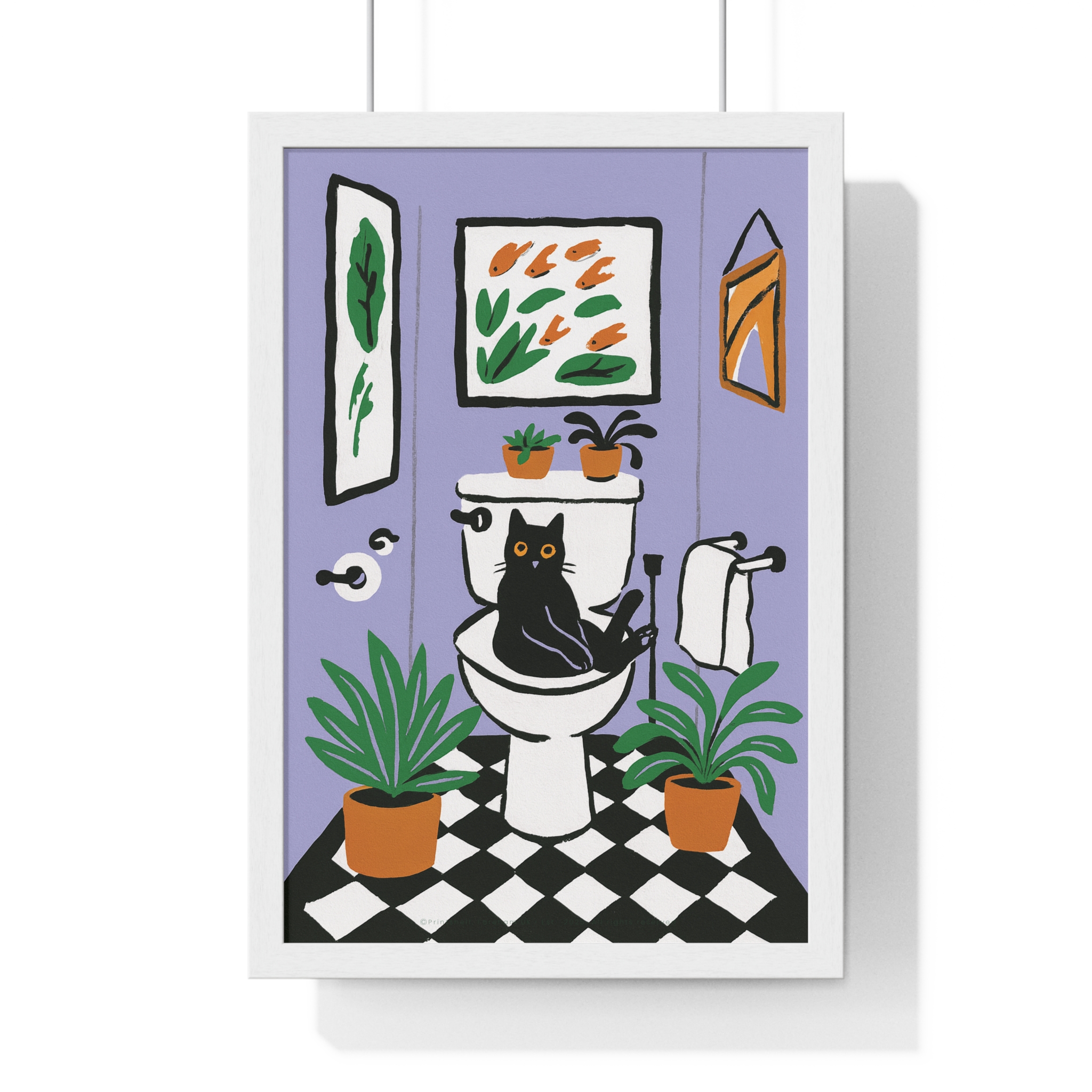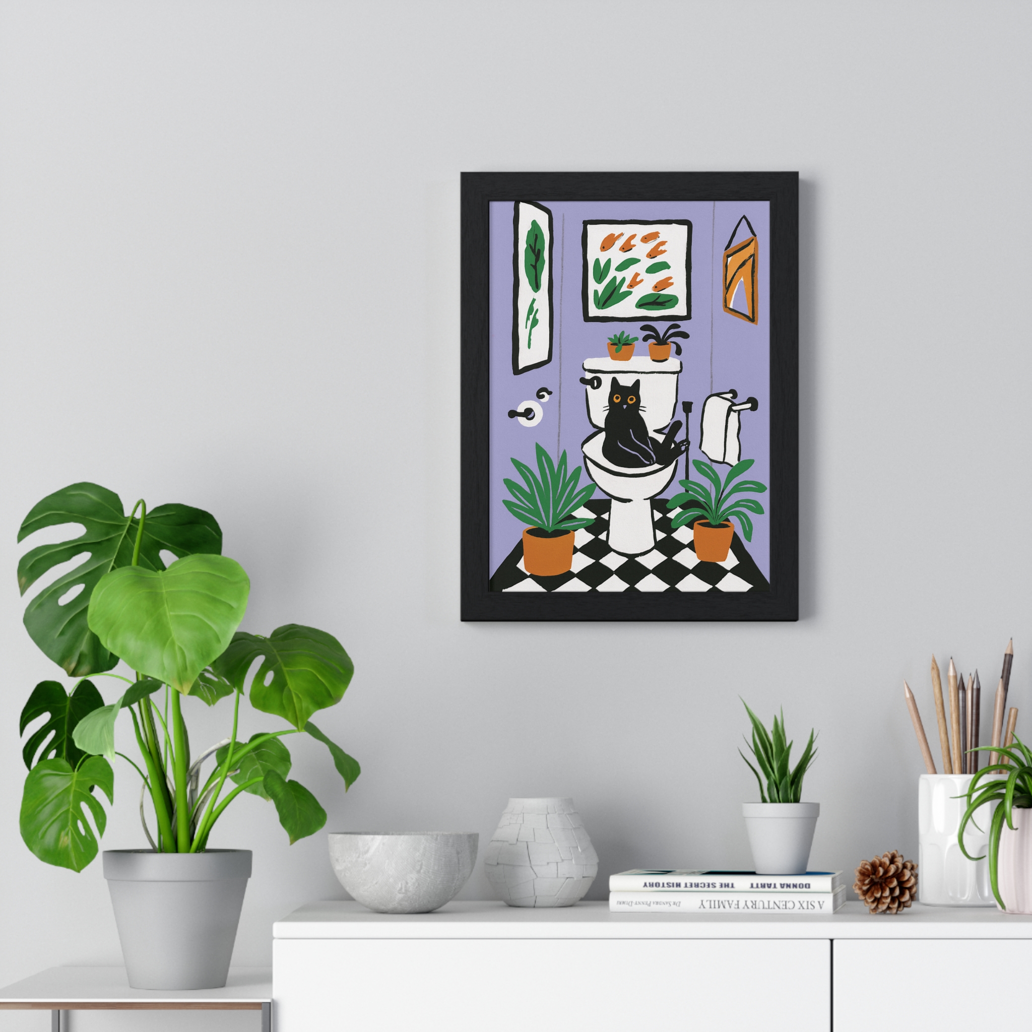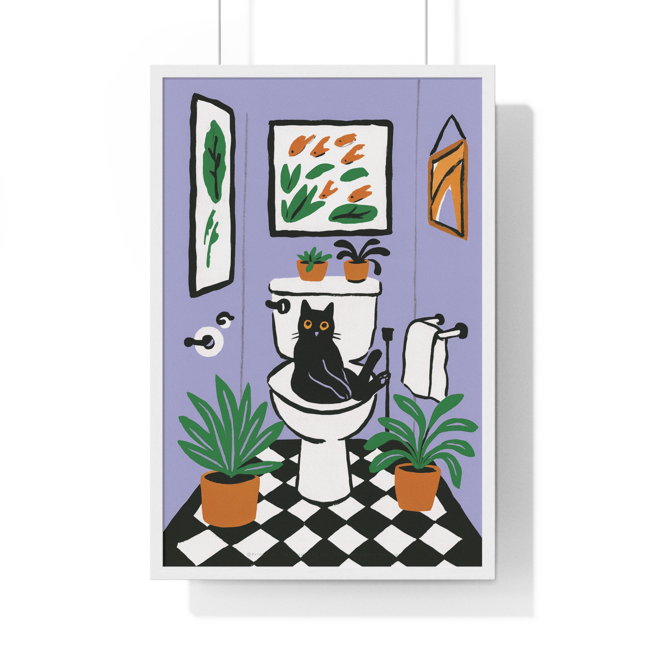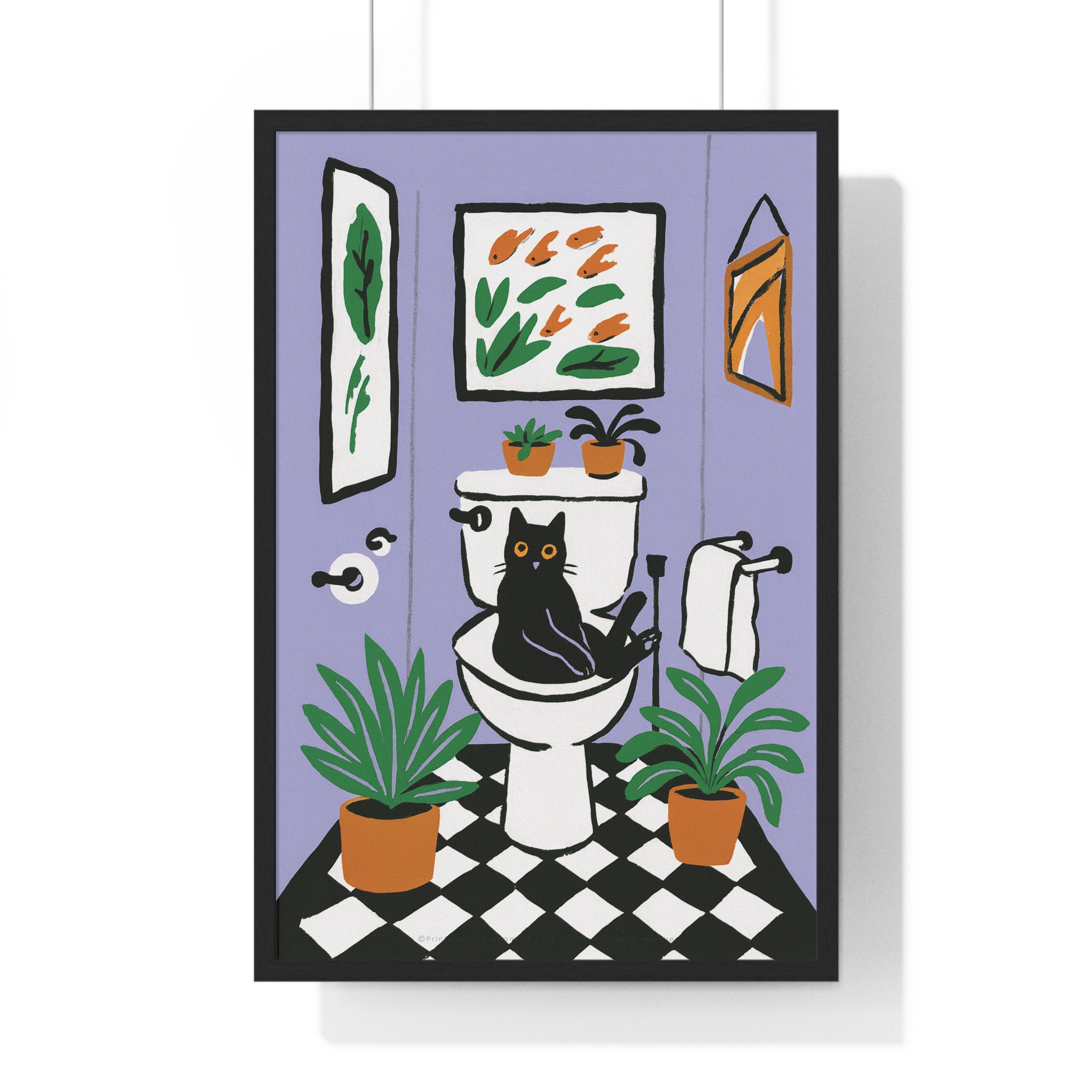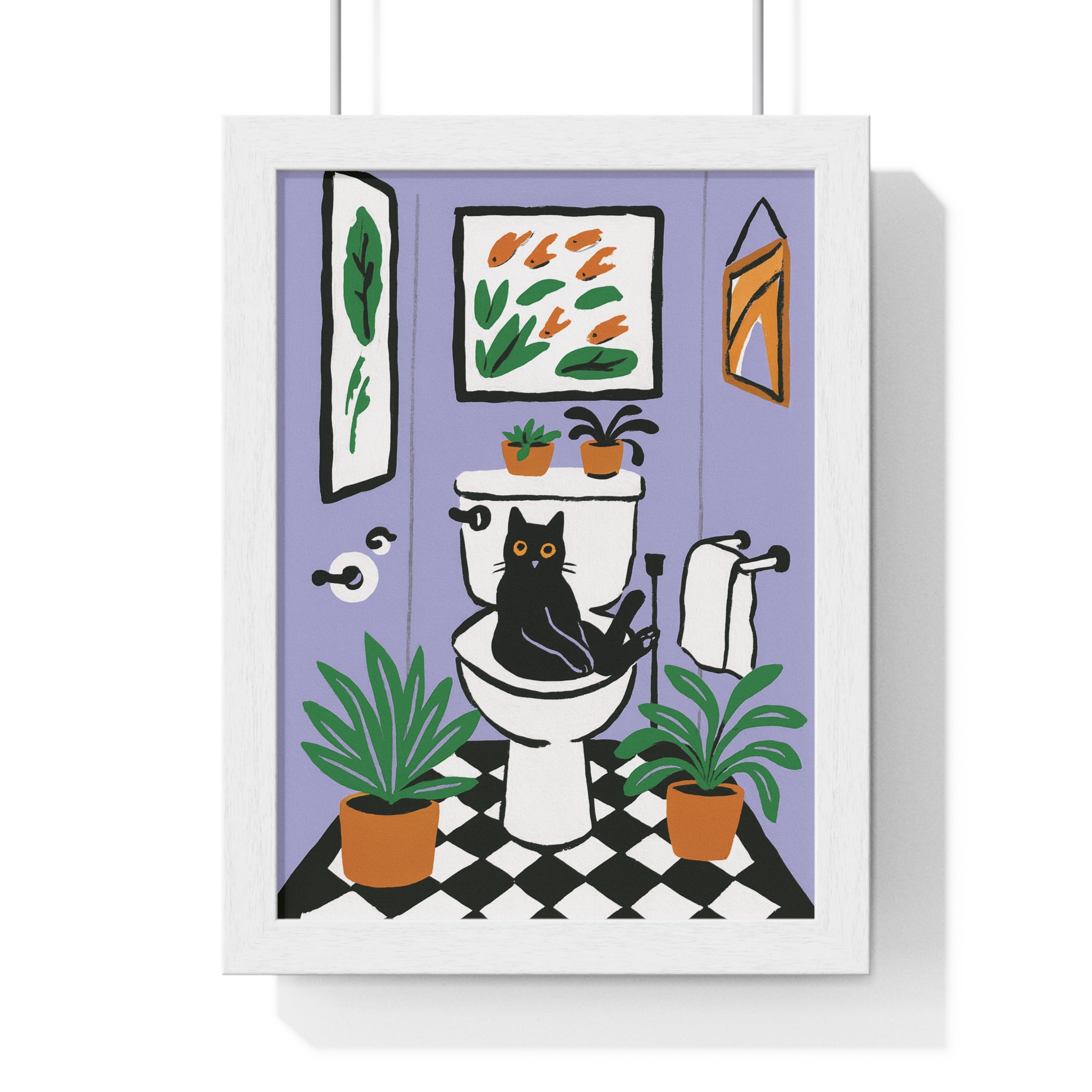 This vertical framed poster brings a playful, cozy moment into your home — a quirky black cat perched on a toilet amid leafy houseplants and framed art, rendered in bold pigment inks on matte museum-grade paper. The wooden frame and plexiglass give it a gallery-ready presence while the pre-installed hanging hardware makes it simple to add personality to a bathroom, hallway, or snug reading nook. Colors stay bright and true over time thanks to archival materials and pigment printing. It reads like a whimsical snapshot that invites a smile every time you pass by.