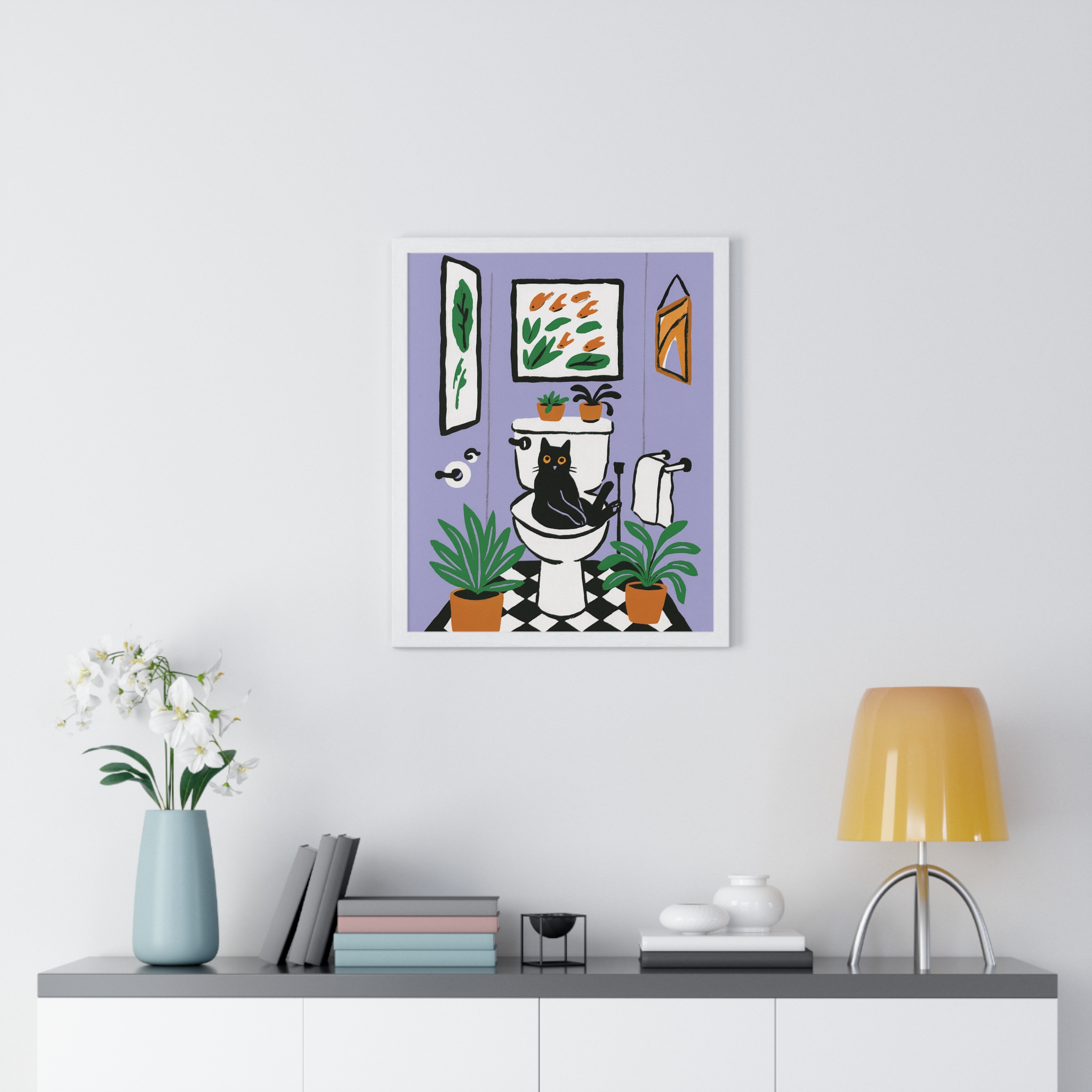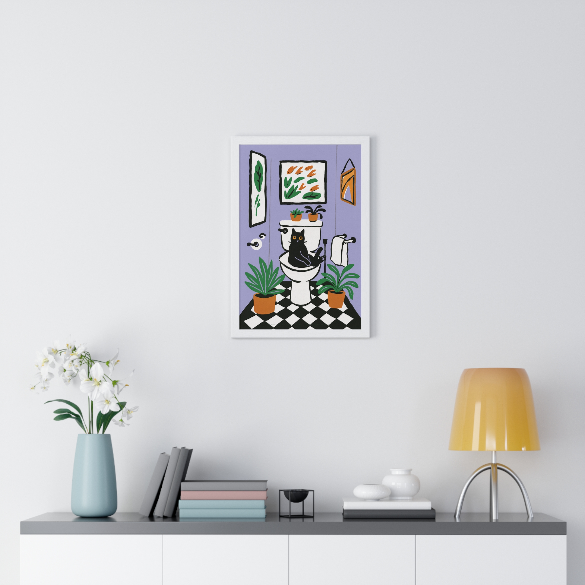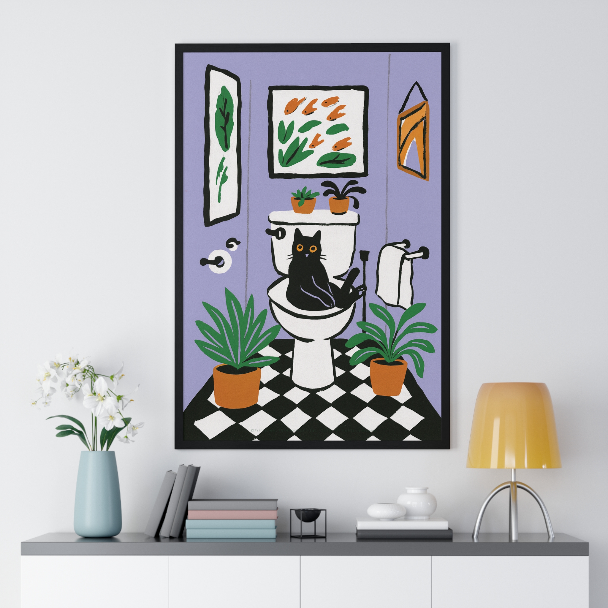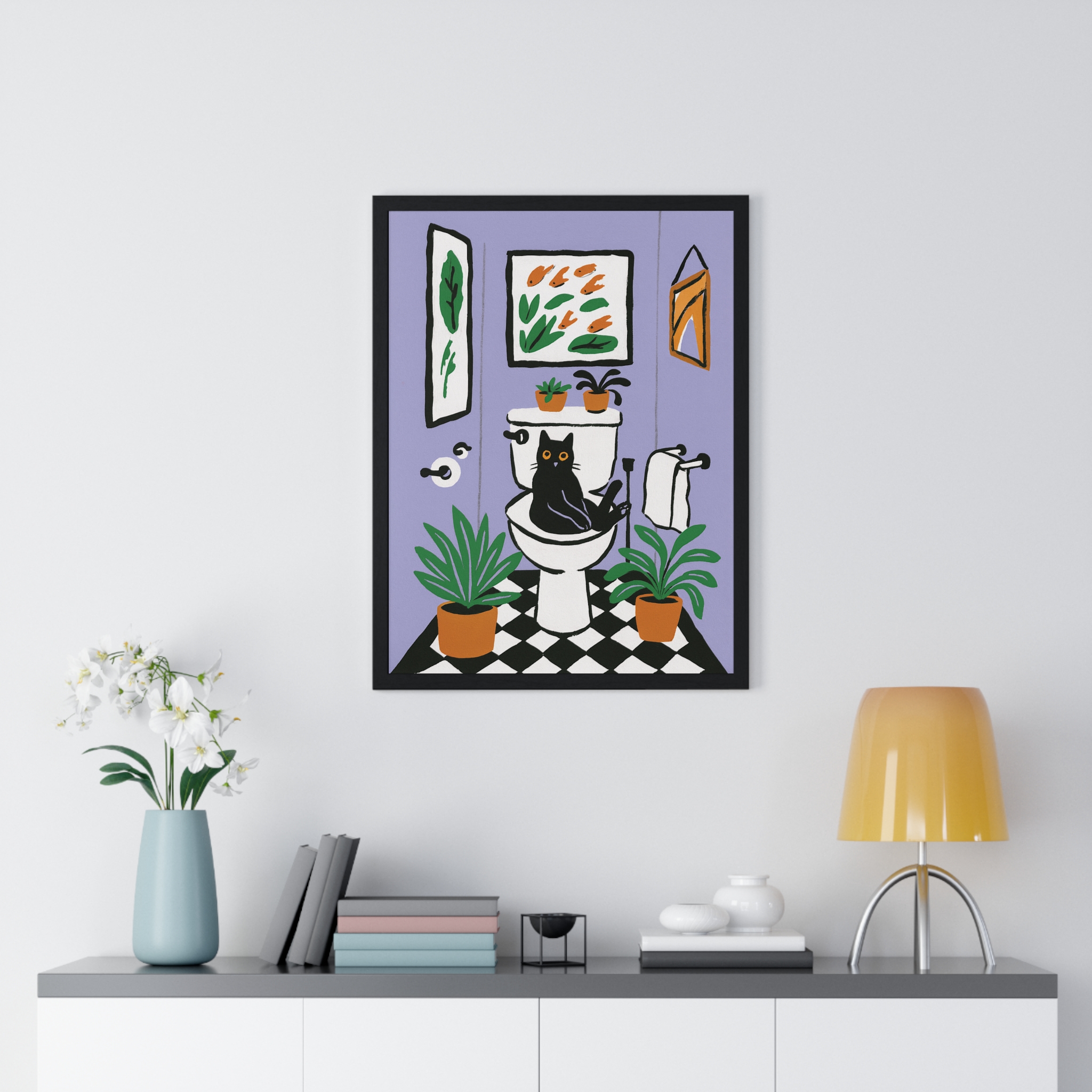 This vertical framed poster brings a playful, cozy moment into your home — a quirky black cat perched on a toilet amid leafy houseplants and framed art, rendered in bold pigment inks on matte museum-grade paper. The wooden frame and plexiglass give it a gallery-ready presence while the pre-installed hanging hardware makes it simple to add personality to a bathroom, hallway, or snug reading nook. Colors stay bright and true over time thanks to archival materials and pigment printing. It reads like a whimsical snapshot that invites a smile every time you pass by.