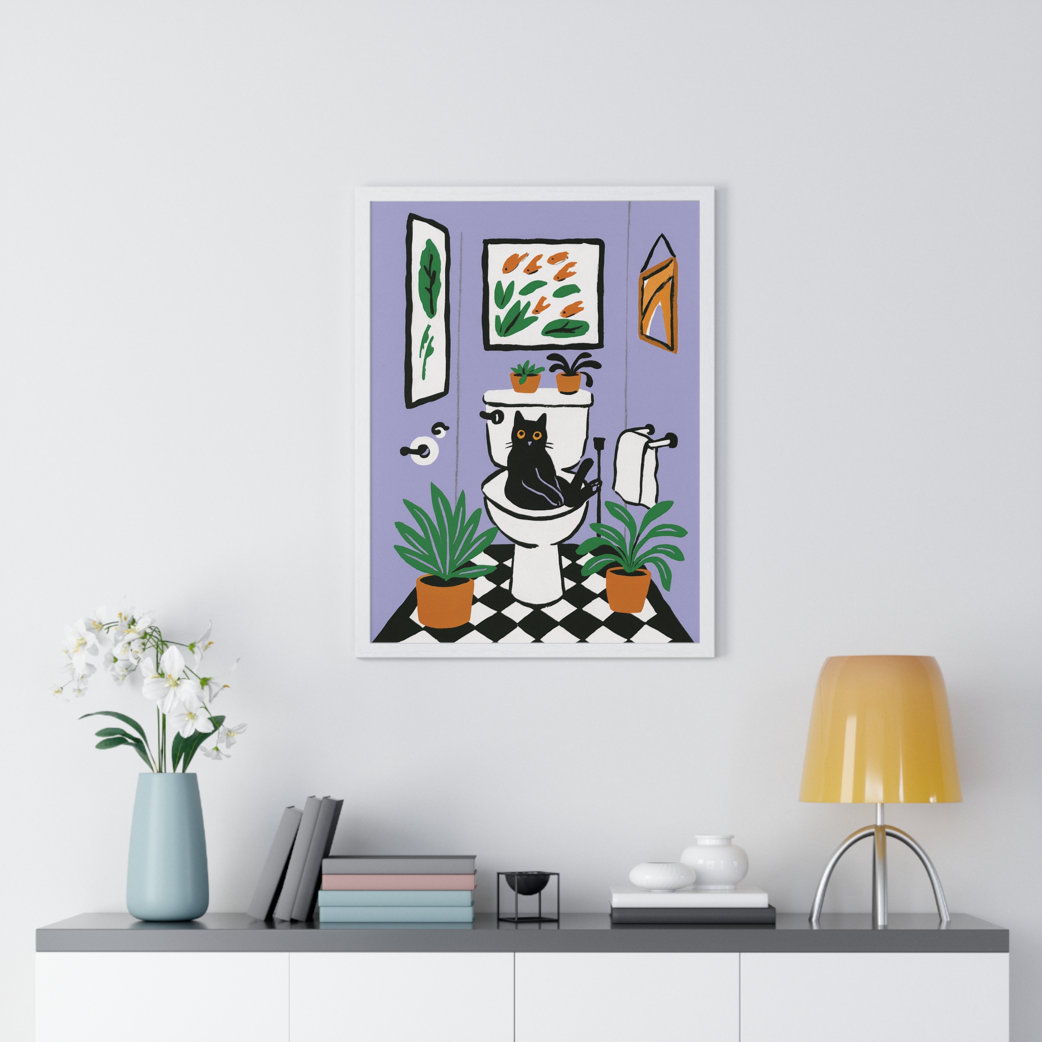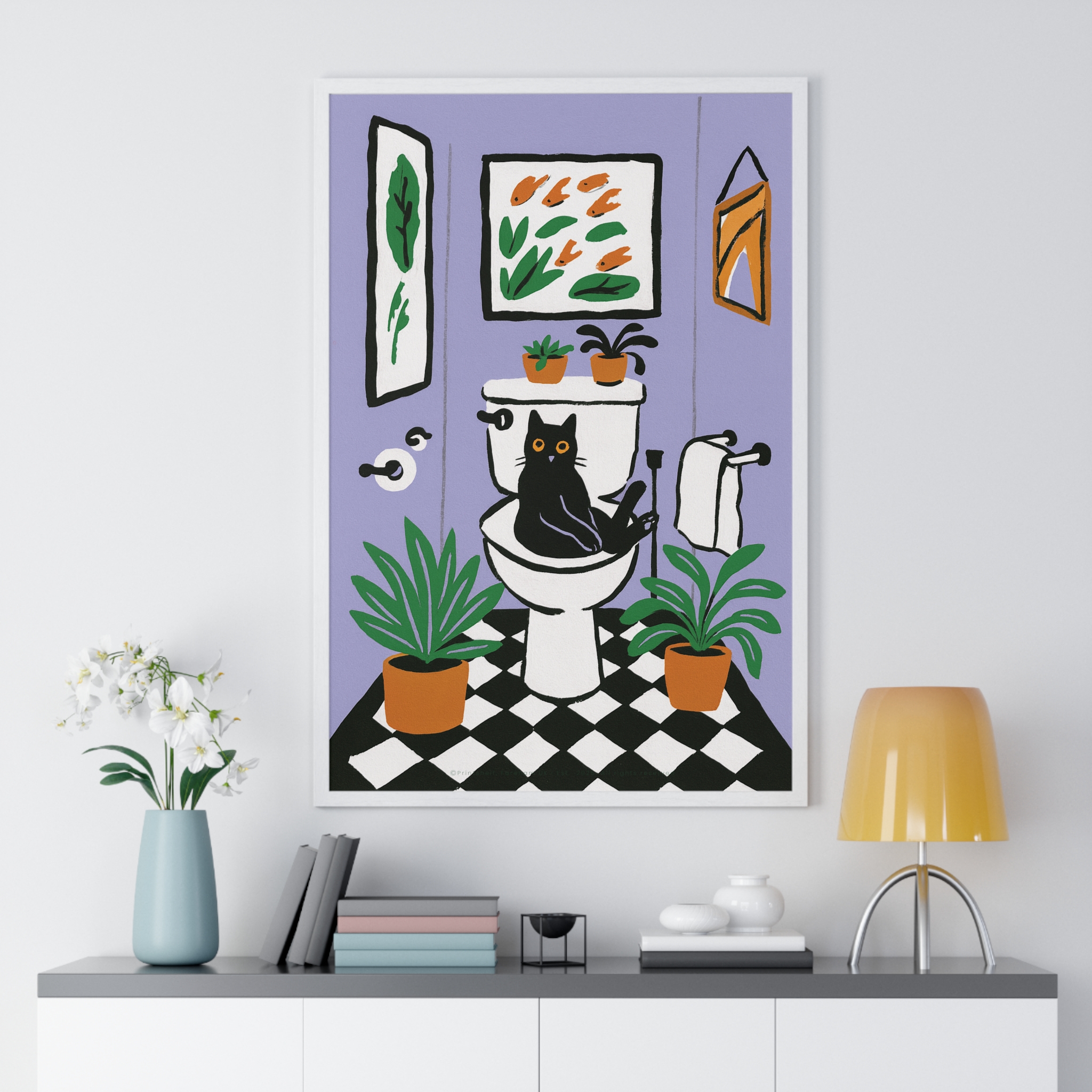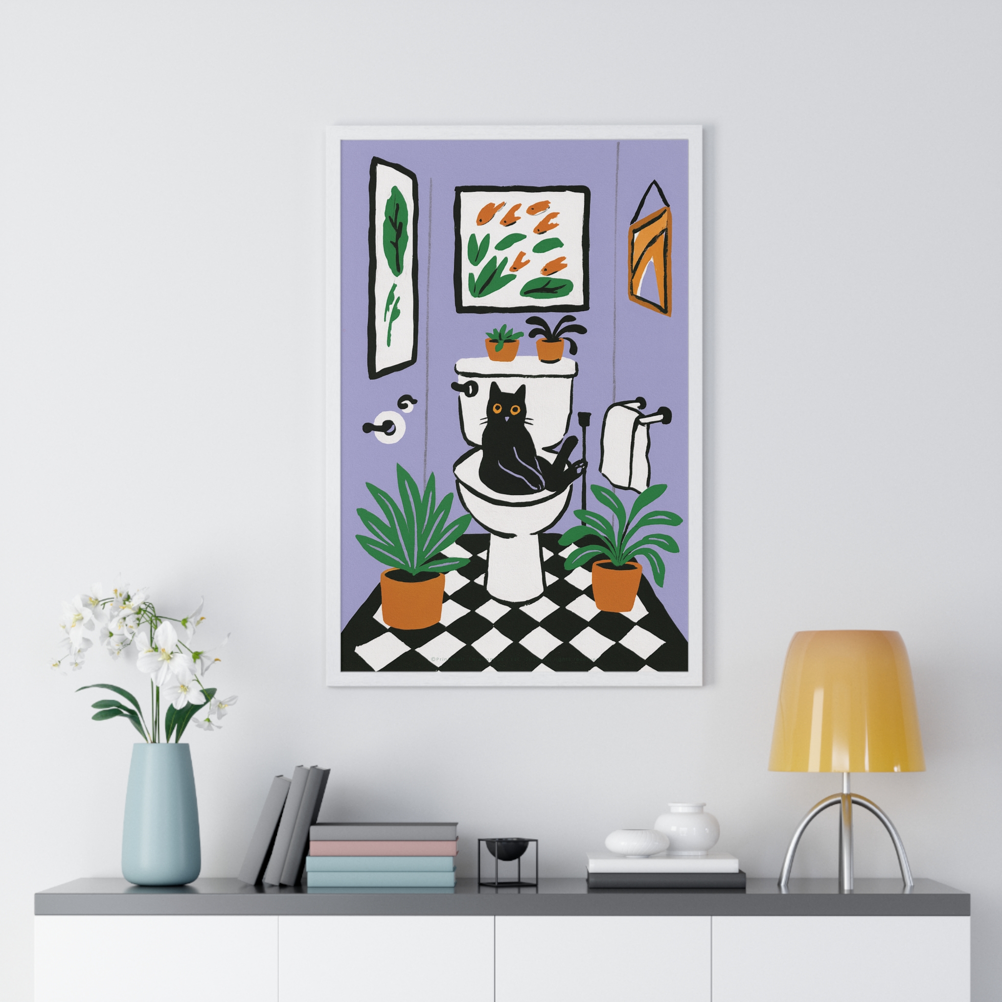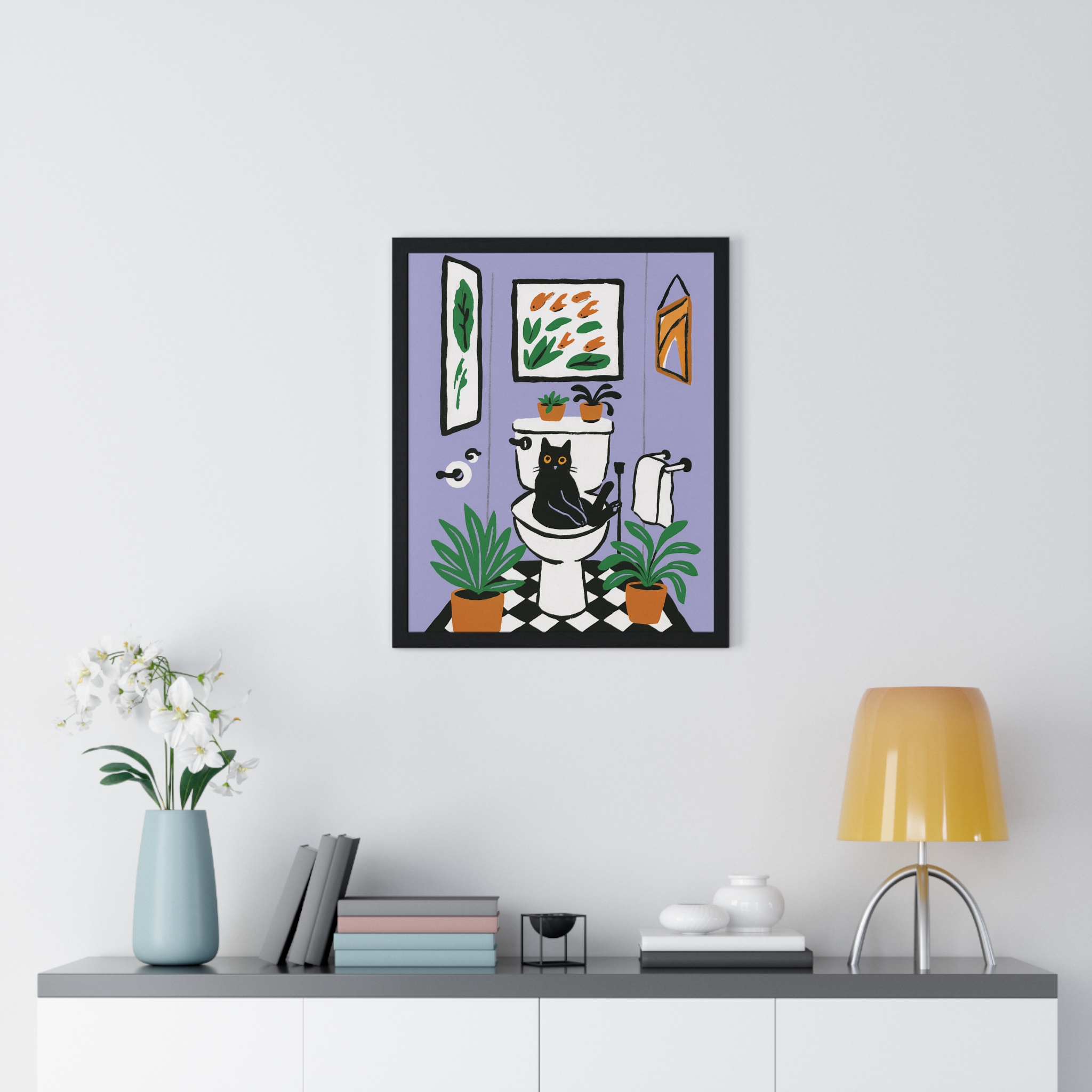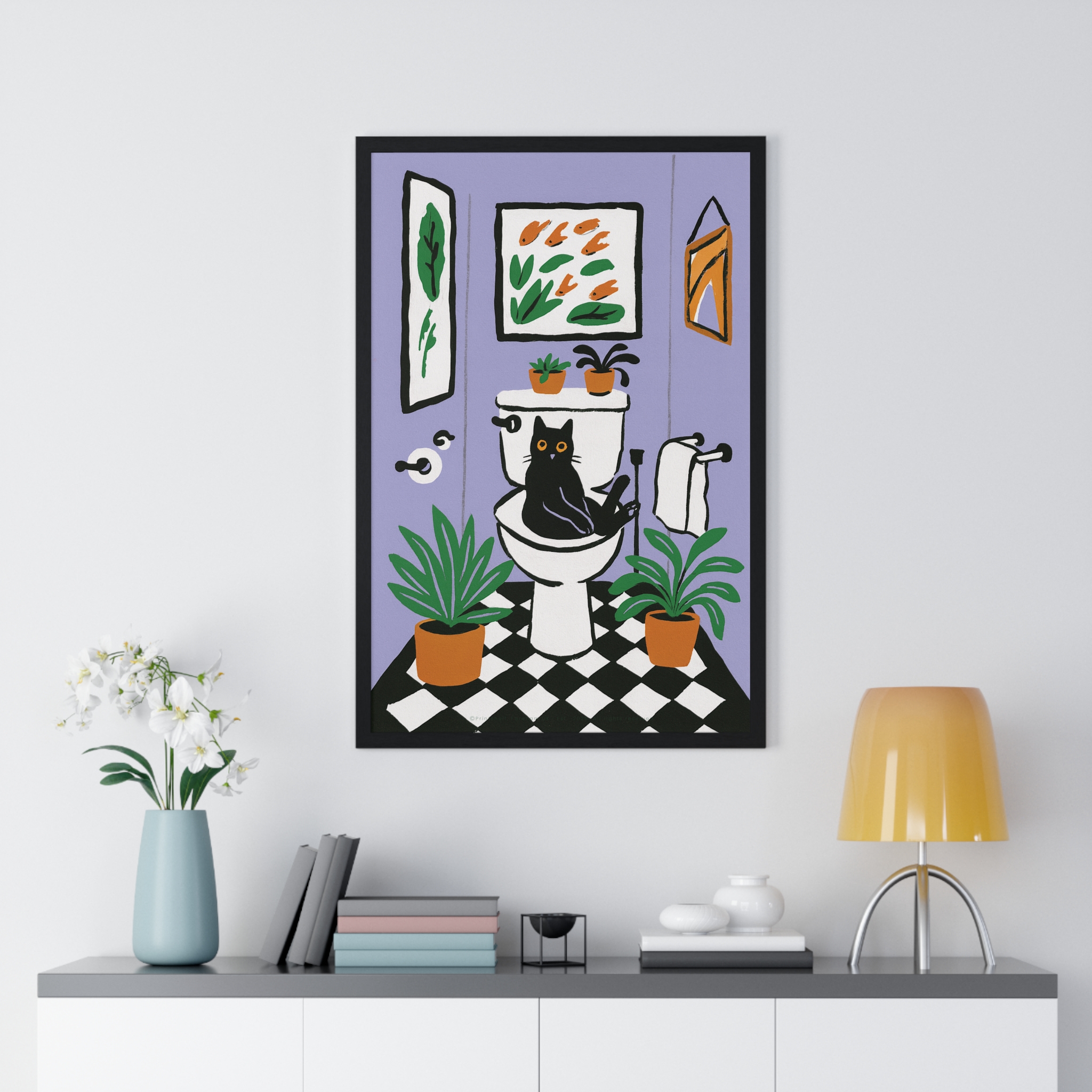 This vertical framed poster brings a playful, cozy moment into your home — a quirky black cat perched on a toilet amid leafy houseplants and framed art, rendered in bold pigment inks on matte museum-grade paper. The wooden frame and plexiglass give it a gallery-ready presence while the pre-installed hanging hardware makes it simple to add personality to a bathroom, hallway, or snug reading nook. Colors stay bright and true over time thanks to archival materials and pigment printing. It reads like a whimsical snapshot that invites a smile every time you pass by.