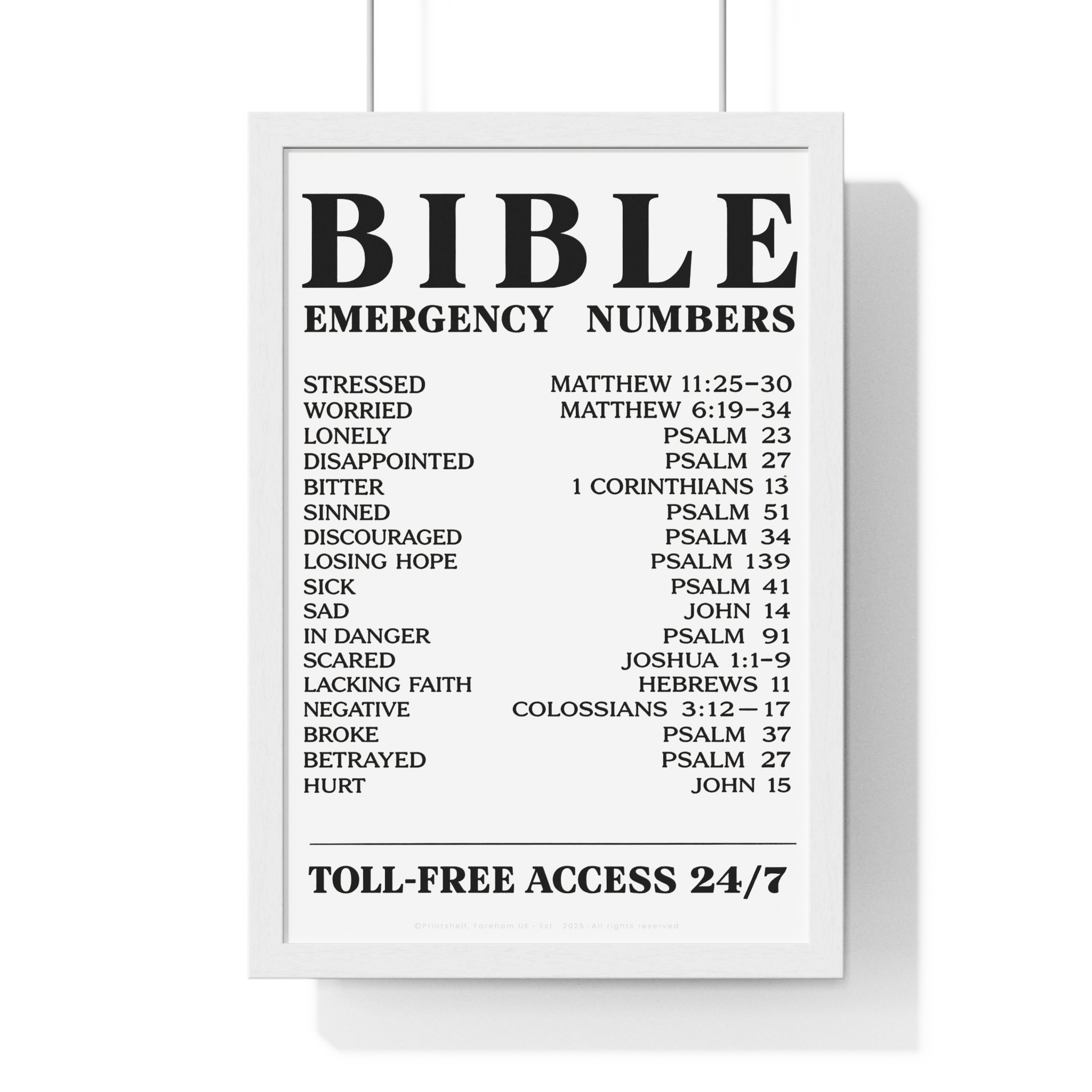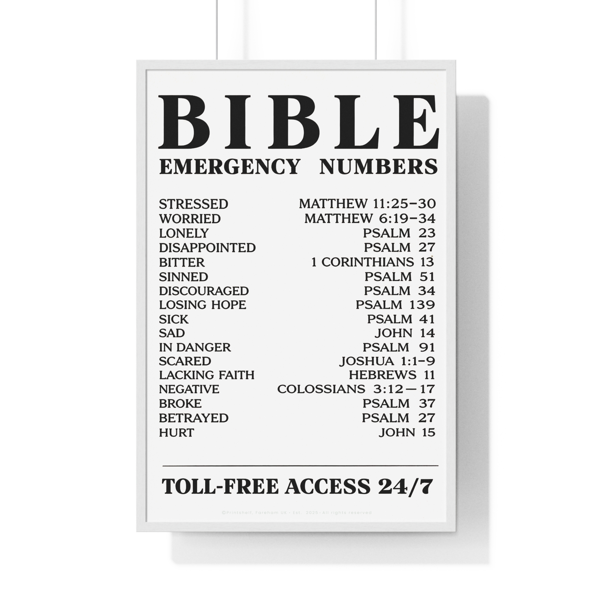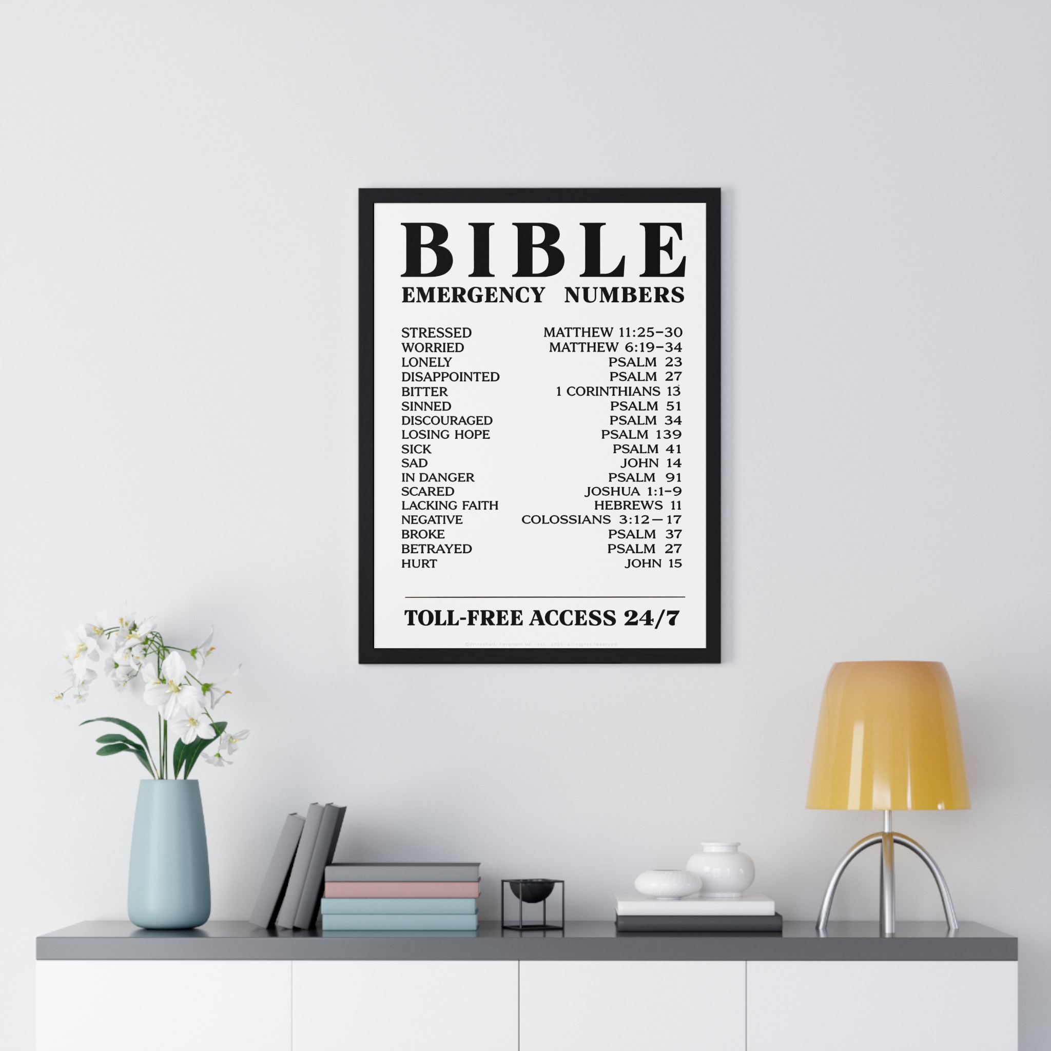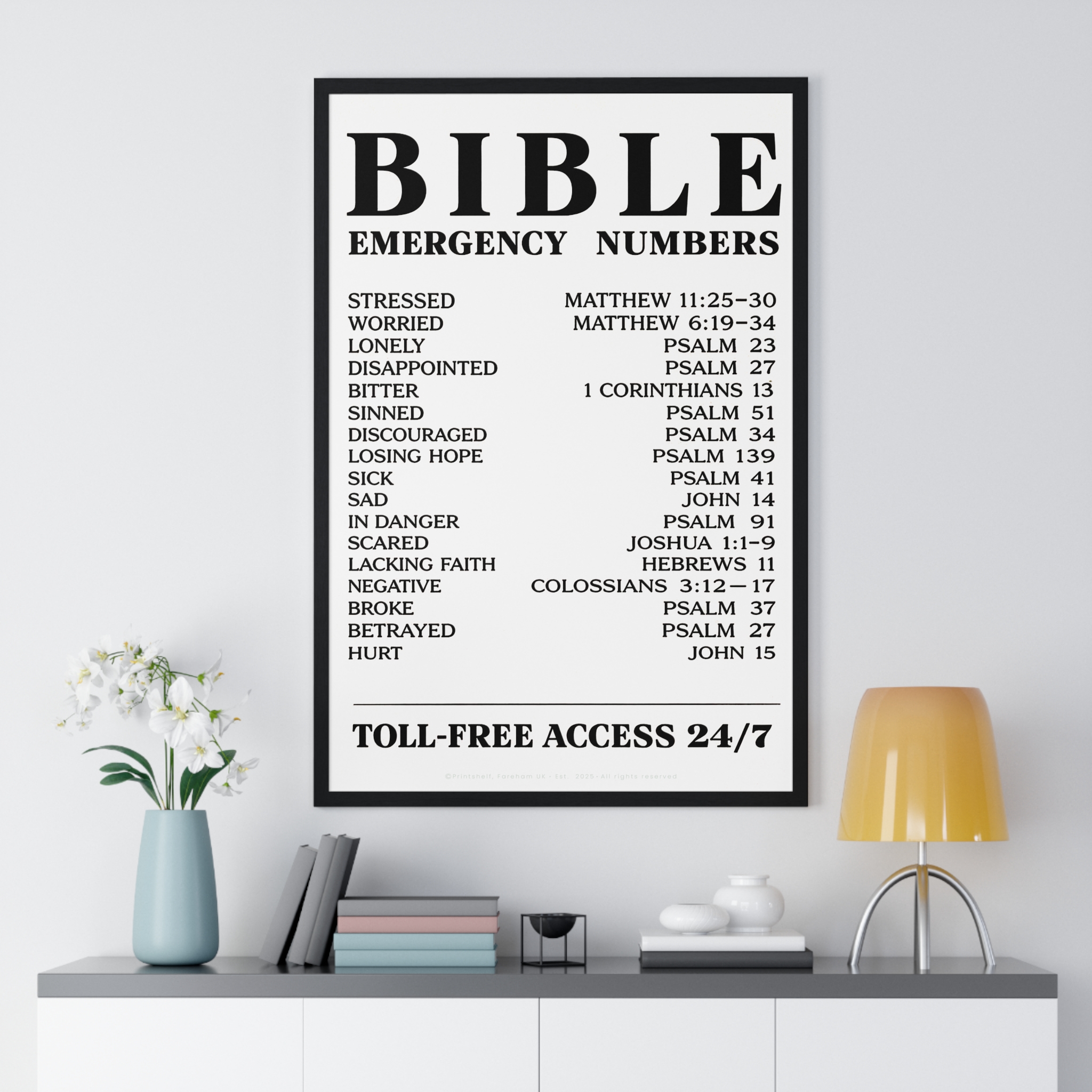 Be the first to review “Bible Emergency Numbers Poster — Framed Inspirational Scripture Wall Art”