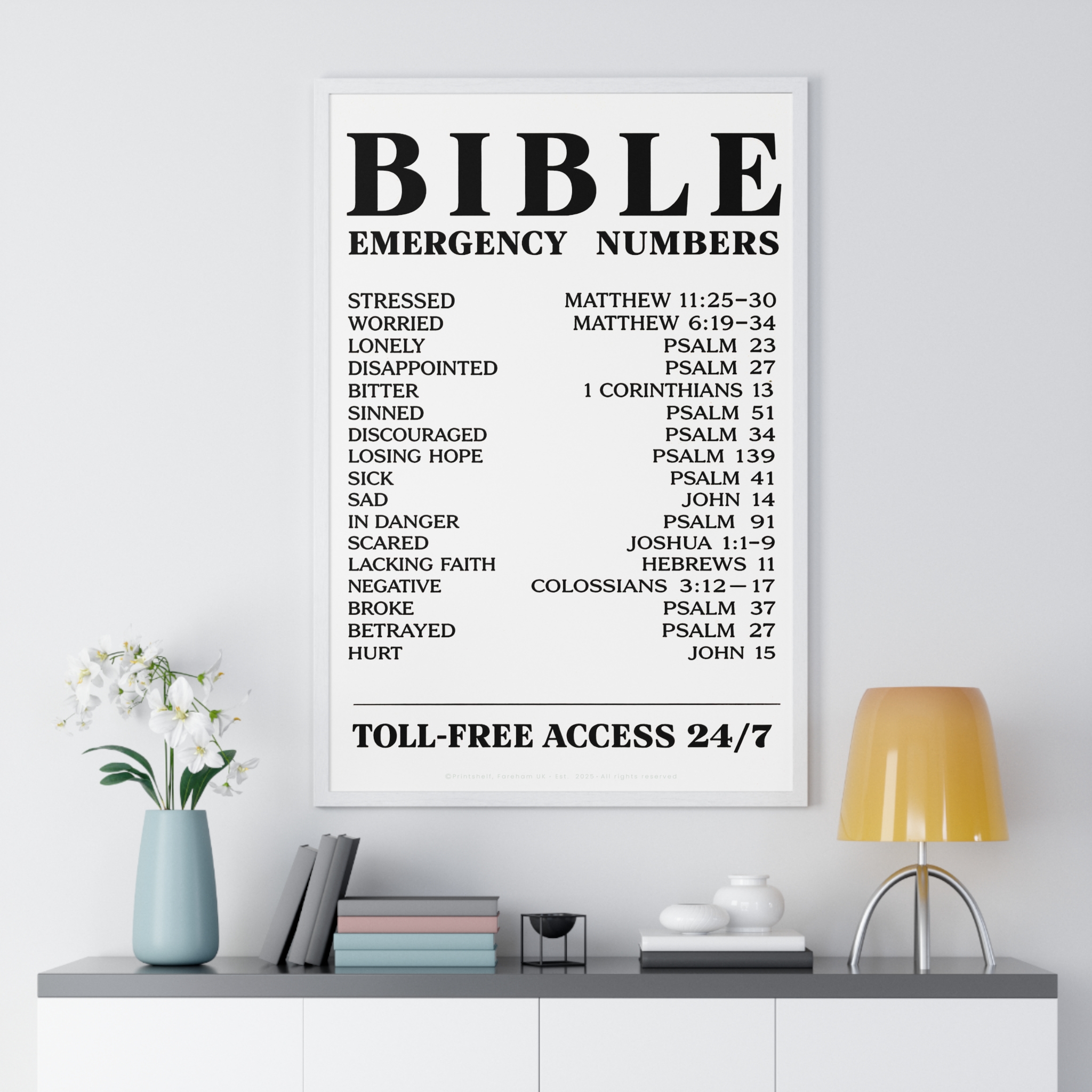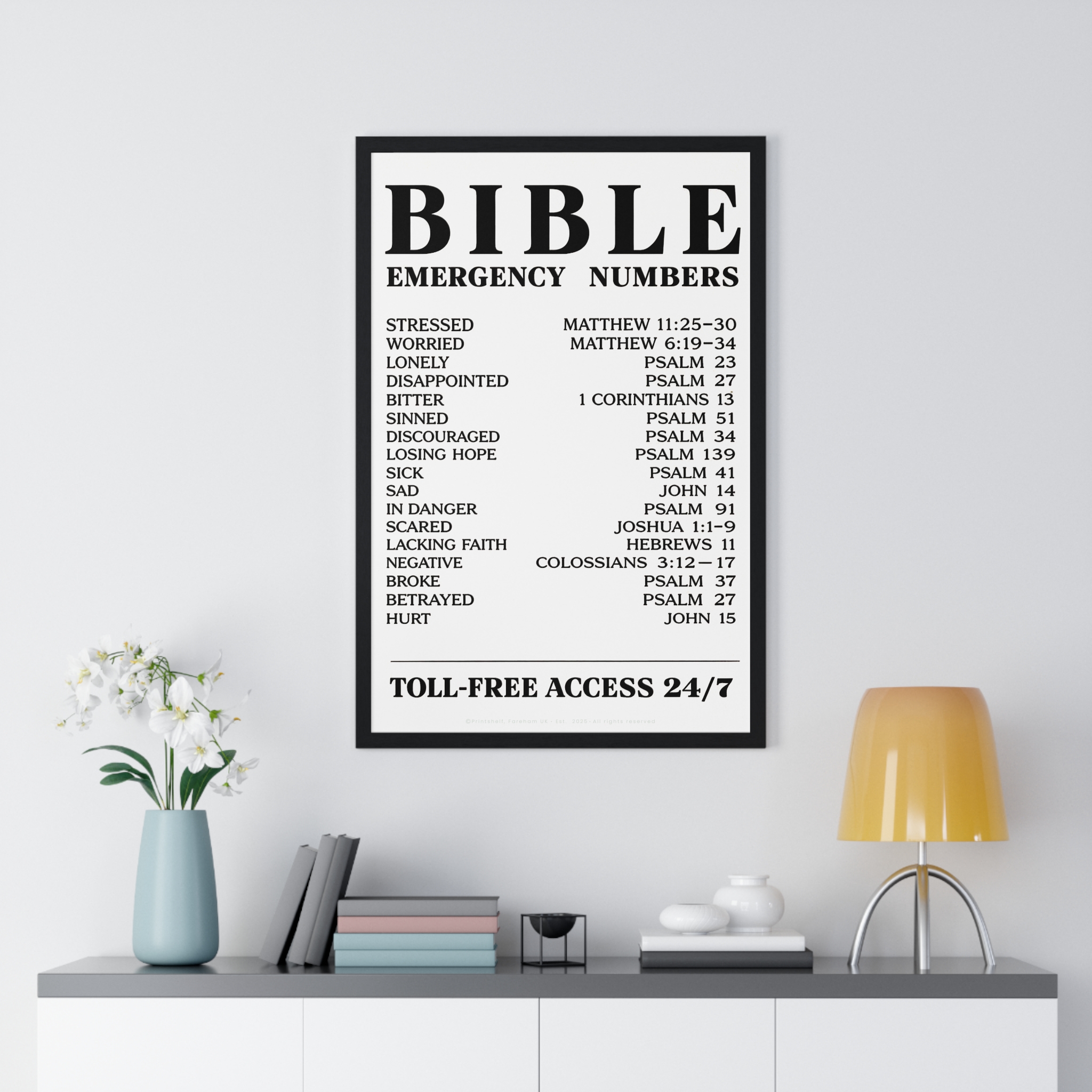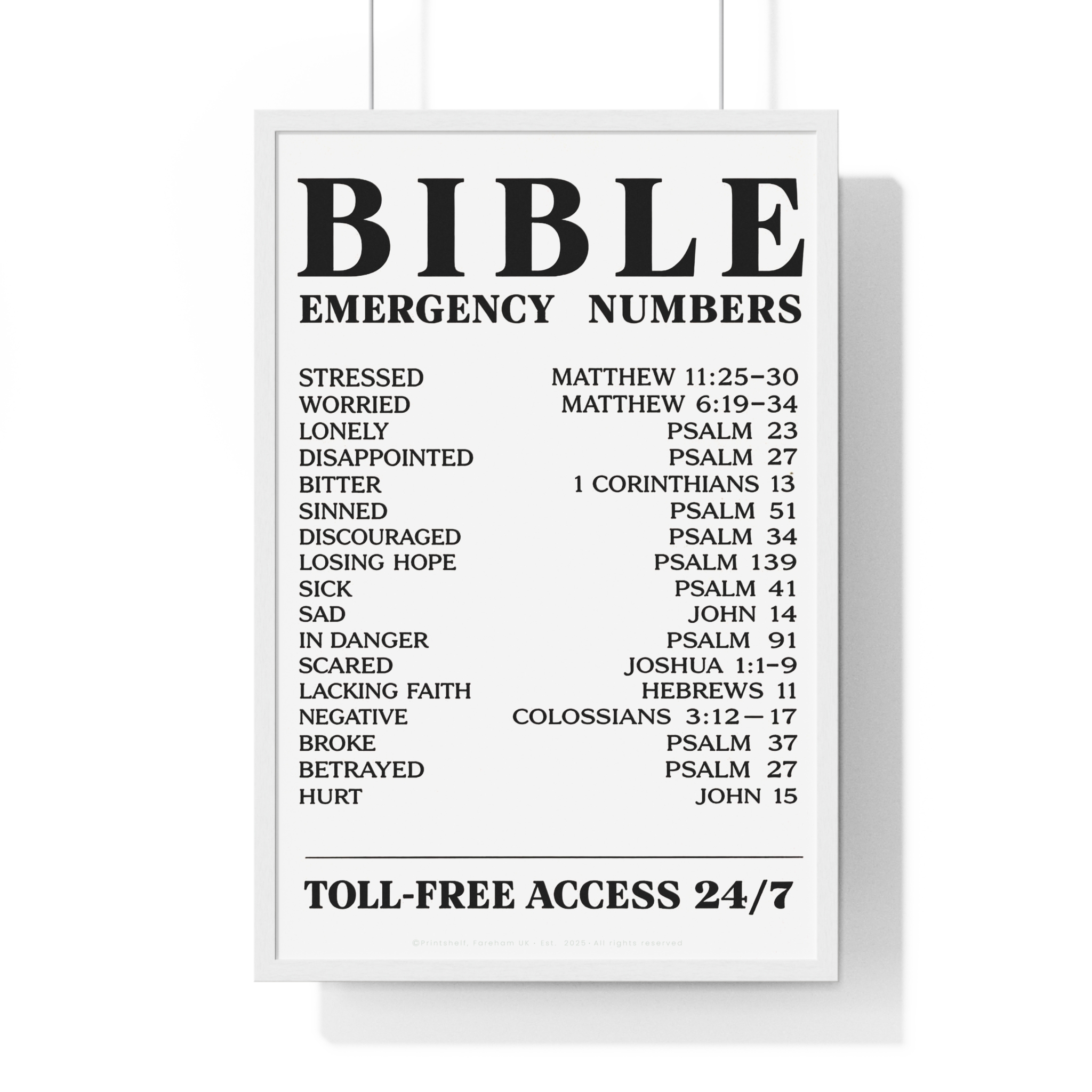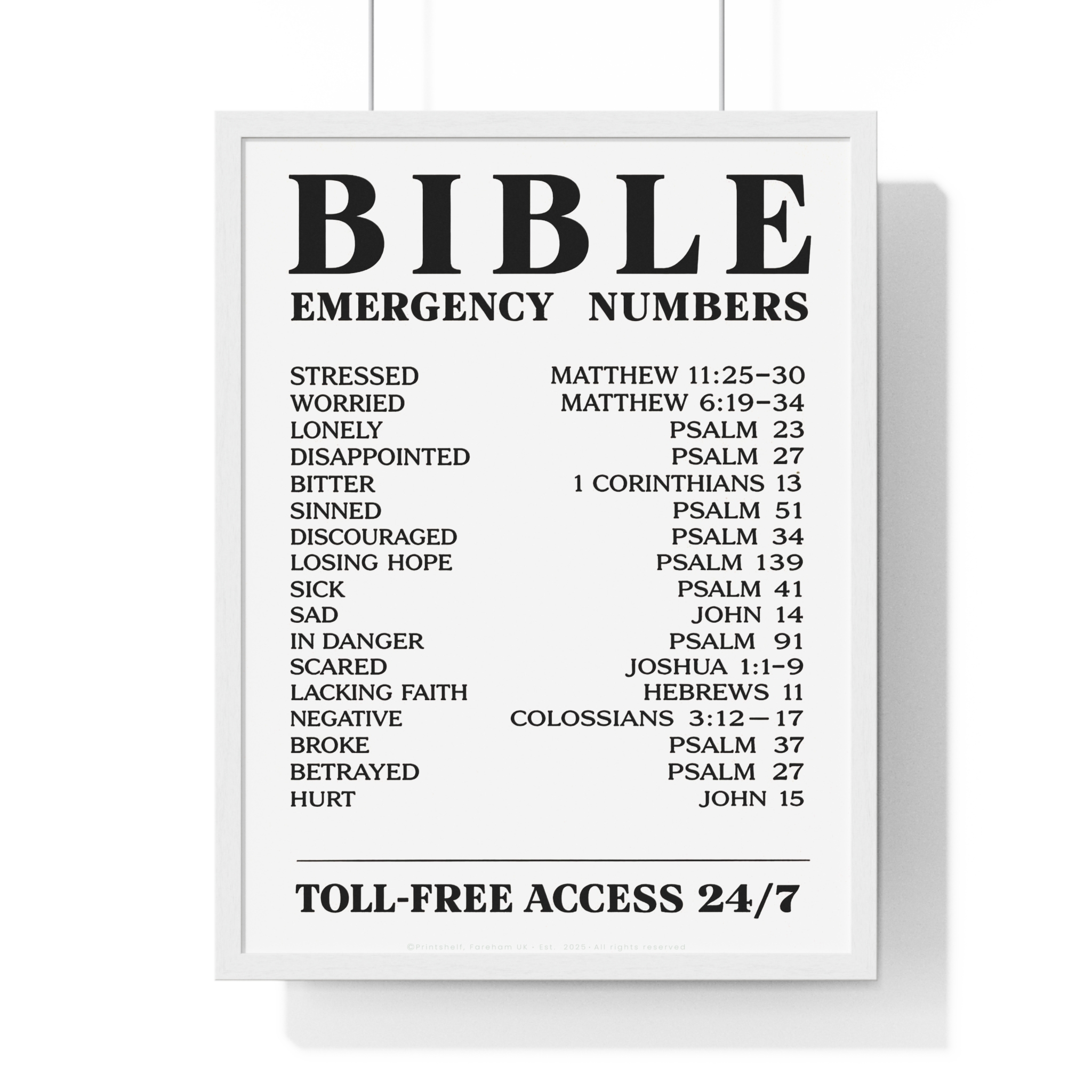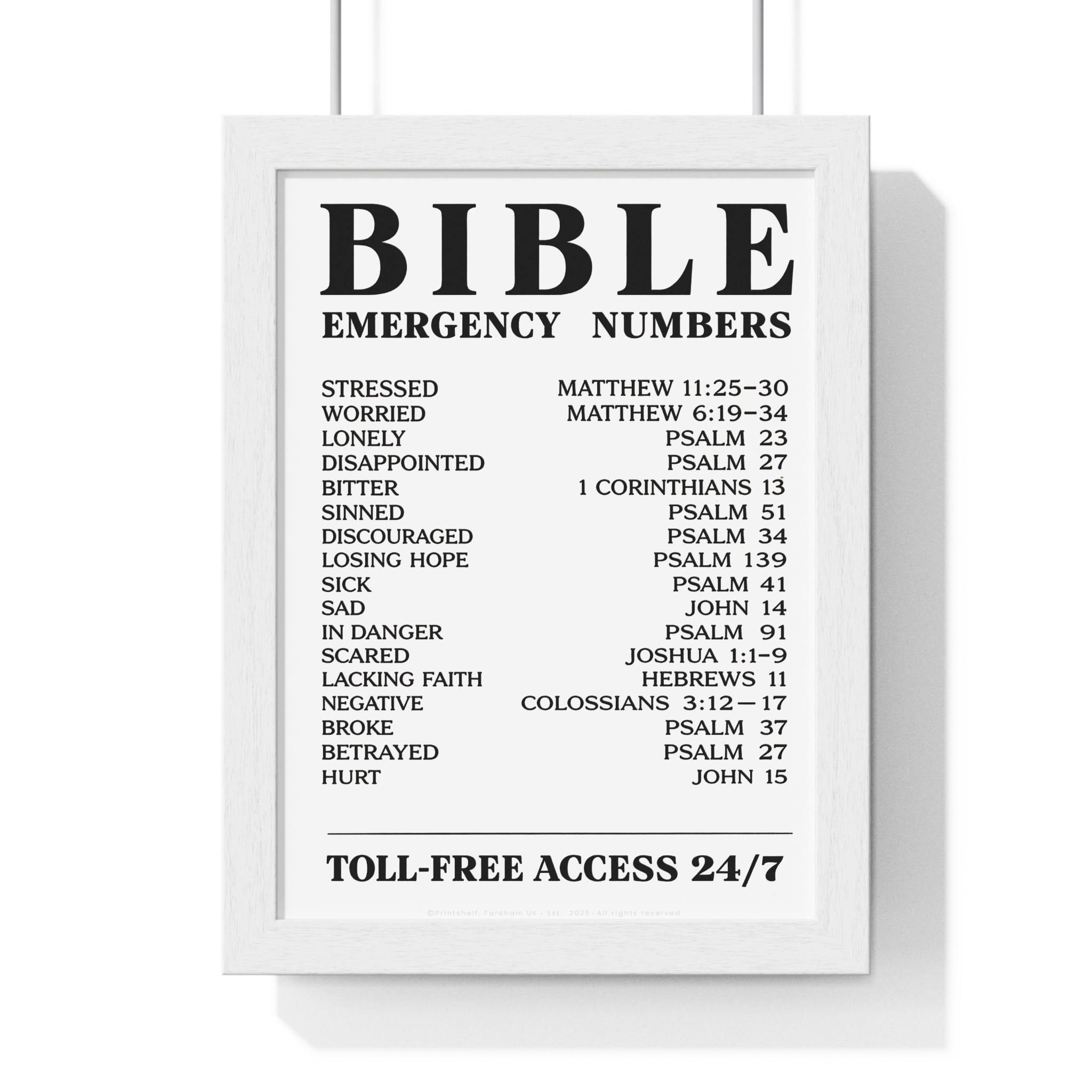 Be the first to review “Bible Emergency Numbers Poster — Framed Inspirational Scripture Wall Art”