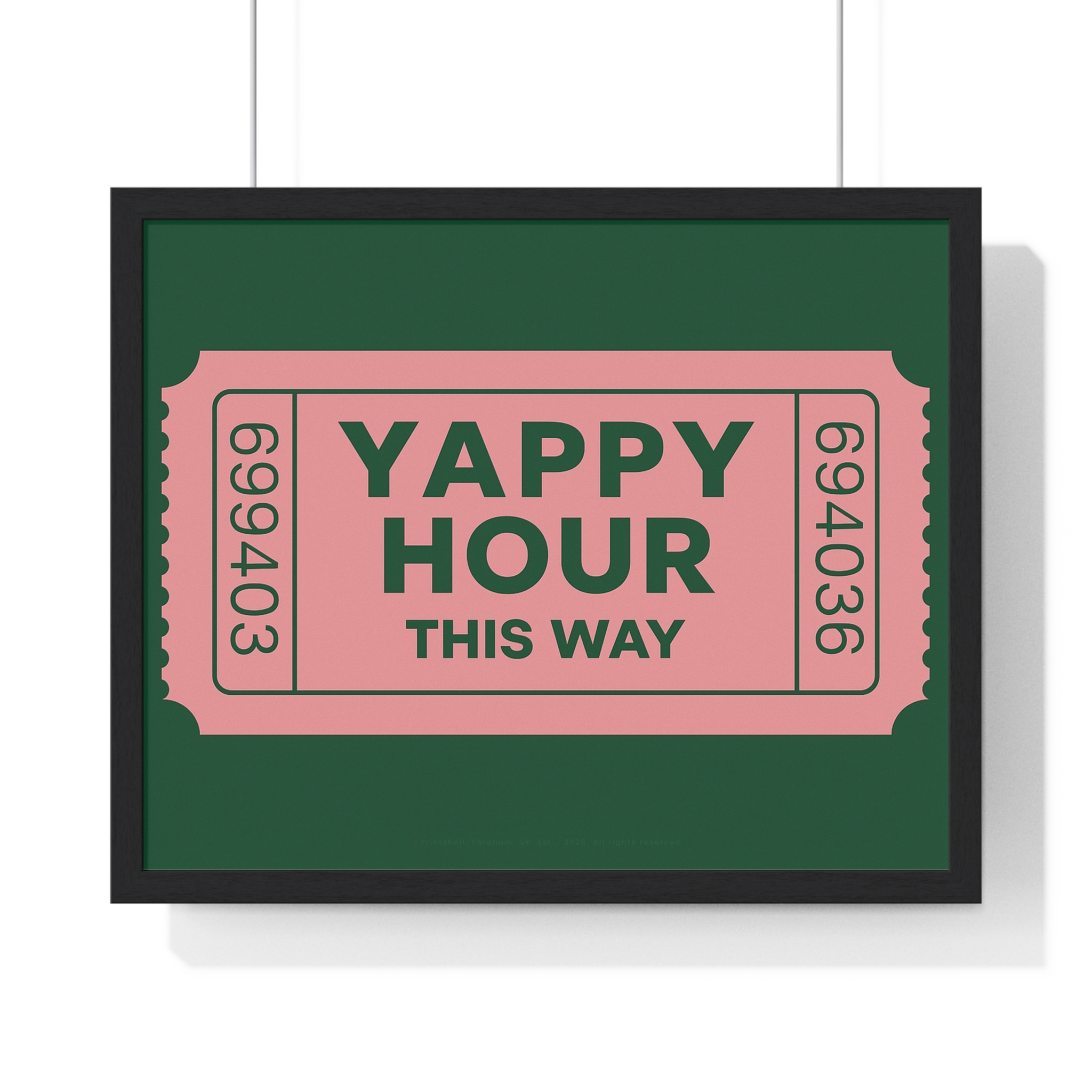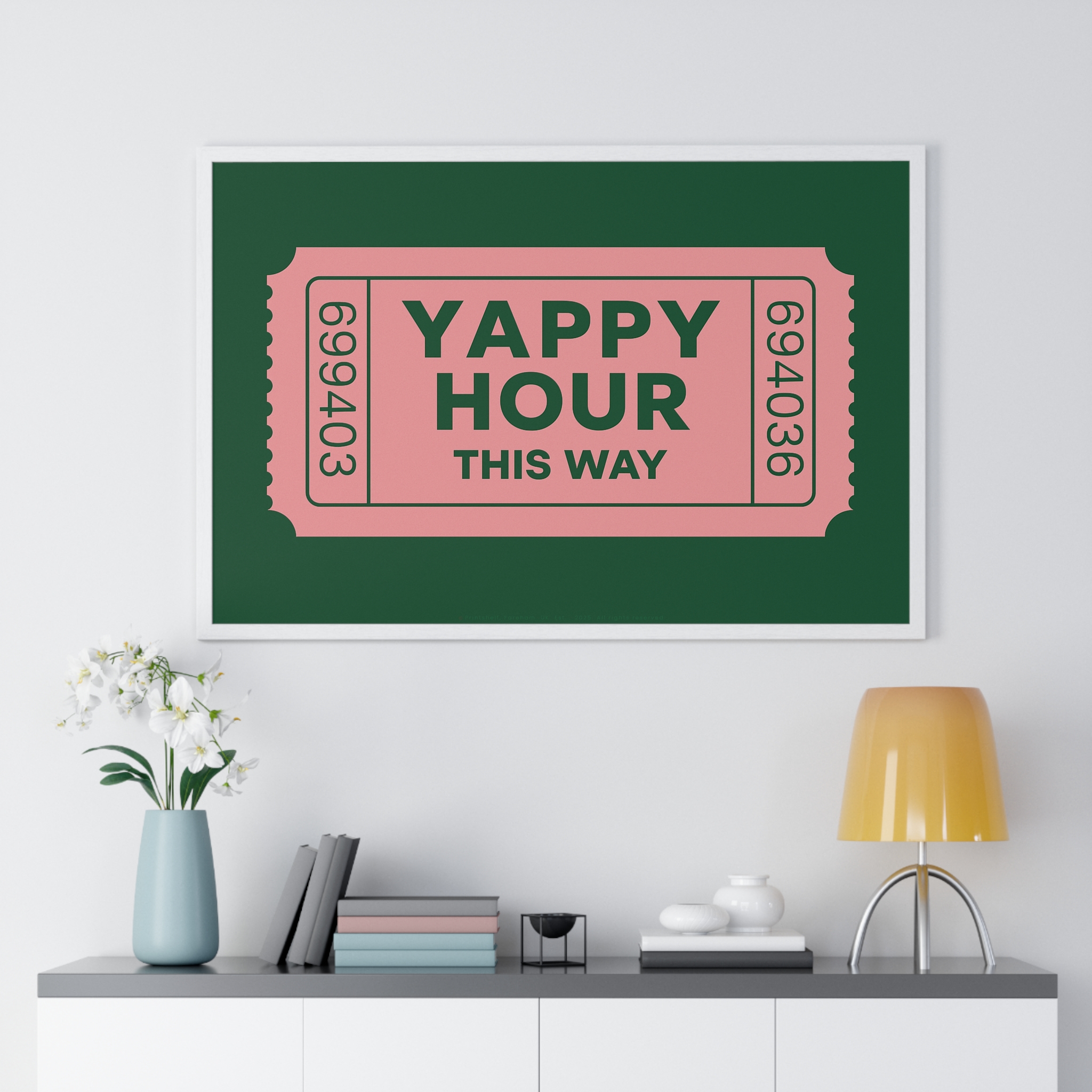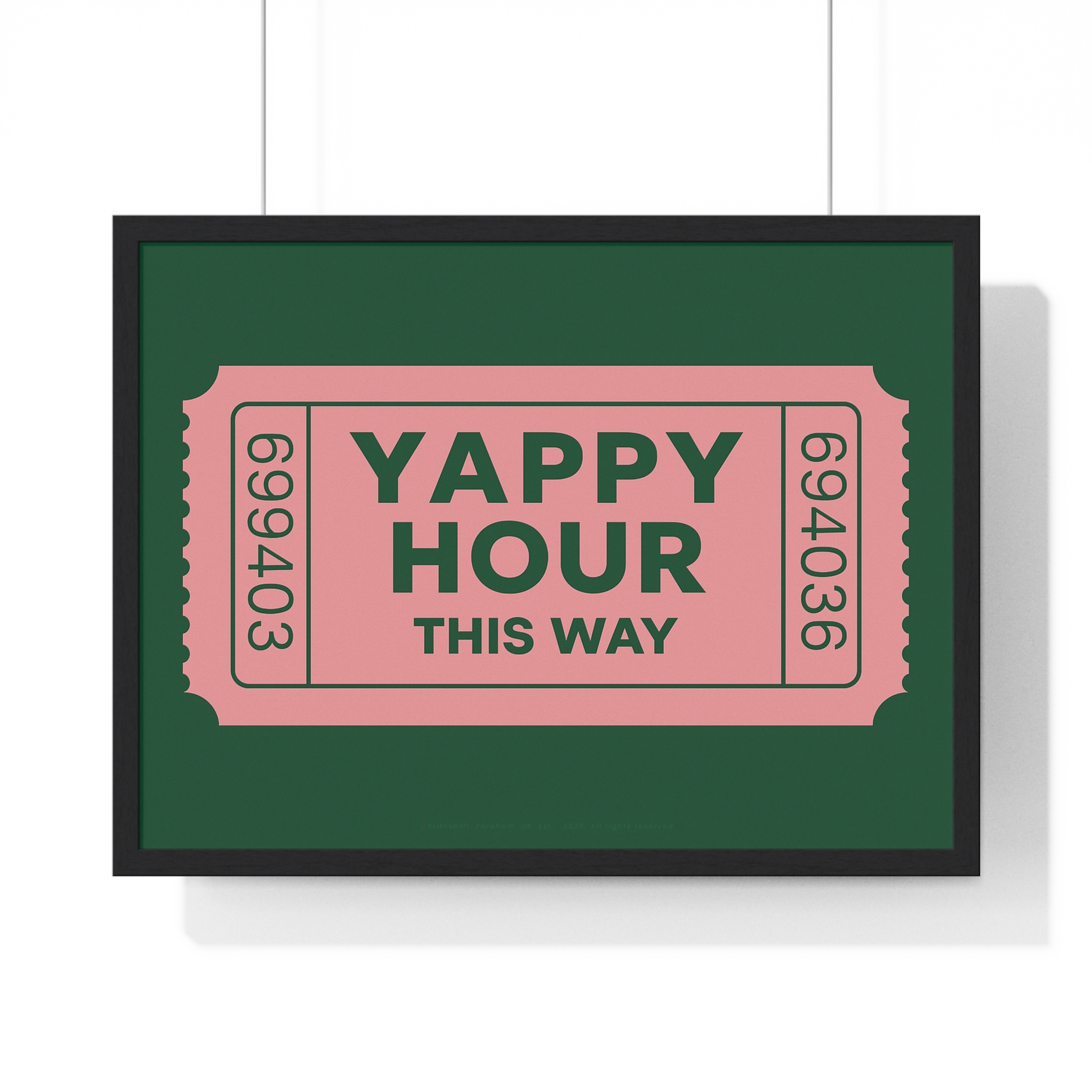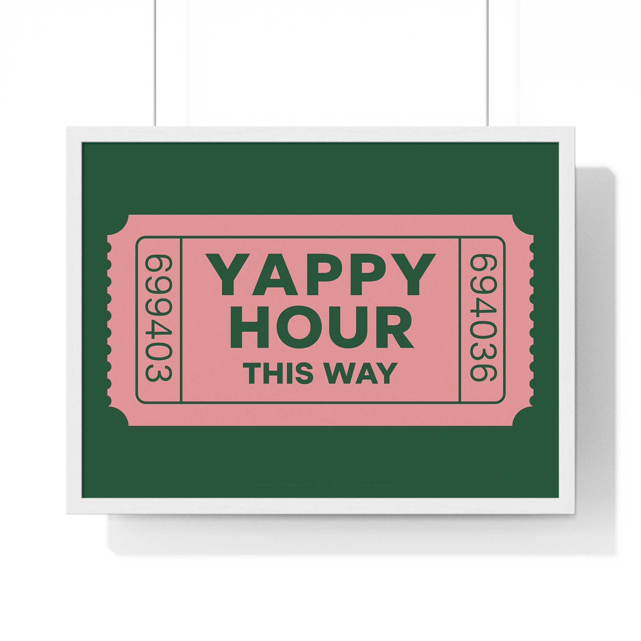 A bold, playful framed poster that brings a wink of humor and retro ticket-style charm to any indoor space. The design features a pink admission ticket reading “YAPPY HOUR THIS WAY” set against a deep green field, creating a high-contrast, modern-vintage look. Mounted in a slim wooden frame with plexiglass front and pre-installed hanging hardware, this piece arrives ready to hang and instantly livens up entryways, pet corners, home bars, or cozy living rooms. The museum-grade, matte paper and pigment inks keep colors bright and true while the archival materials protect the print from yellowing over time. Available in multiple sizes and in black or white frame options, it’s a cheerful accent that matches eclectic, mid-century, and contemporary interiors alike.