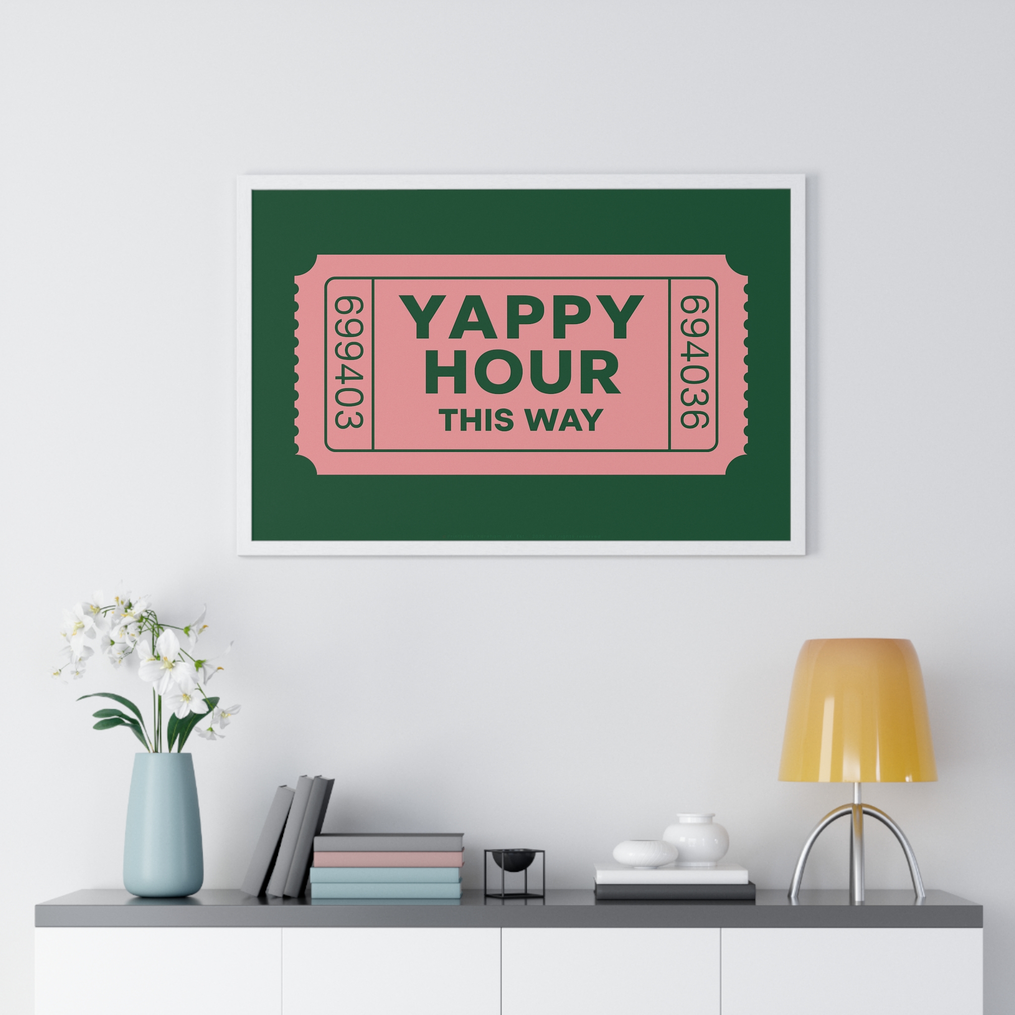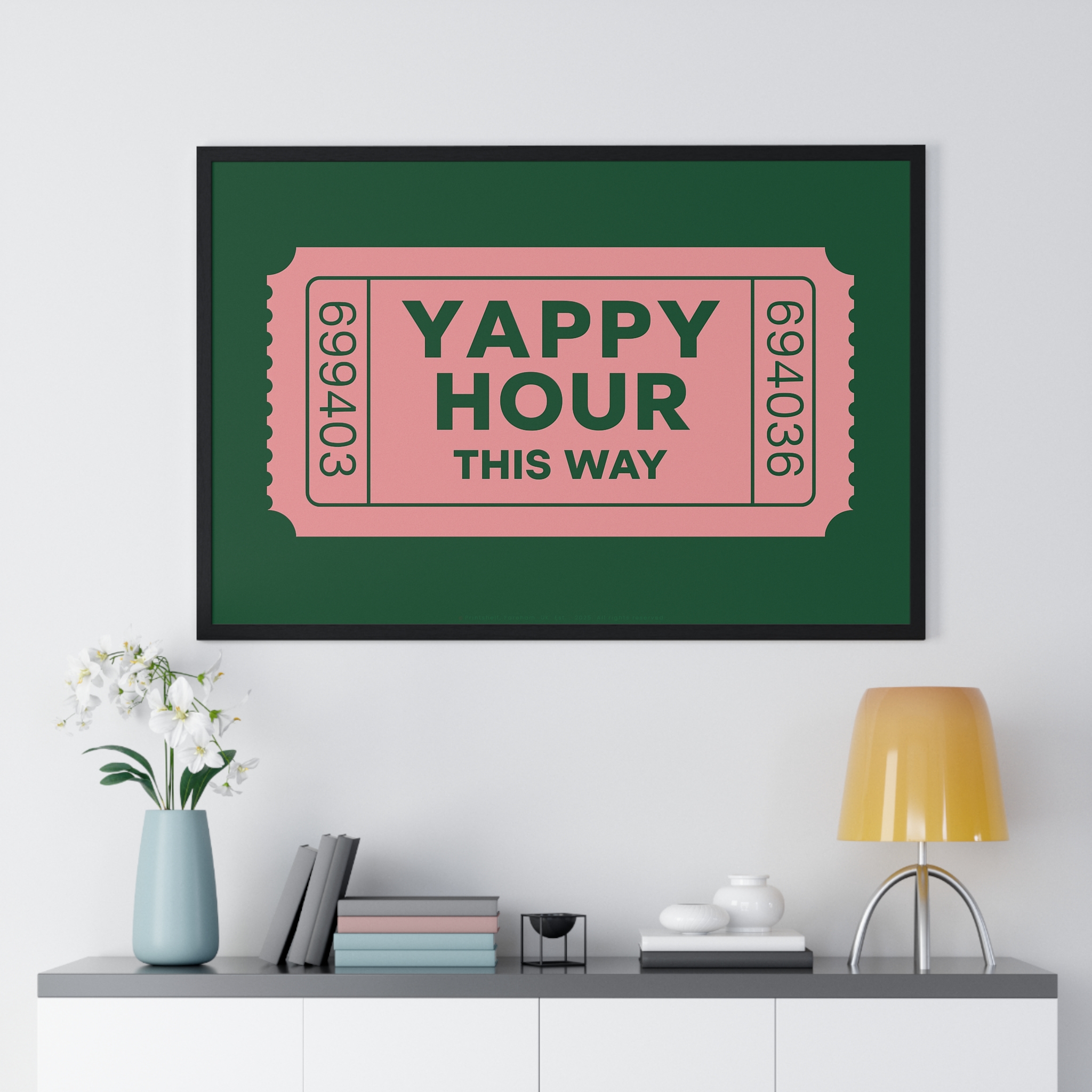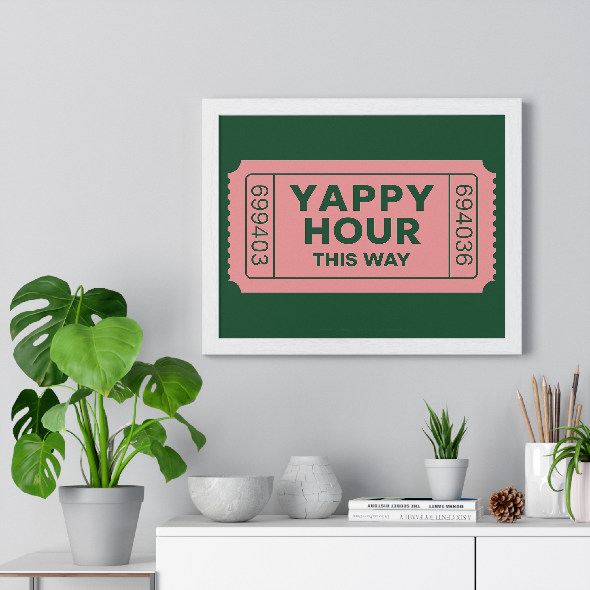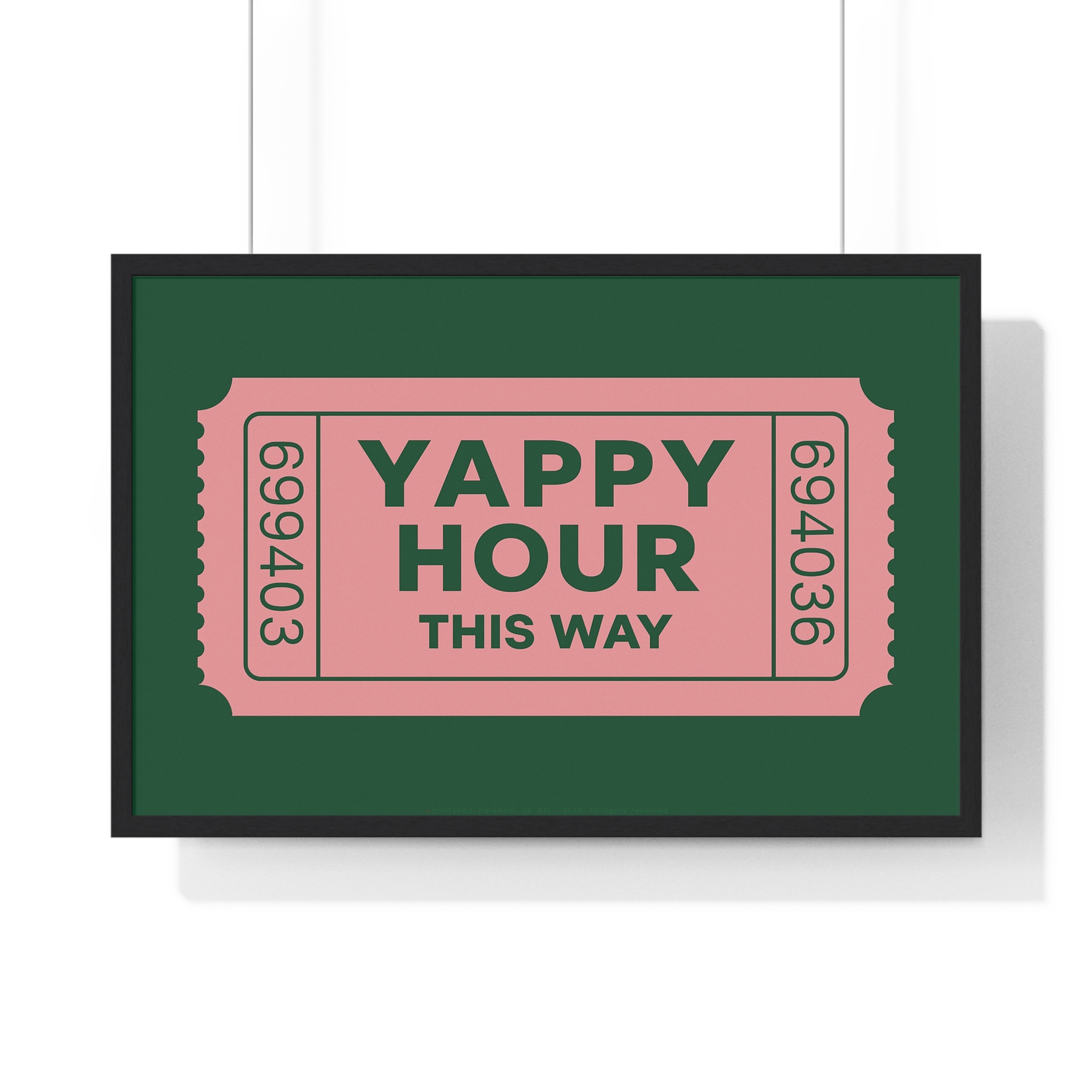 A bold, playful framed poster that brings a wink of humor and retro ticket-style charm to any indoor space. The design features a pink admission ticket reading “YAPPY HOUR THIS WAY” set against a deep green field, creating a high-contrast, modern-vintage look. Mounted in a slim wooden frame with plexiglass front and pre-installed hanging hardware, this piece arrives ready to hang and instantly livens up entryways, pet corners, home bars, or cozy living rooms. The museum-grade, matte paper and pigment inks keep colors bright and true while the archival materials protect the print from yellowing over time. Available in multiple sizes and in black or white frame options, it’s a cheerful accent that matches eclectic, mid-century, and contemporary interiors alike.