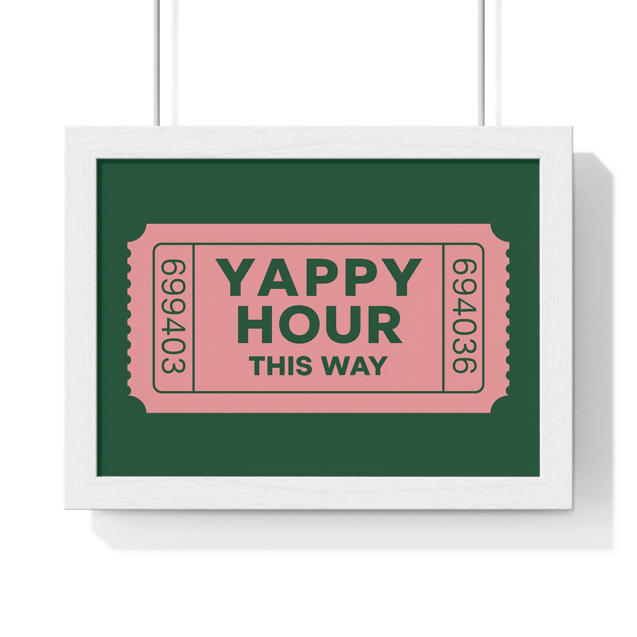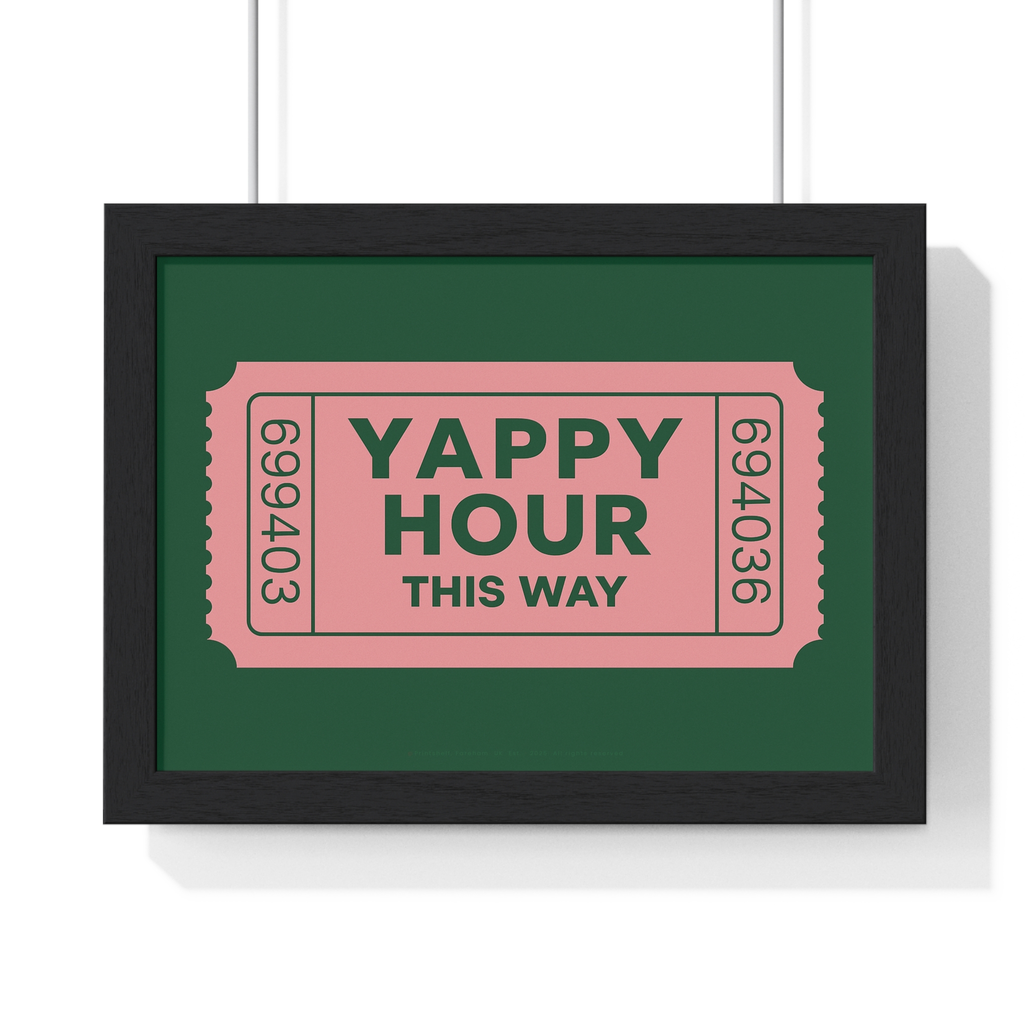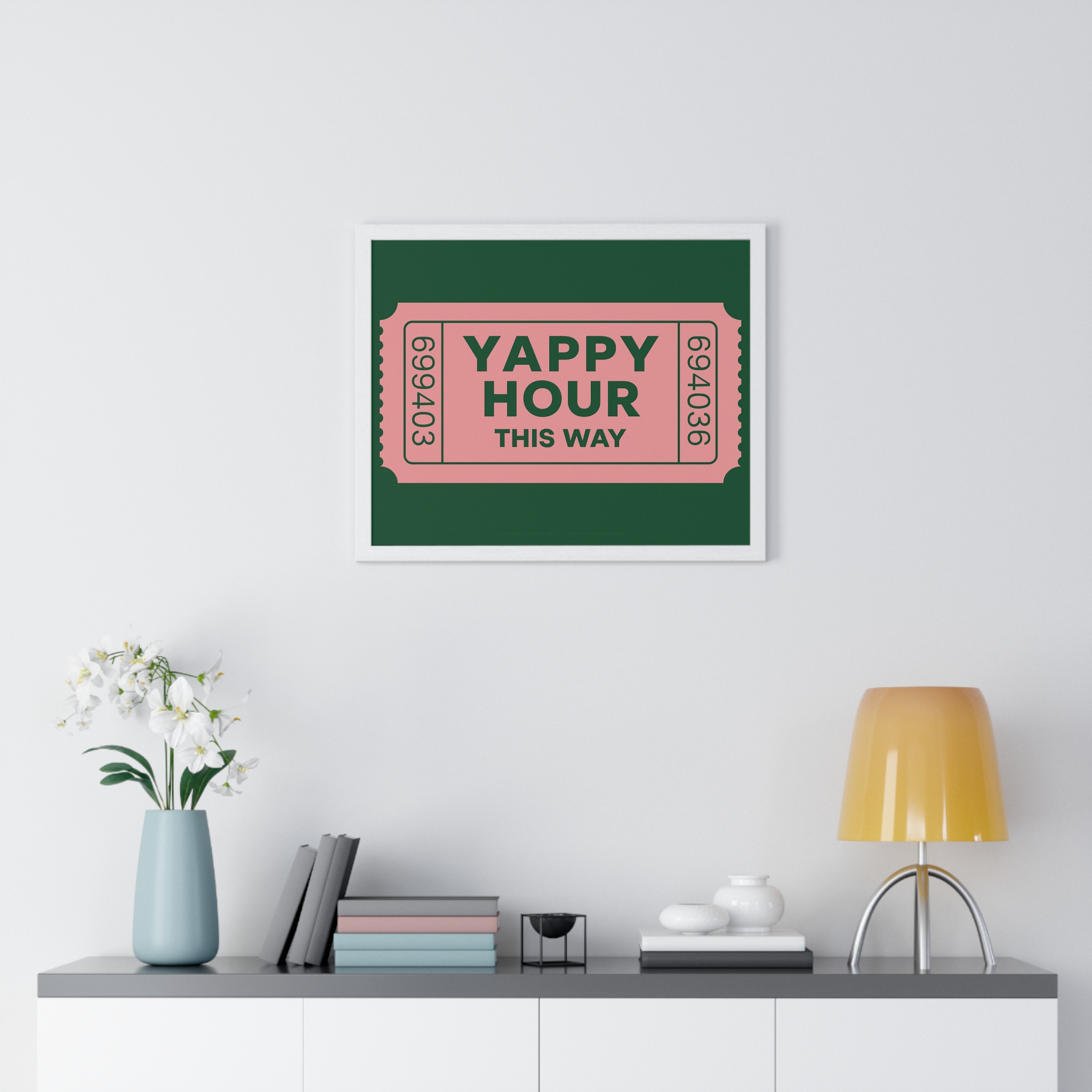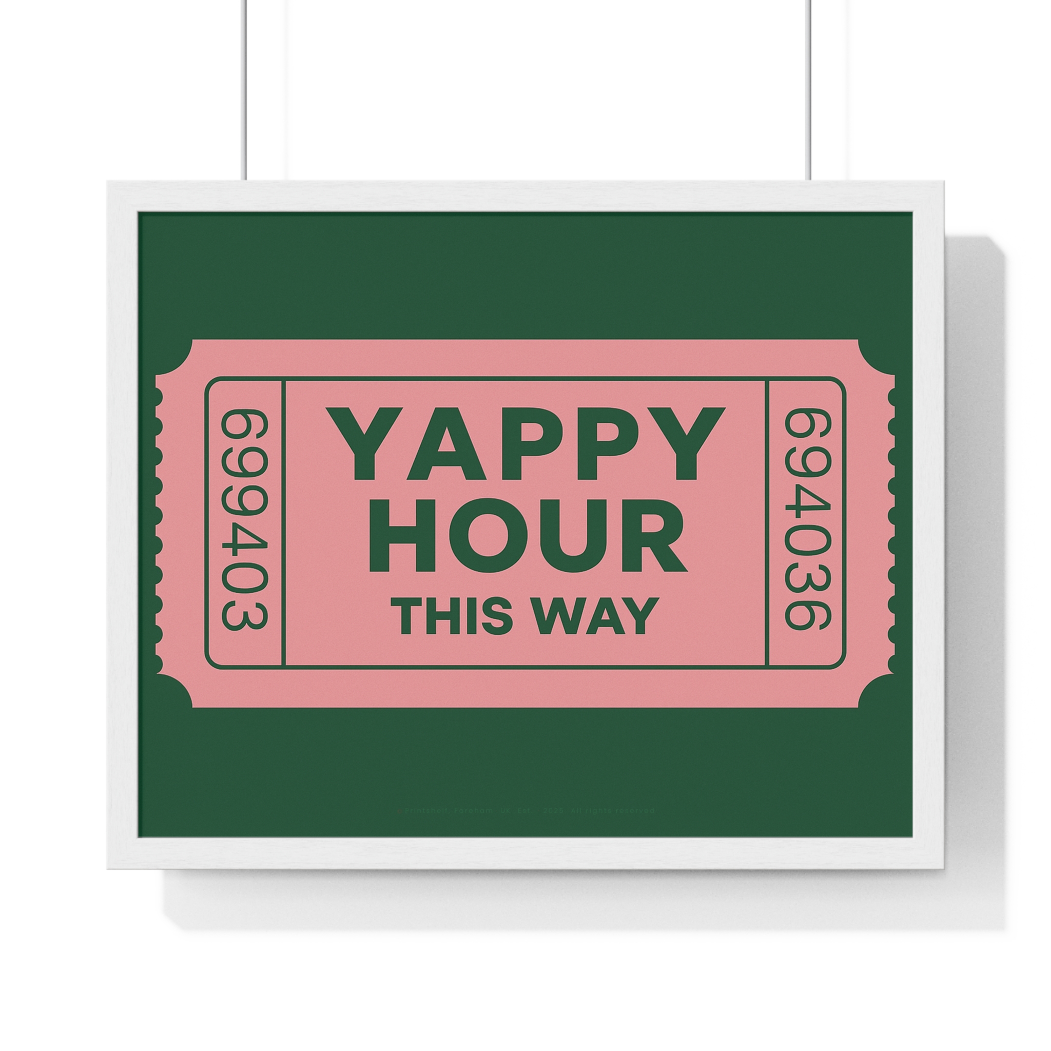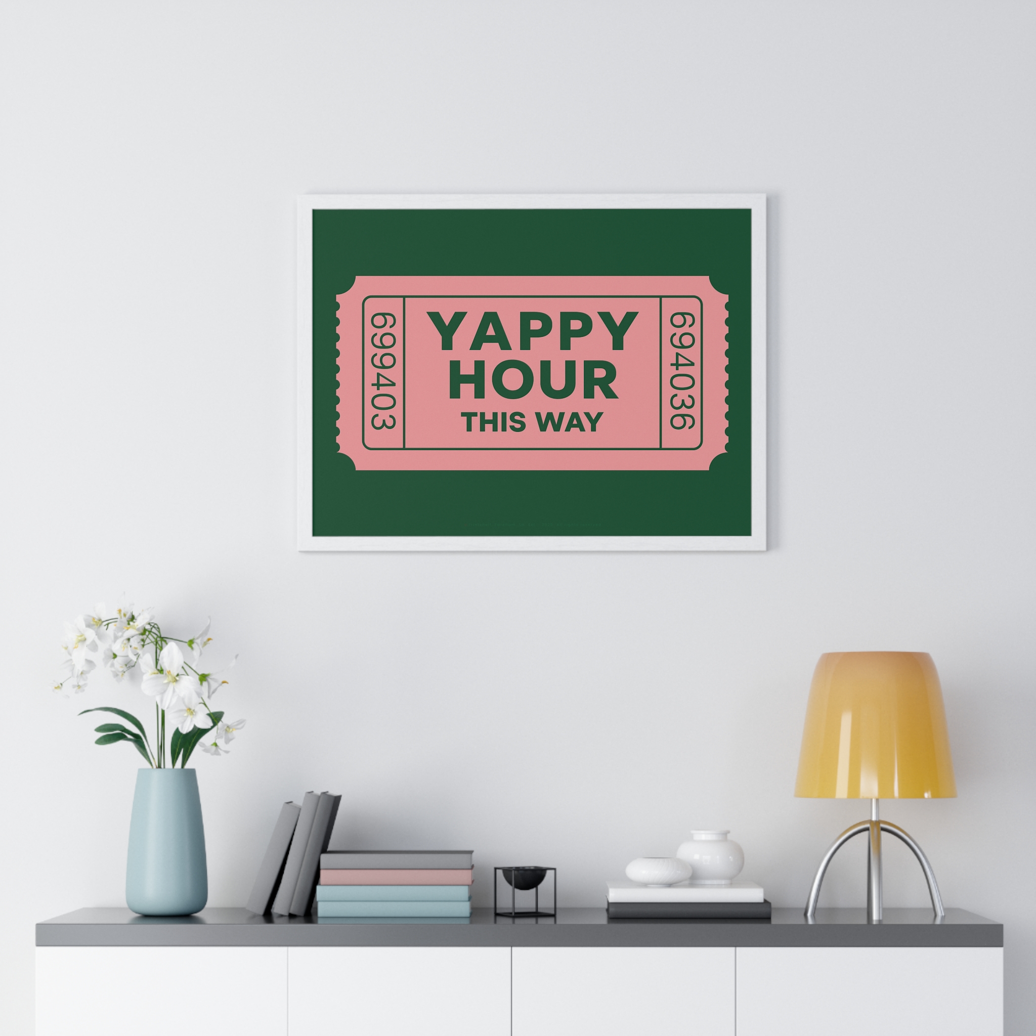 A bold, playful framed poster that brings a wink of humor and retro ticket-style charm to any indoor space. The design features a pink admission ticket reading “YAPPY HOUR THIS WAY” set against a deep green field, creating a high-contrast, modern-vintage look. Mounted in a slim wooden frame with plexiglass front and pre-installed hanging hardware, this piece arrives ready to hang and instantly livens up entryways, pet corners, home bars, or cozy living rooms. The museum-grade, matte paper and pigment inks keep colors bright and true while the archival materials protect the print from yellowing over time. Available in multiple sizes and in black or white frame options, it’s a cheerful accent that matches eclectic, mid-century, and contemporary interiors alike.