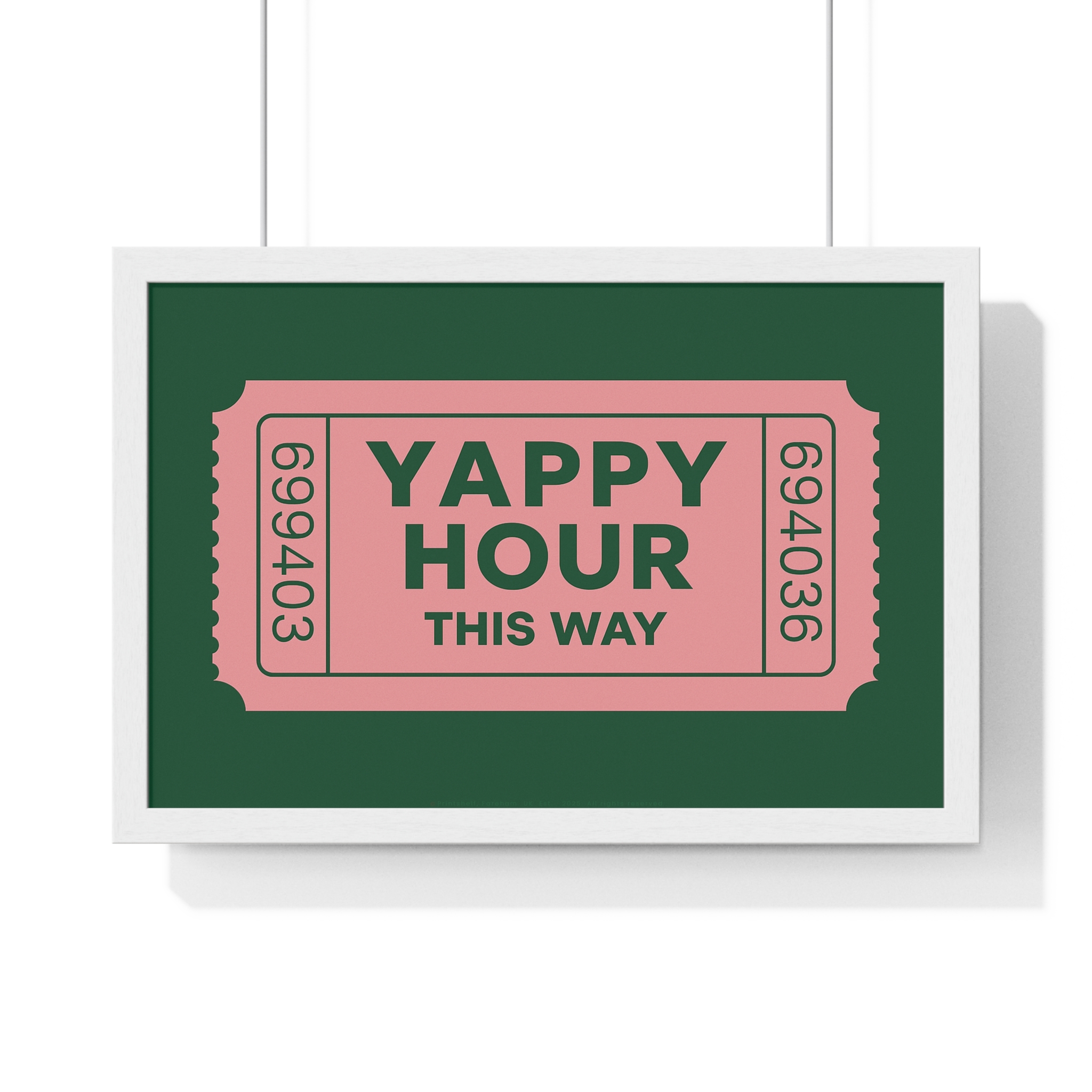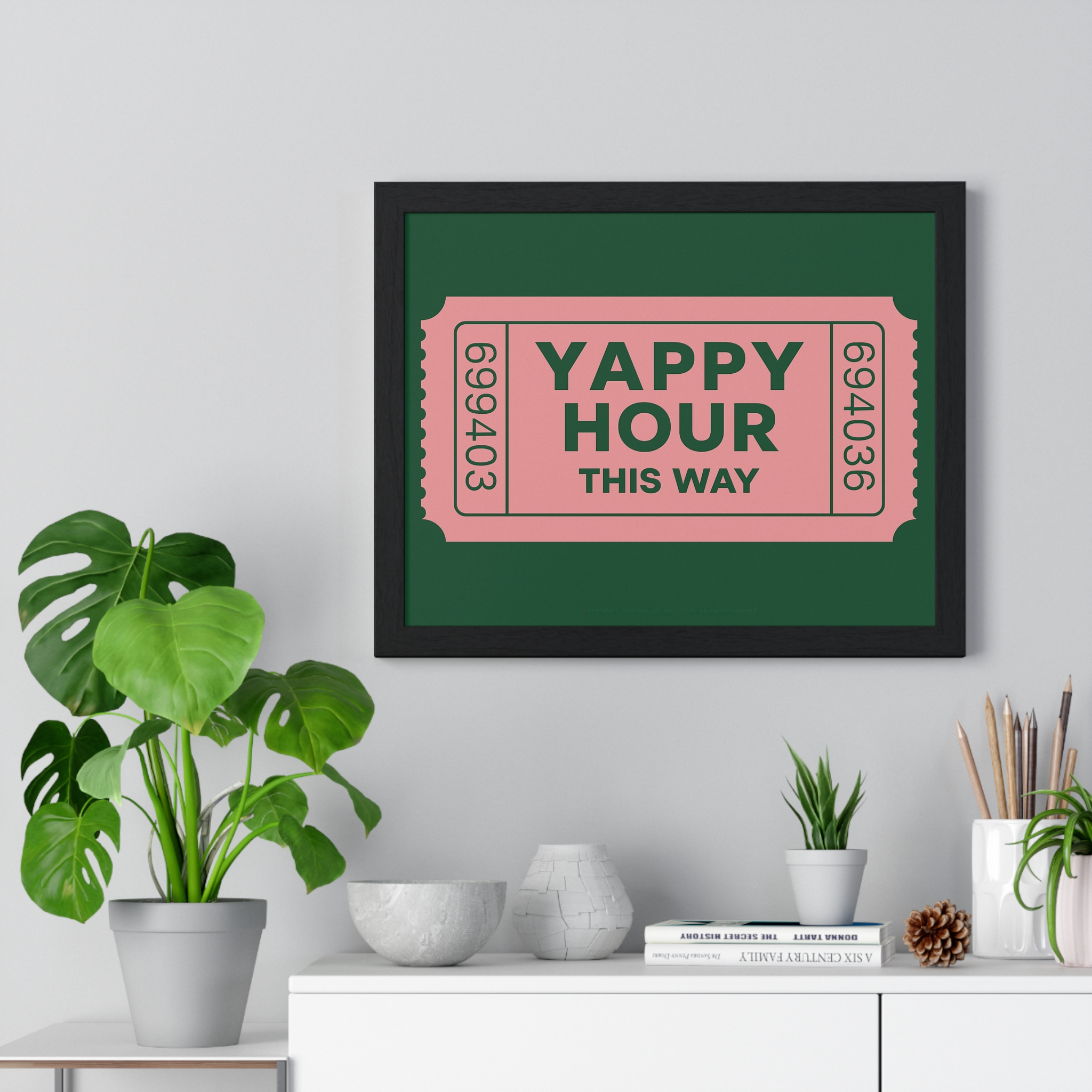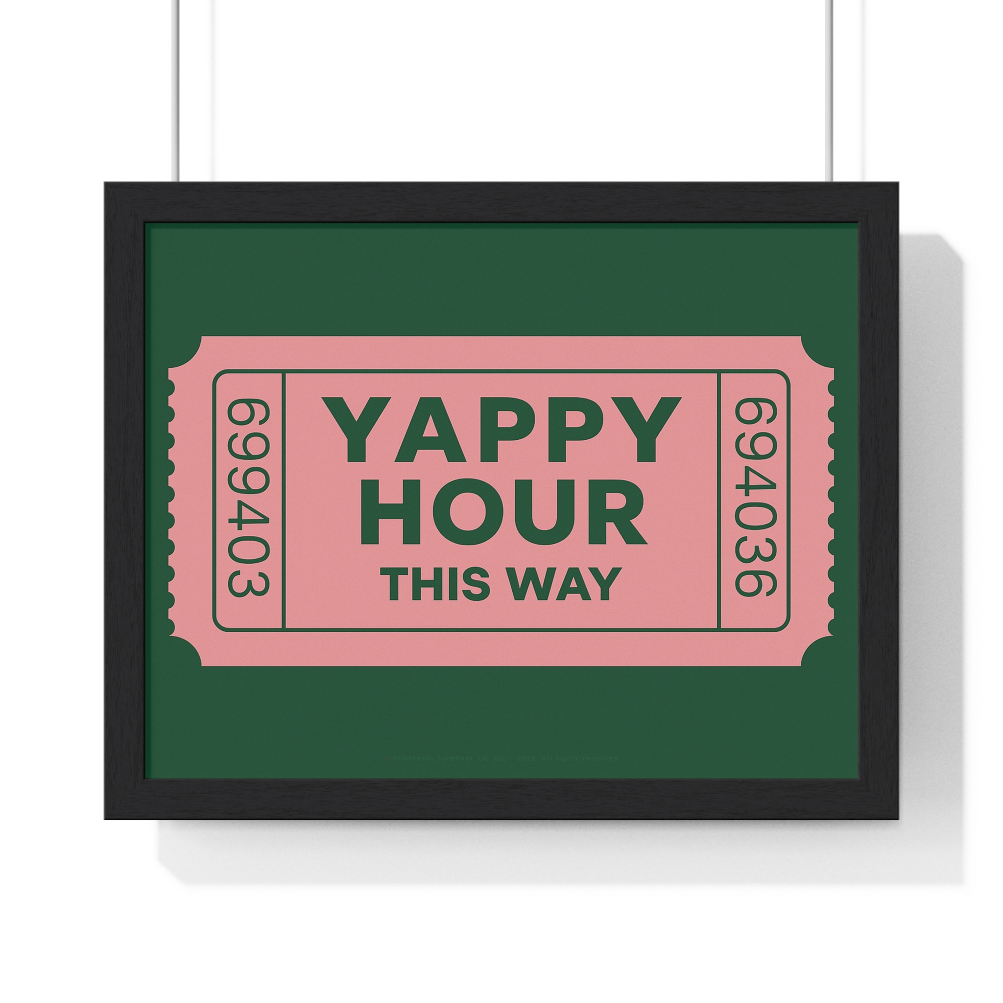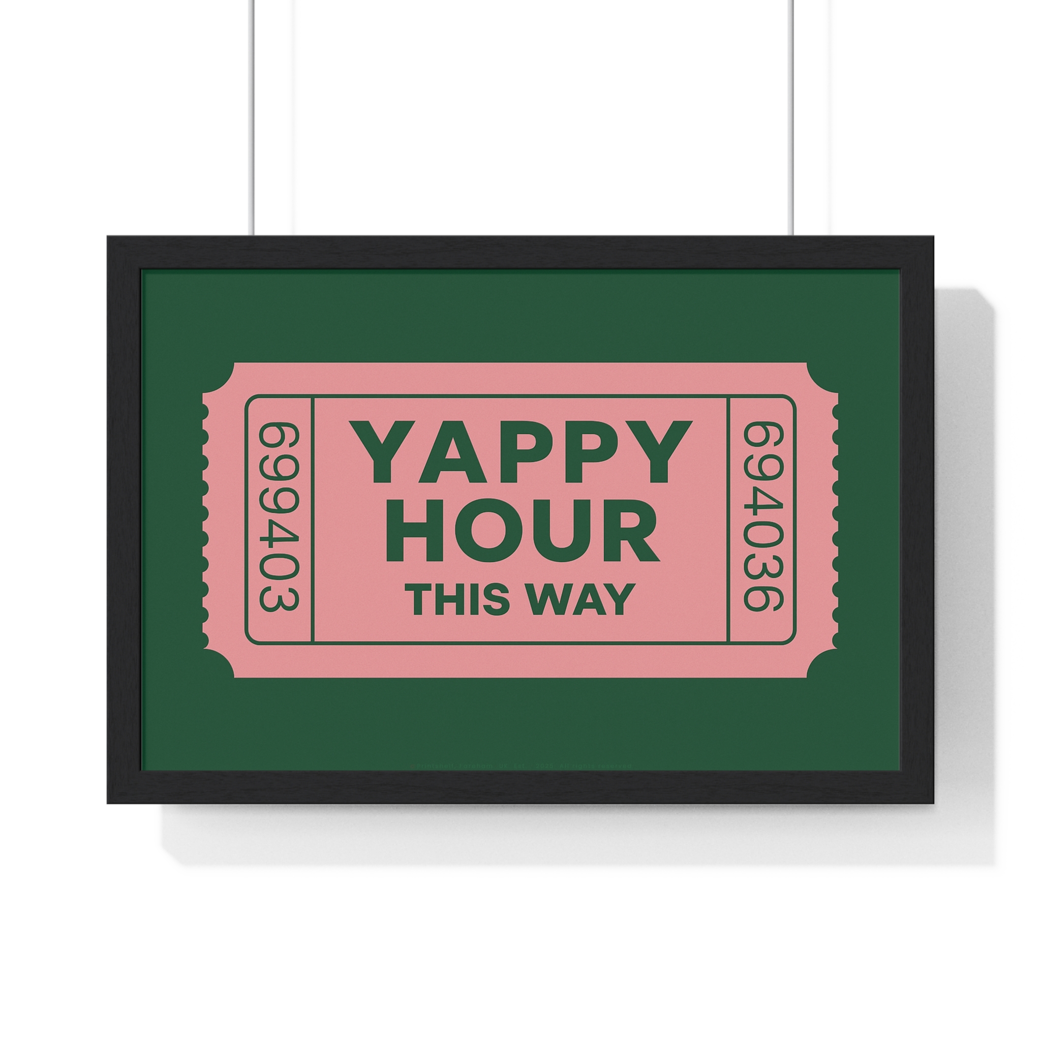 A bold, playful framed poster that brings a wink of humor and retro ticket-style charm to any indoor space. The design features a pink admission ticket reading “YAPPY HOUR THIS WAY” set against a deep green field, creating a high-contrast, modern-vintage look. Mounted in a slim wooden frame with plexiglass front and pre-installed hanging hardware, this piece arrives ready to hang and instantly livens up entryways, pet corners, home bars, or cozy living rooms. The museum-grade, matte paper and pigment inks keep colors bright and true while the archival materials protect the print from yellowing over time. Available in multiple sizes and in black or white frame options, it’s a cheerful accent that matches eclectic, mid-century, and contemporary interiors alike.