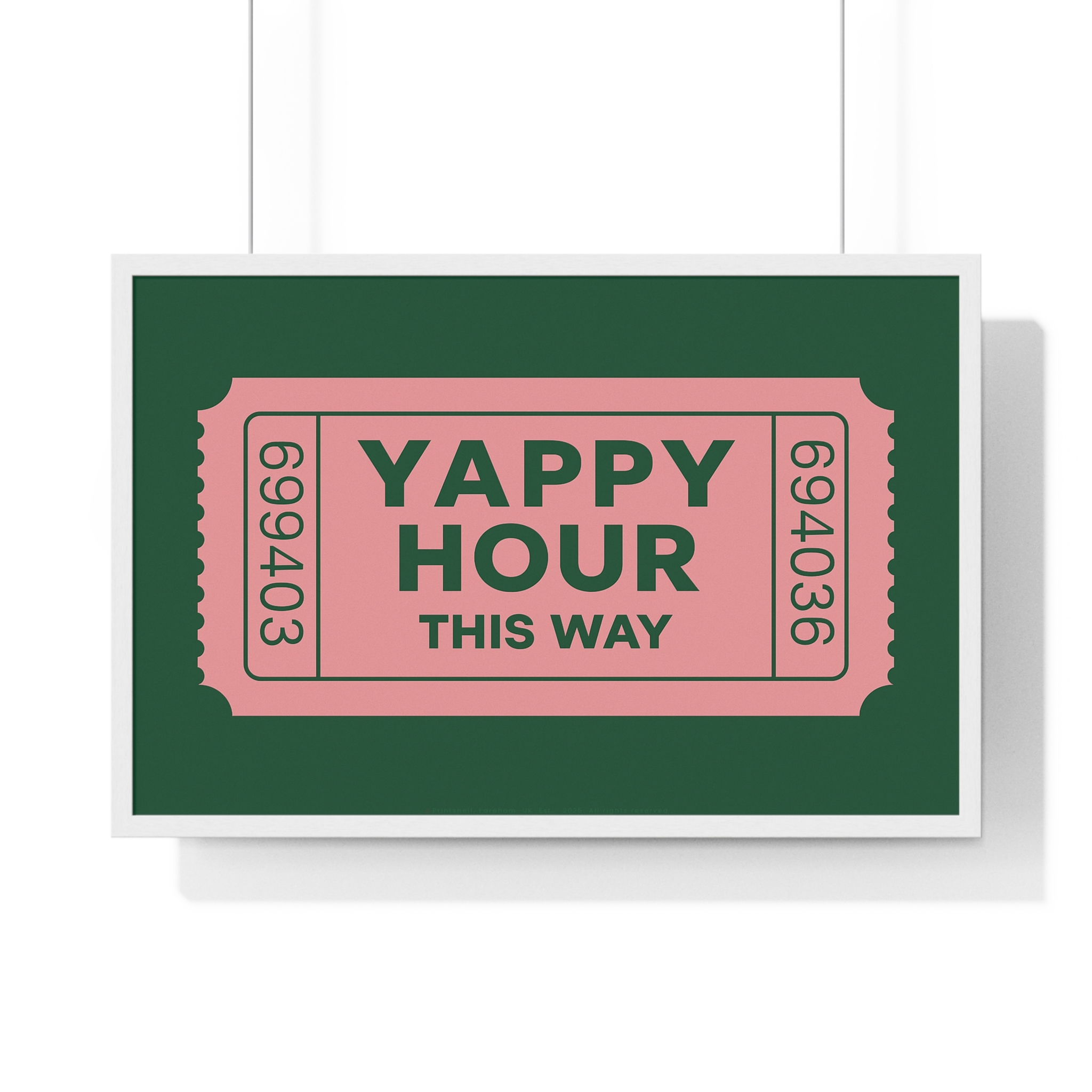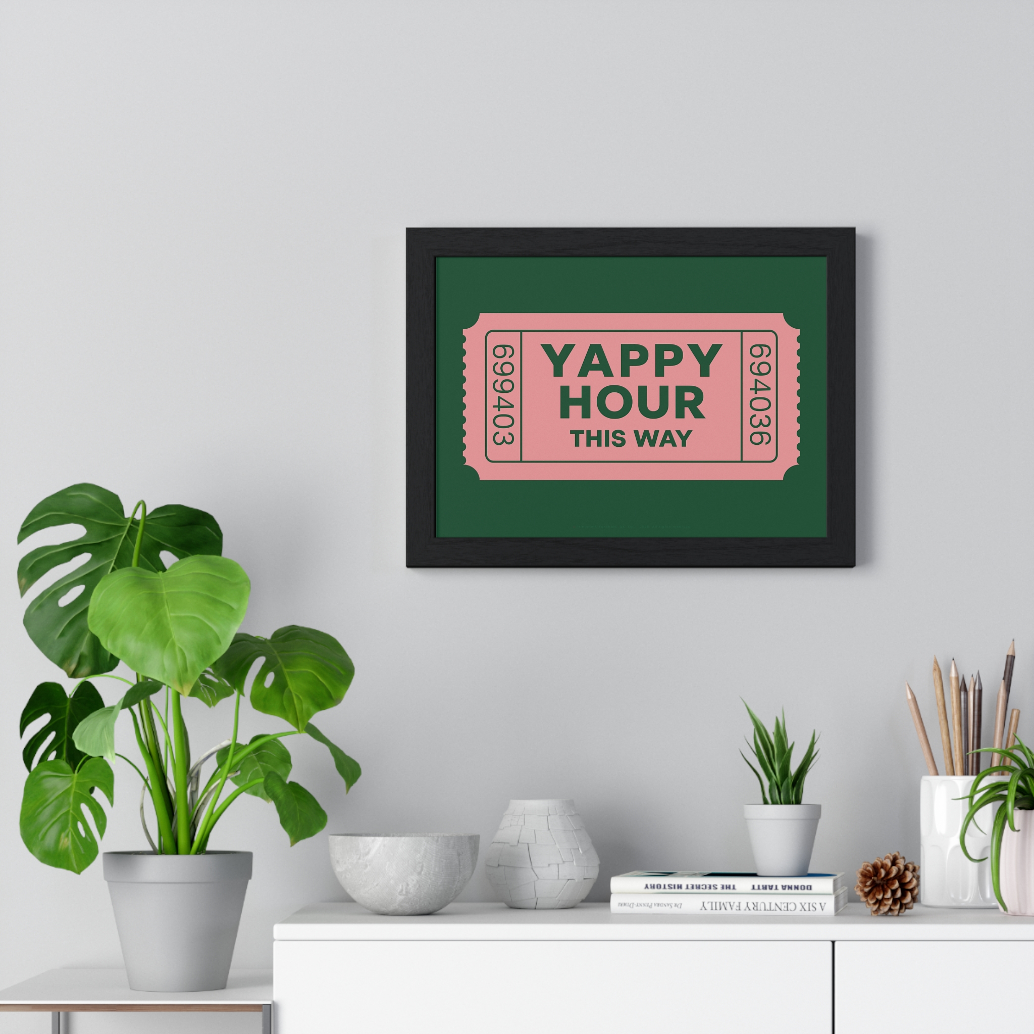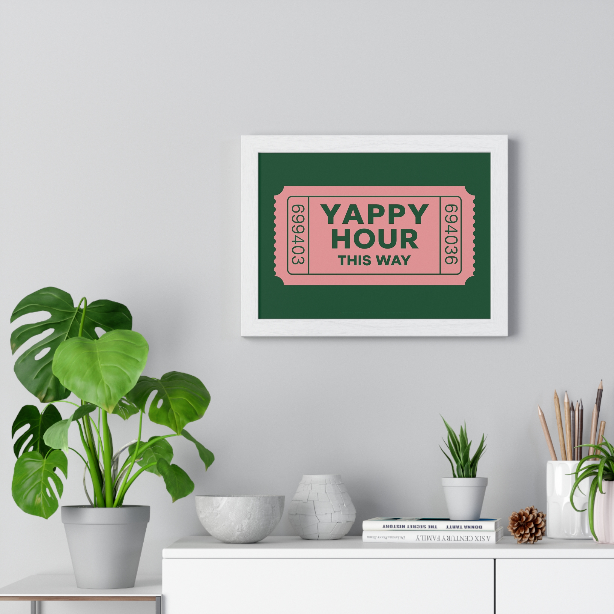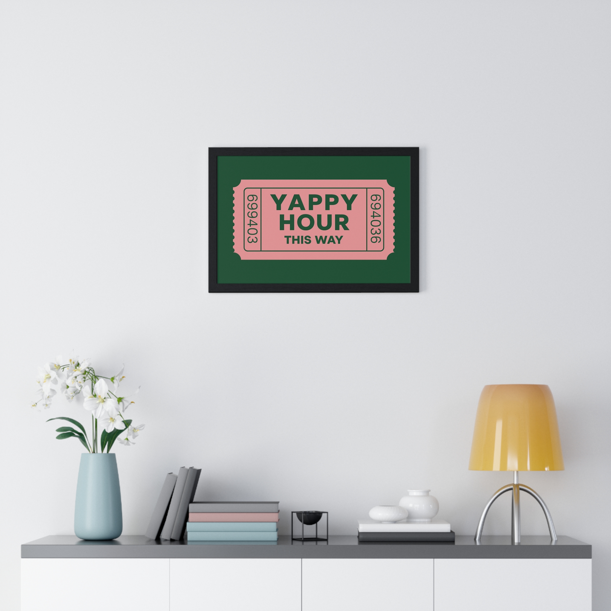 A bold, playful framed poster that brings a wink of humor and retro ticket-style charm to any indoor space. The design features a pink admission ticket reading “YAPPY HOUR THIS WAY” set against a deep green field, creating a high-contrast, modern-vintage look. Mounted in a slim wooden frame with plexiglass front and pre-installed hanging hardware, this piece arrives ready to hang and instantly livens up entryways, pet corners, home bars, or cozy living rooms. The museum-grade, matte paper and pigment inks keep colors bright and true while the archival materials protect the print from yellowing over time. Available in multiple sizes and in black or white frame options, it’s a cheerful accent that matches eclectic, mid-century, and contemporary interiors alike.