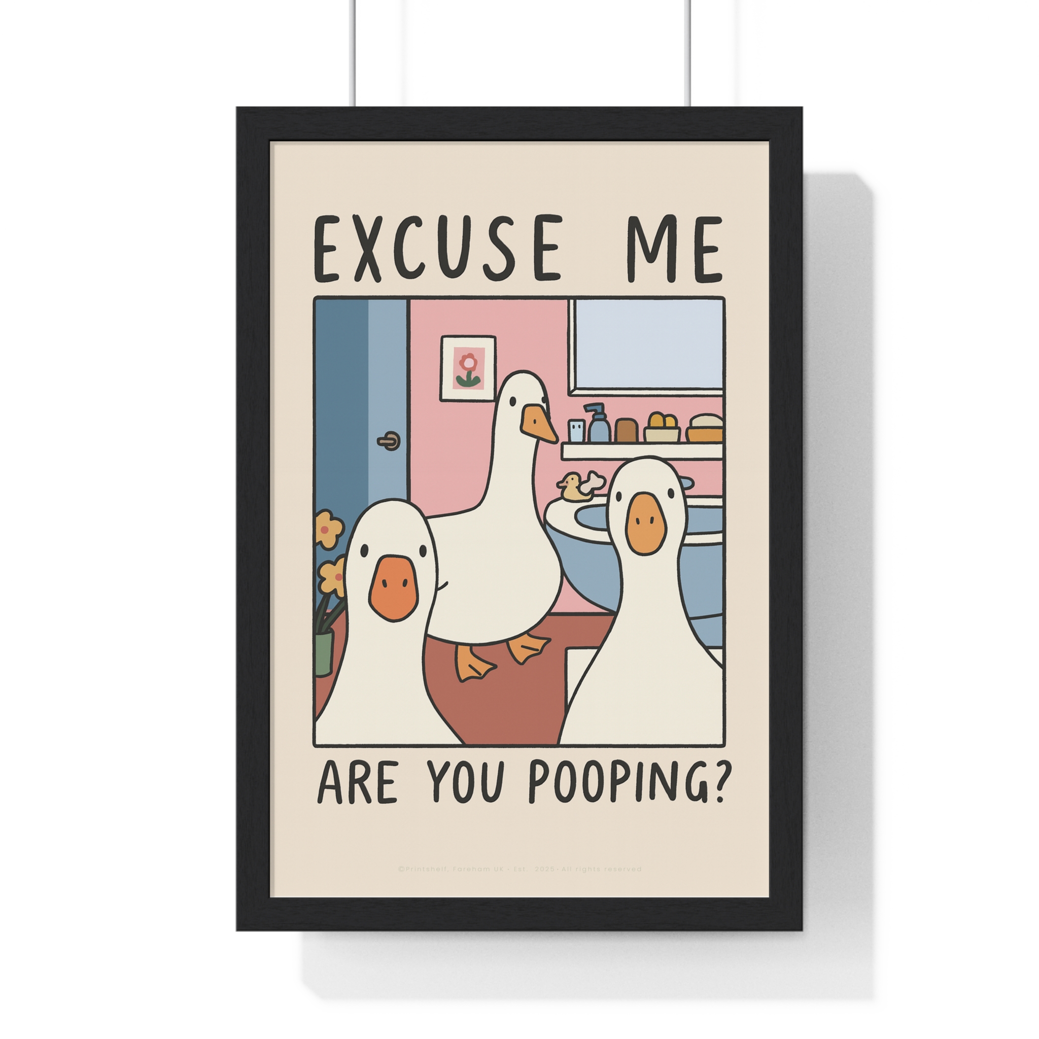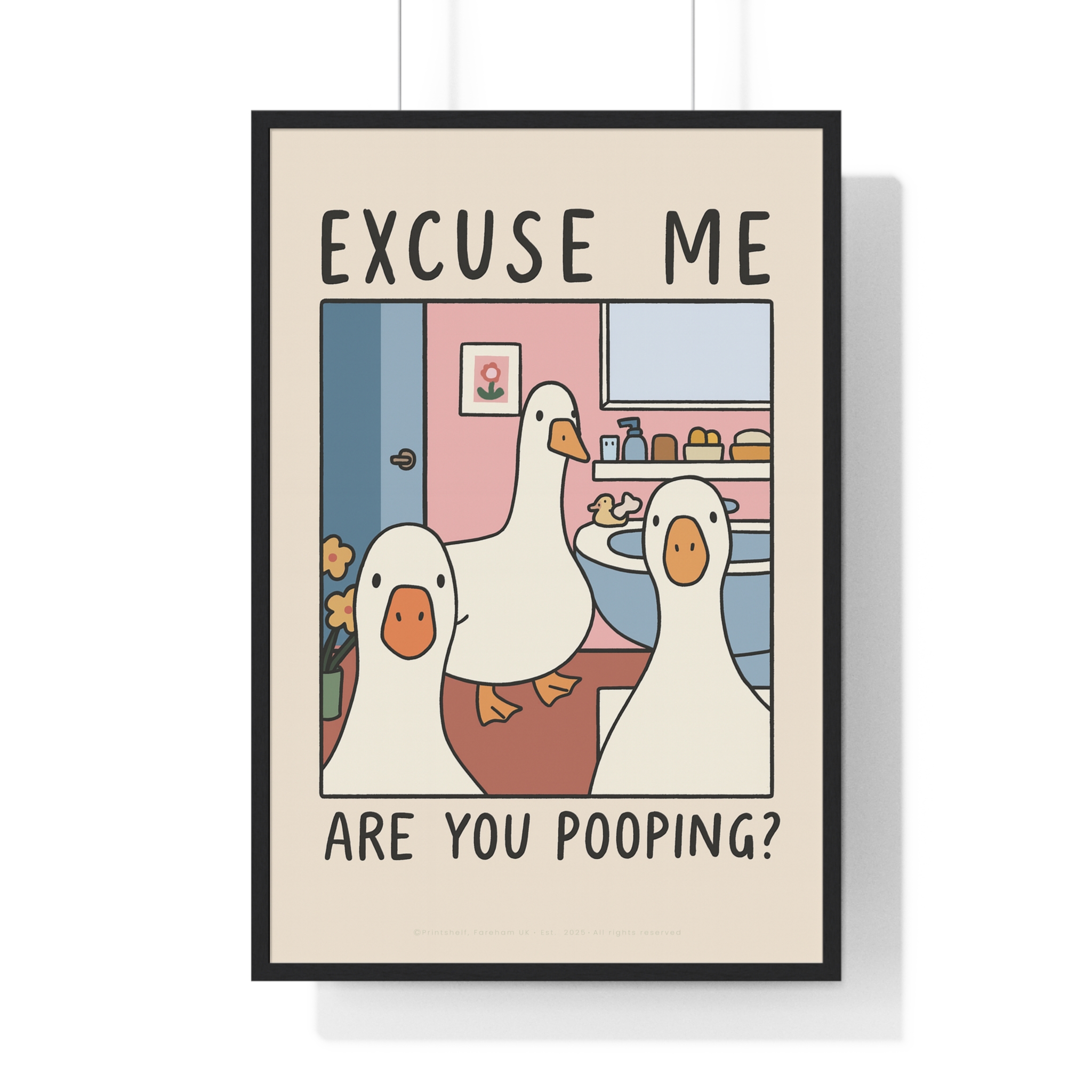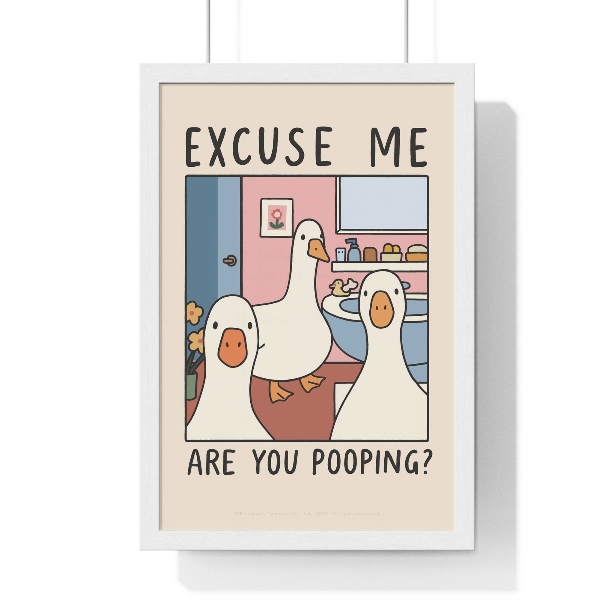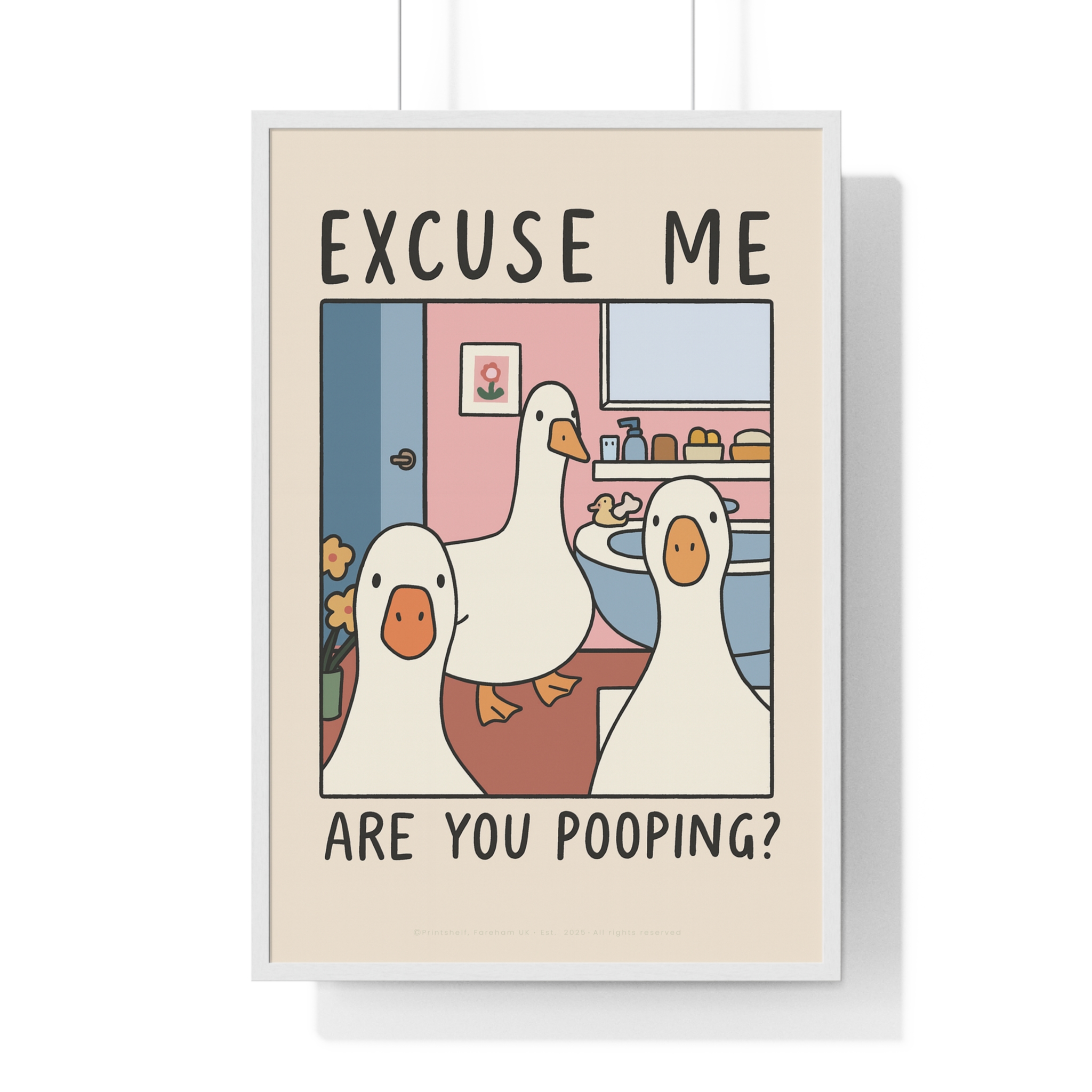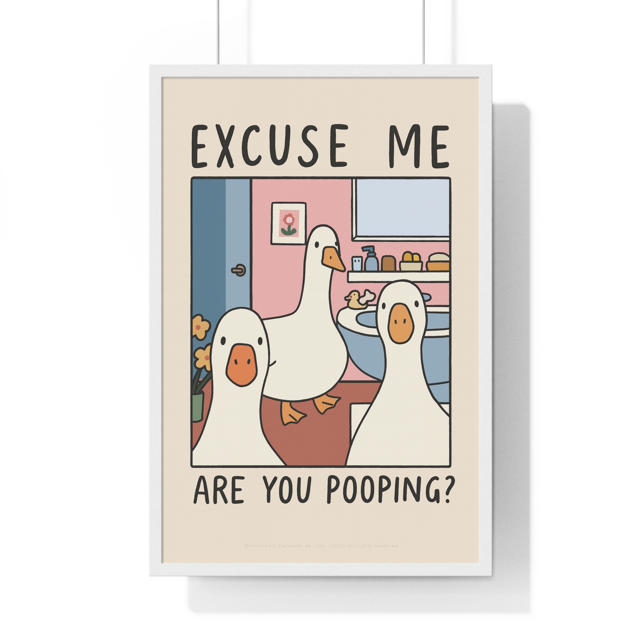 Three curious geese, pastel colors, and a cheeky question — this vertical framed poster brings playful charm to a bathroom, hallway, or cozy nook. Printed on archival, museum-grade matte paper with vivid pigment inks, the artwork stays bright and crisp while the plexiglass front keeps the surface clear and protected. A sleek wooden frame (choose black or white) and pre-installed hanging hardware make it ready to display the moment it arrives. Small enough to tuck into a powder room, large enough to anchor an entry wall — it adds warmth, humor, and a hand-drawn feel to everyday spaces.