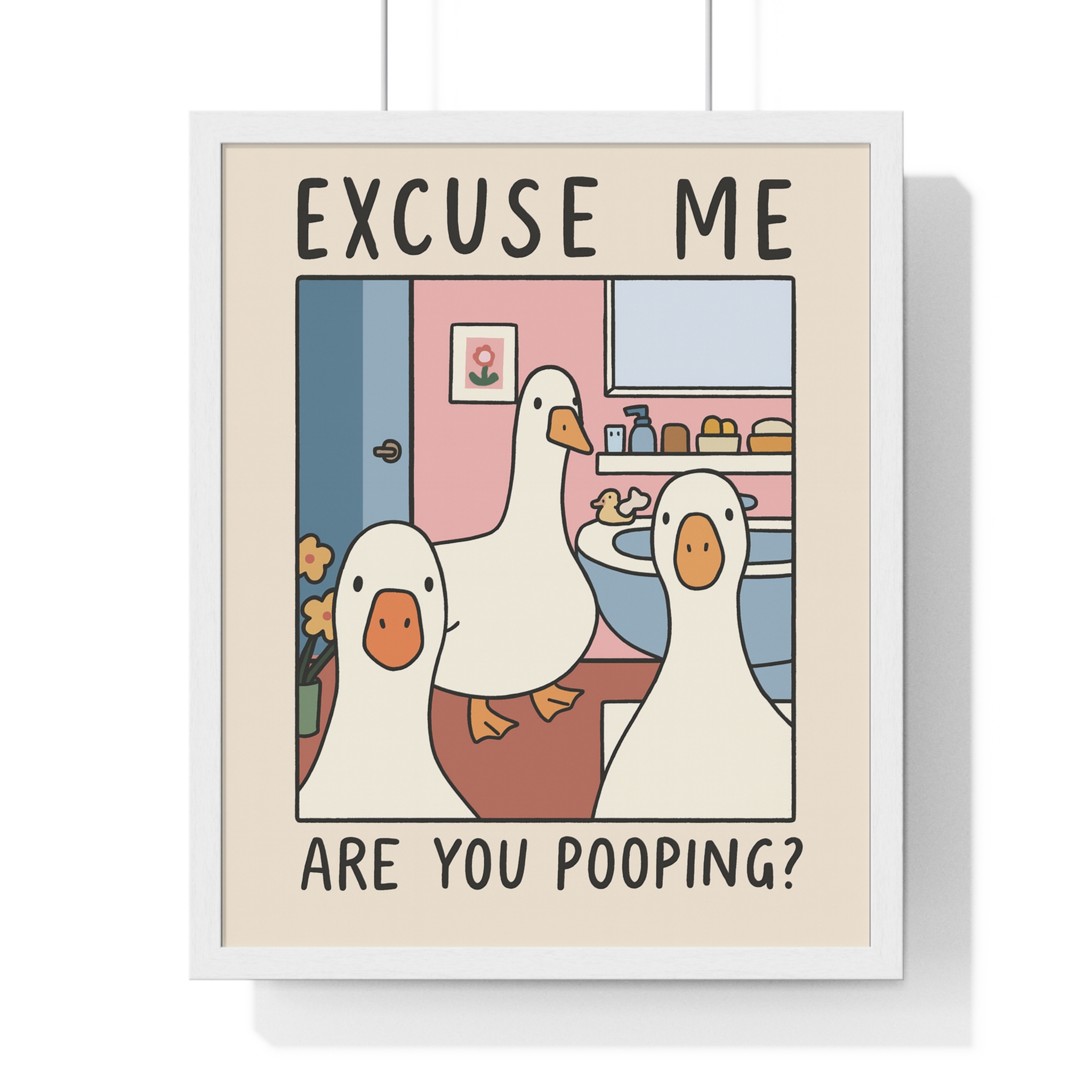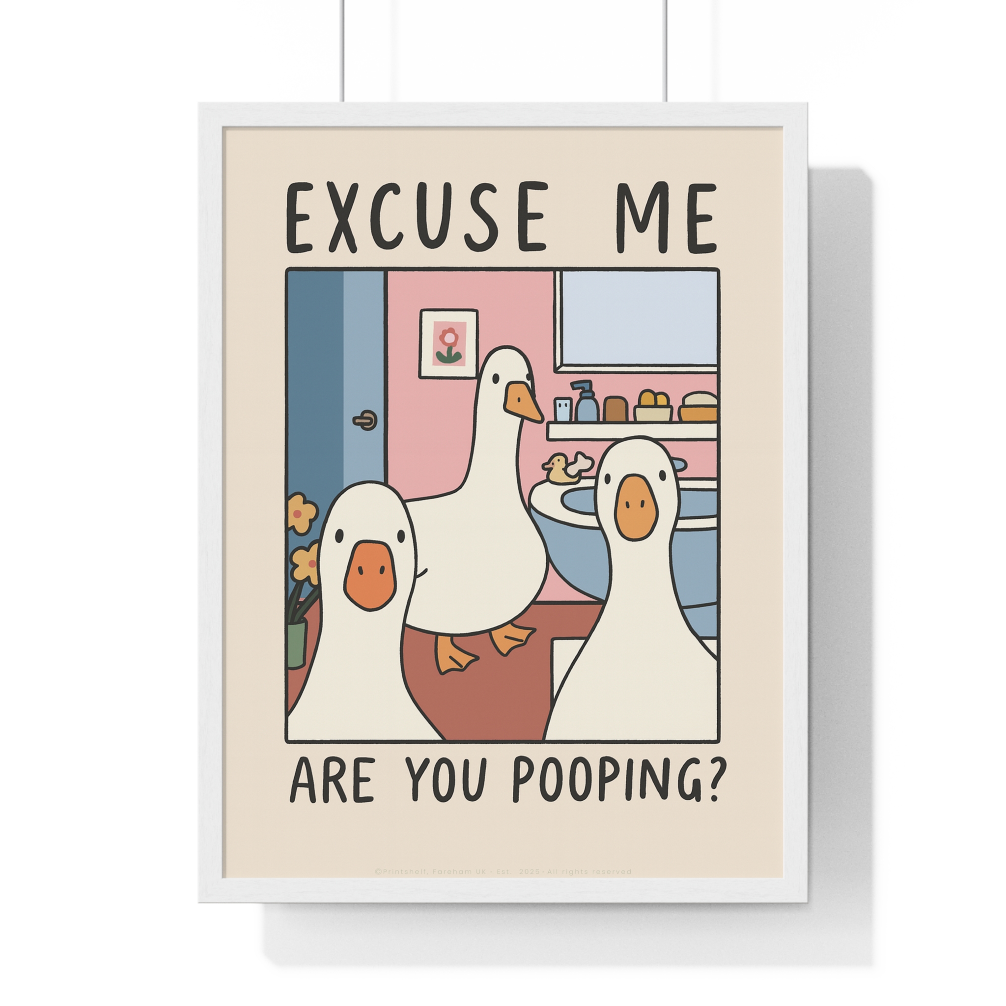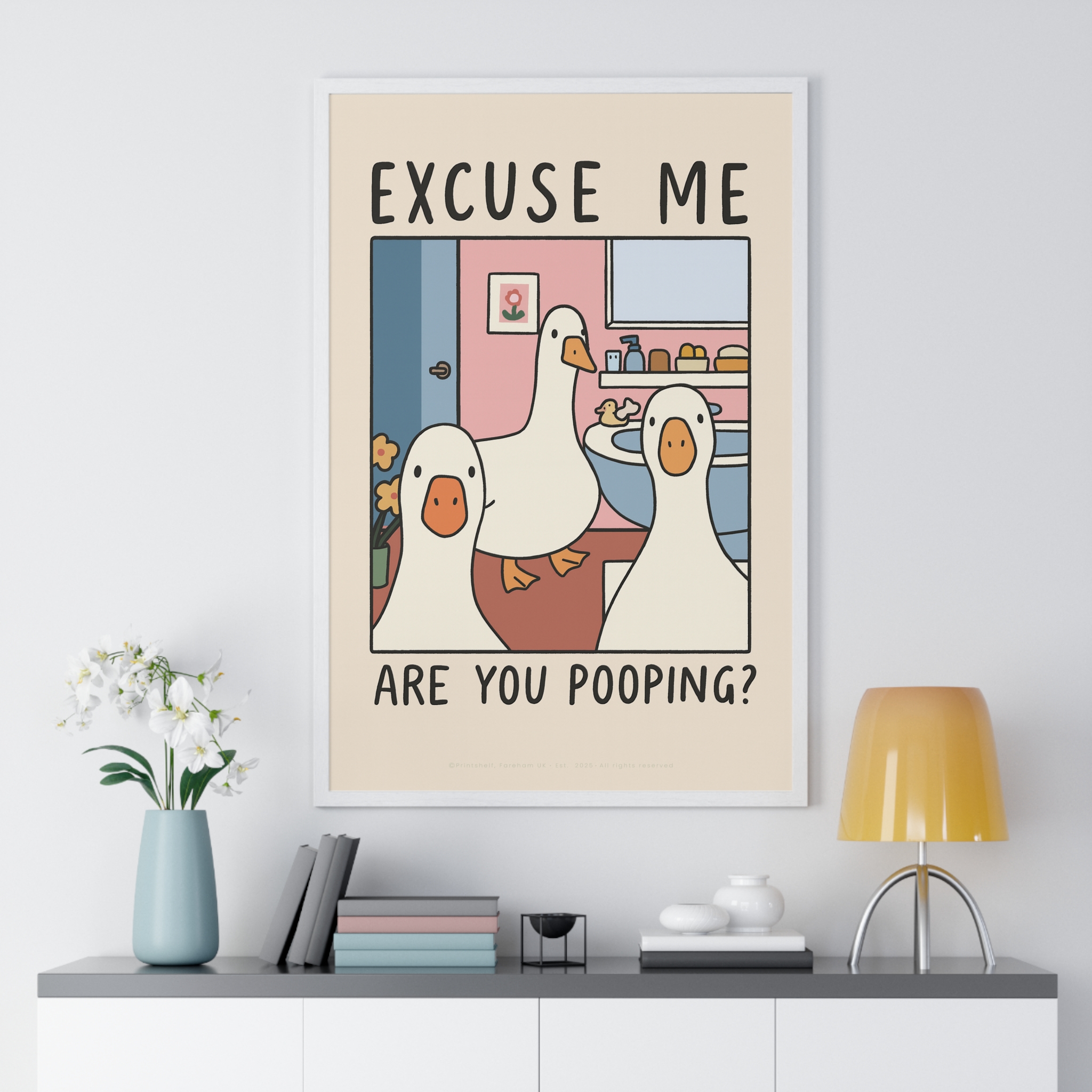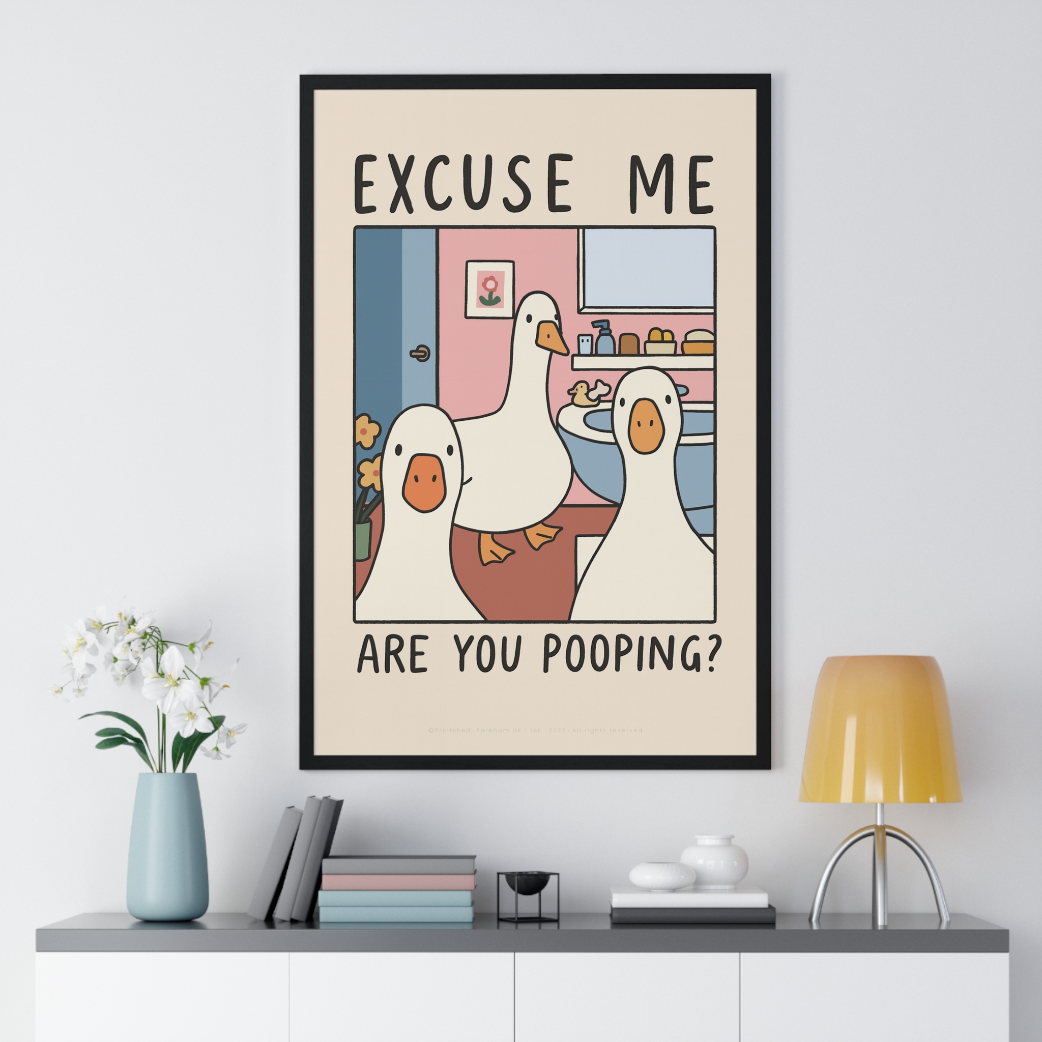 Three curious geese, pastel colors, and a cheeky question — this vertical framed poster brings playful charm to a bathroom, hallway, or cozy nook. Printed on archival, museum-grade matte paper with vivid pigment inks, the artwork stays bright and crisp while the plexiglass front keeps the surface clear and protected. A sleek wooden frame (choose black or white) and pre-installed hanging hardware make it ready to display the moment it arrives. Small enough to tuck into a powder room, large enough to anchor an entry wall — it adds warmth, humor, and a hand-drawn feel to everyday spaces.
