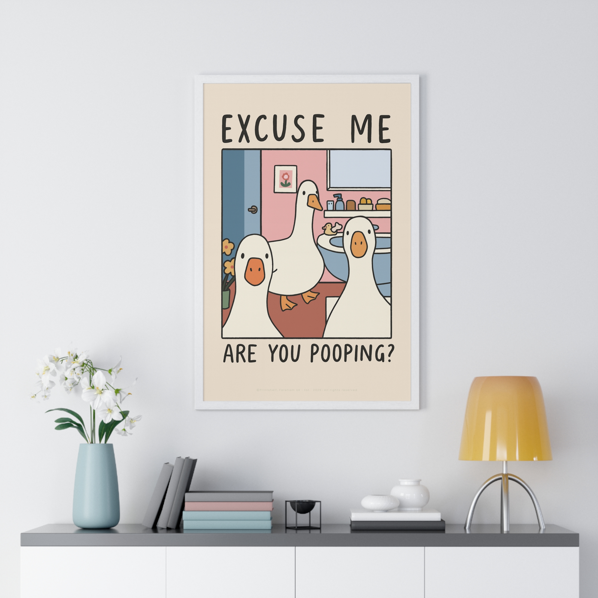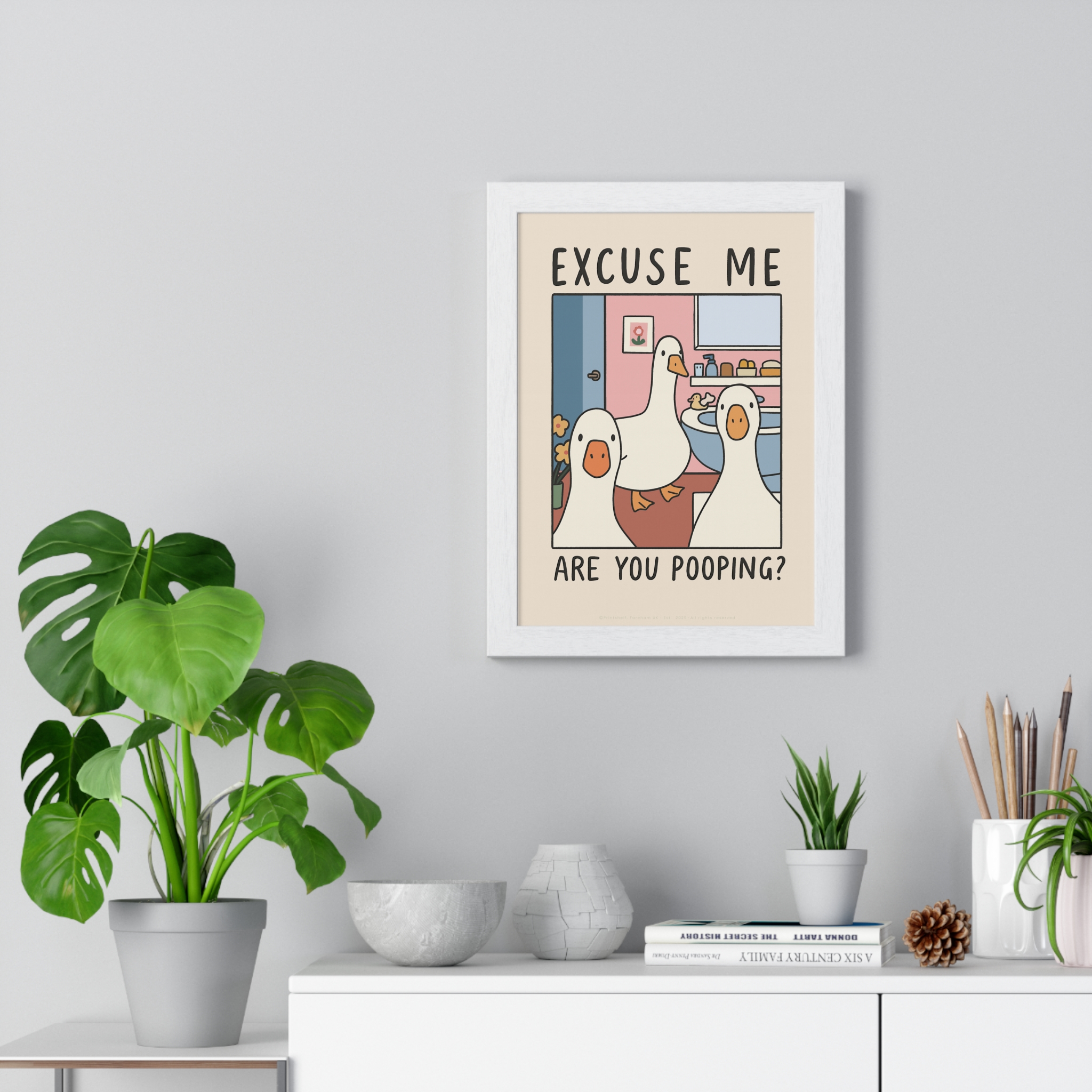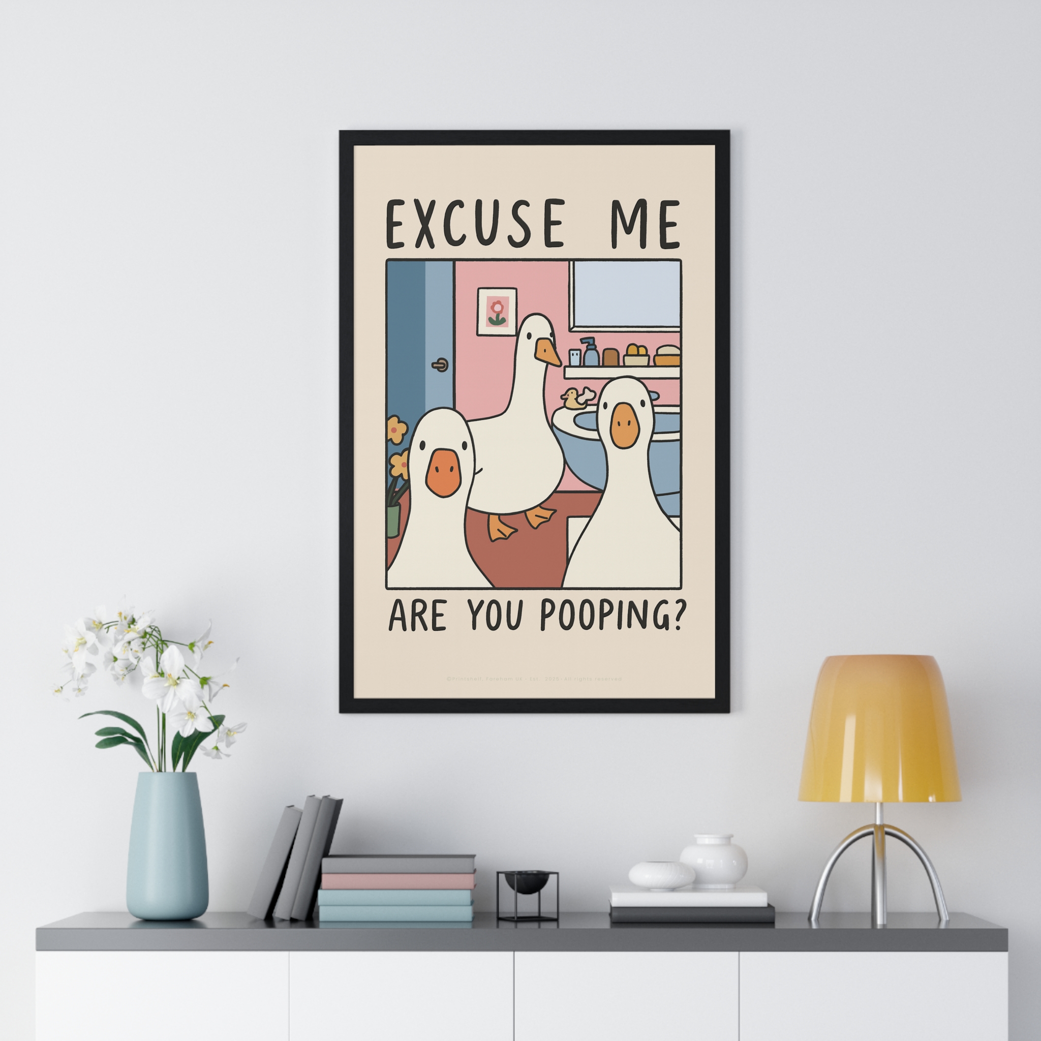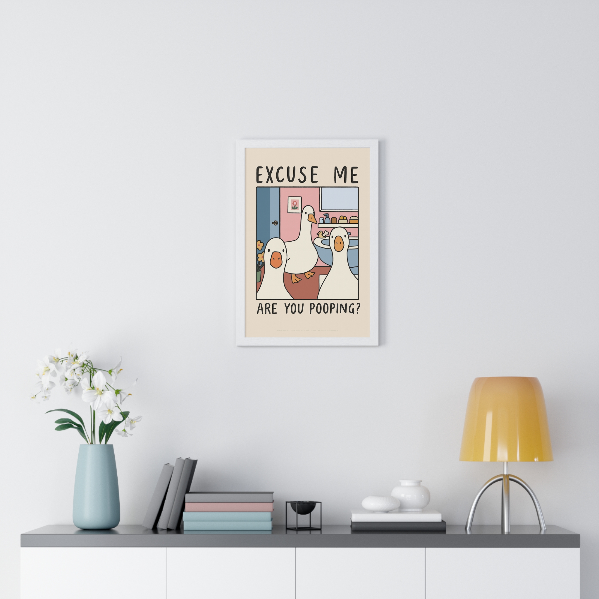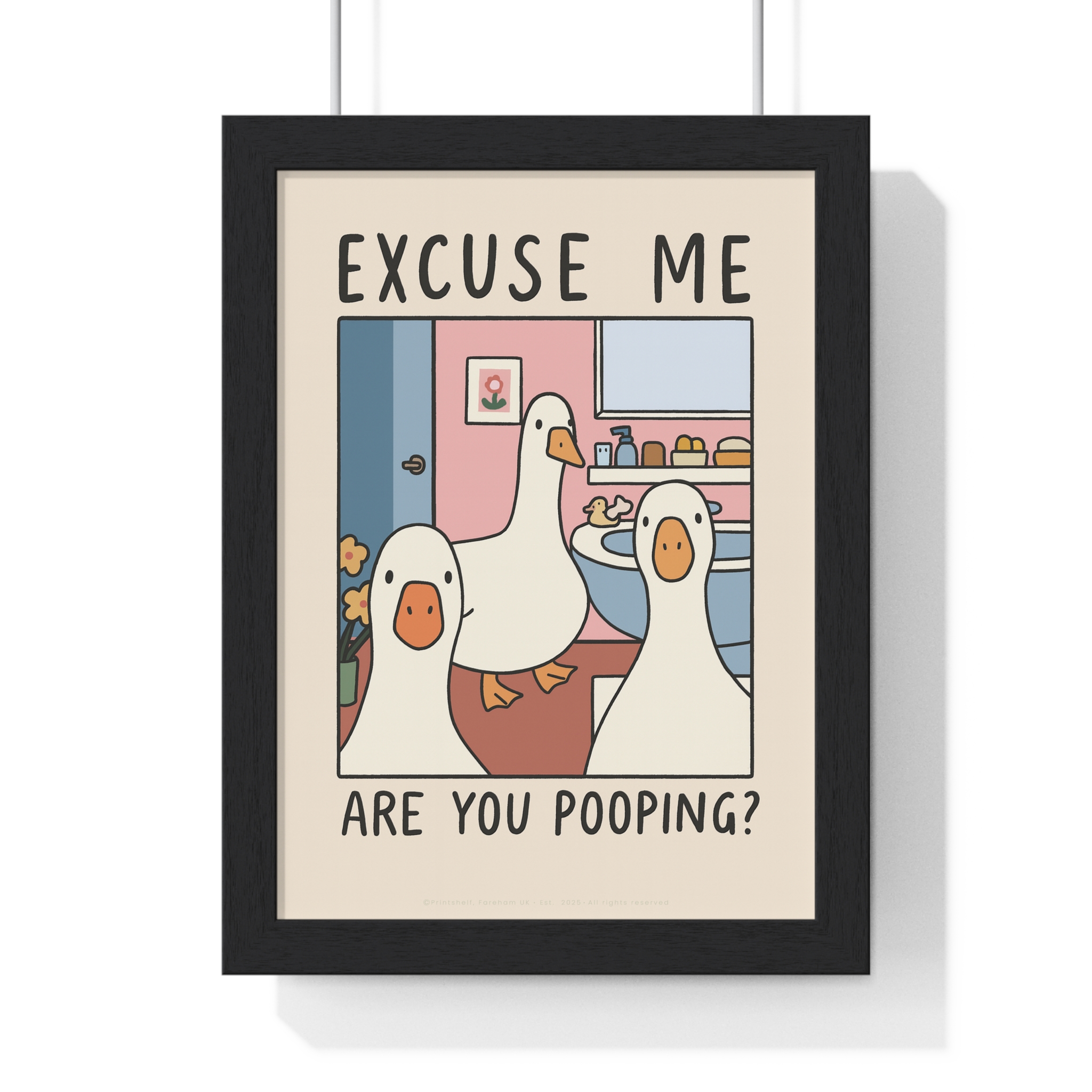 Three curious geese, pastel colors, and a cheeky question — this vertical framed poster brings playful charm to a bathroom, hallway, or cozy nook. Printed on archival, museum-grade matte paper with vivid pigment inks, the artwork stays bright and crisp while the plexiglass front keeps the surface clear and protected. A sleek wooden frame (choose black or white) and pre-installed hanging hardware make it ready to display the moment it arrives. Small enough to tuck into a powder room, large enough to anchor an entry wall — it adds warmth, humor, and a hand-drawn feel to everyday spaces.