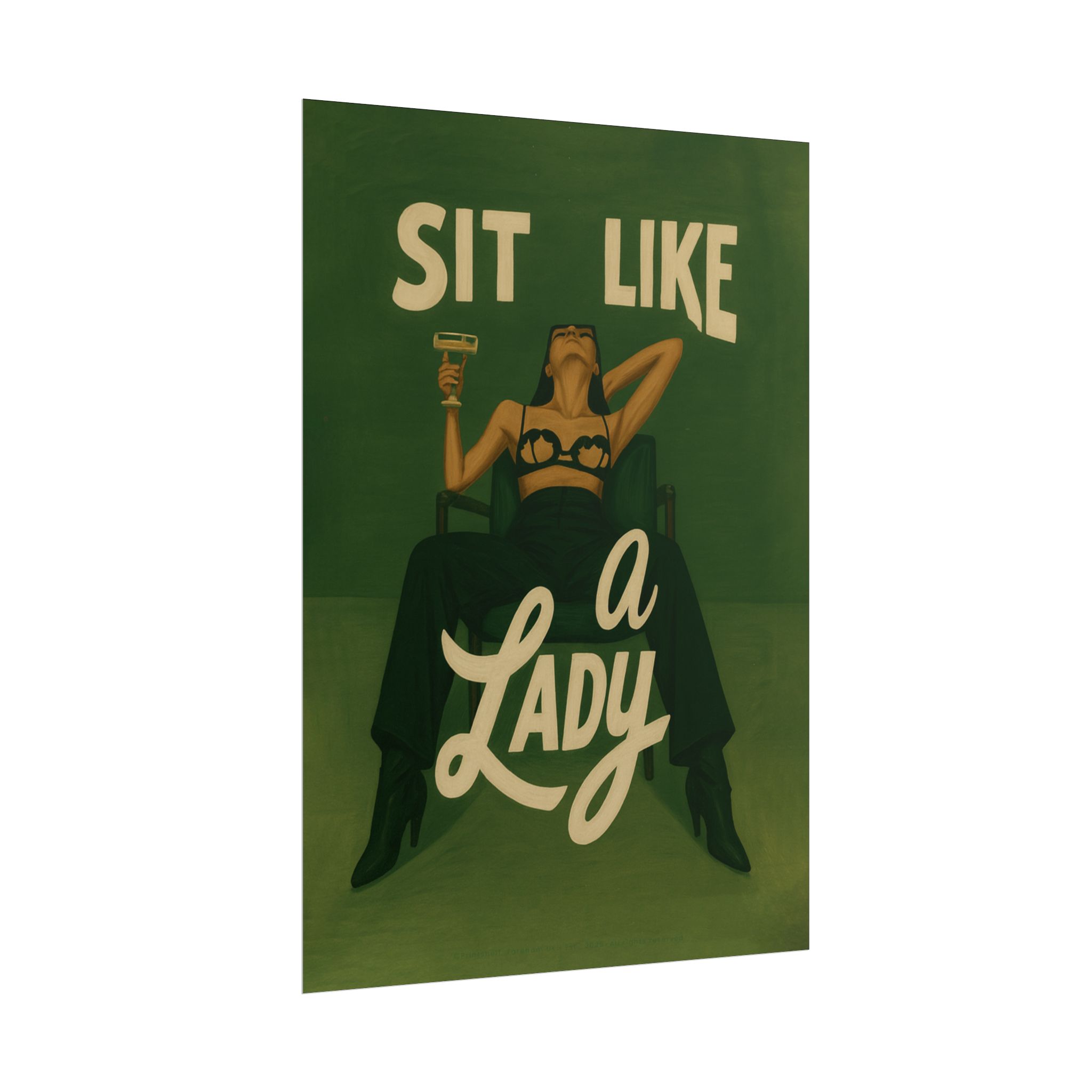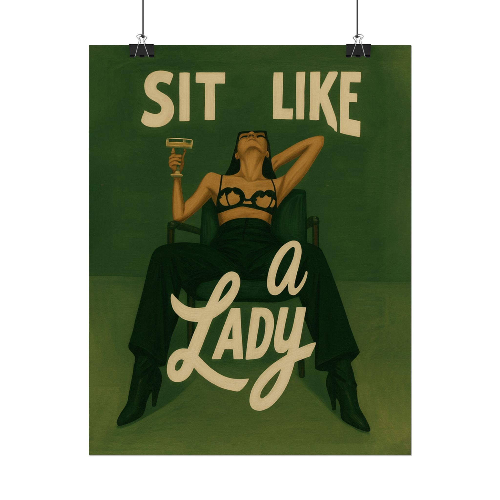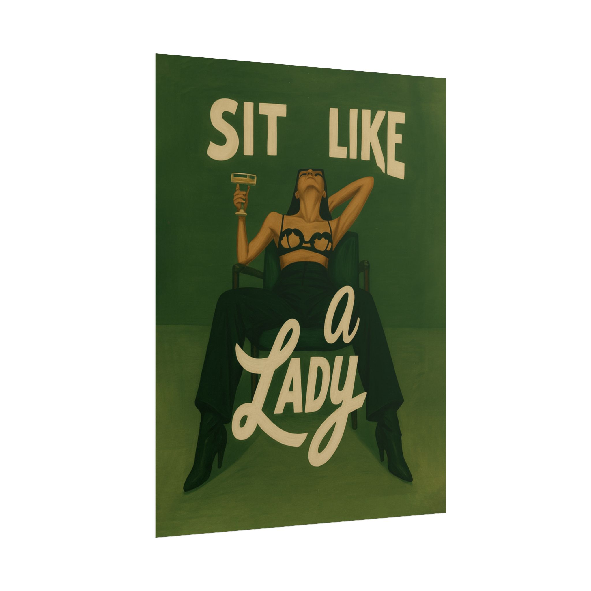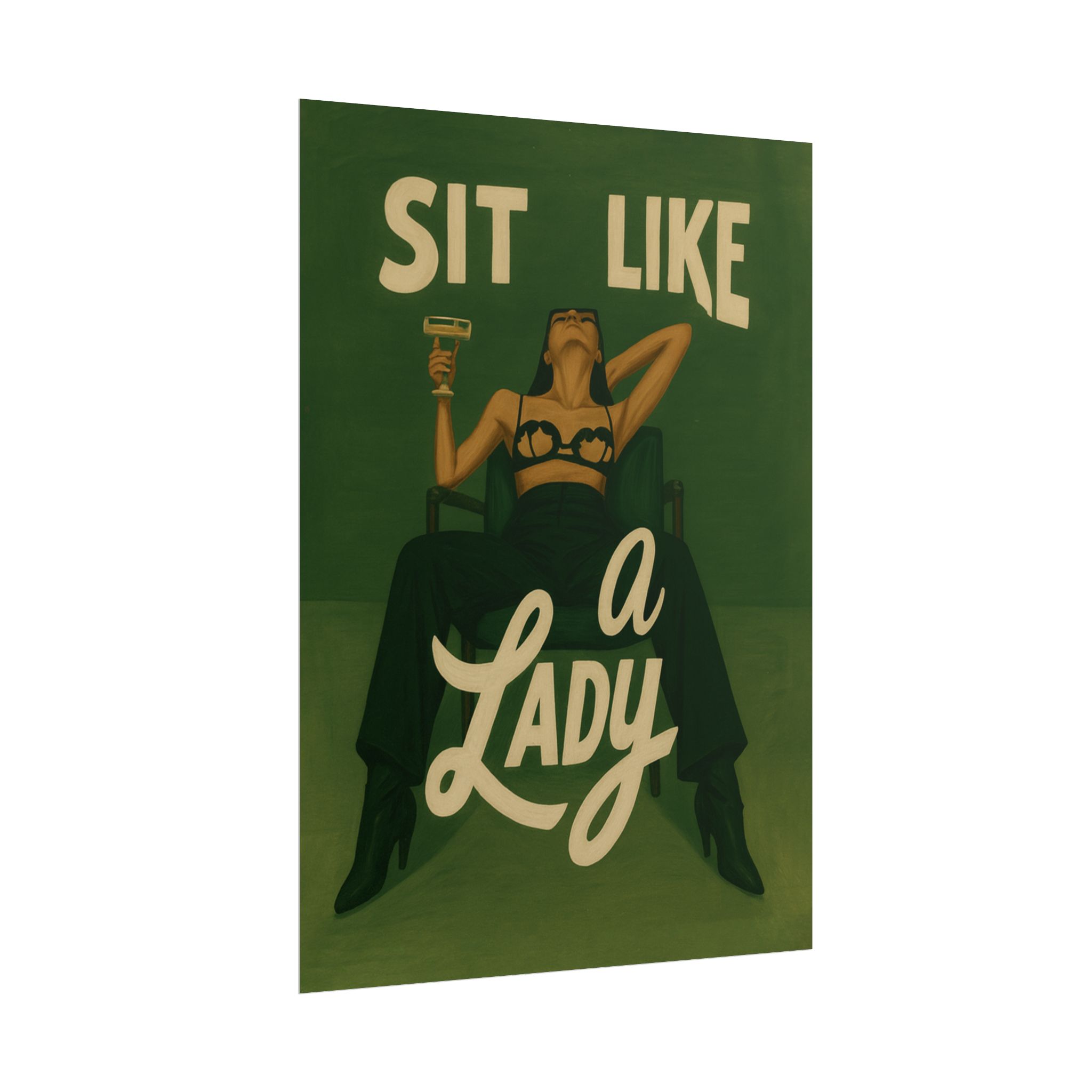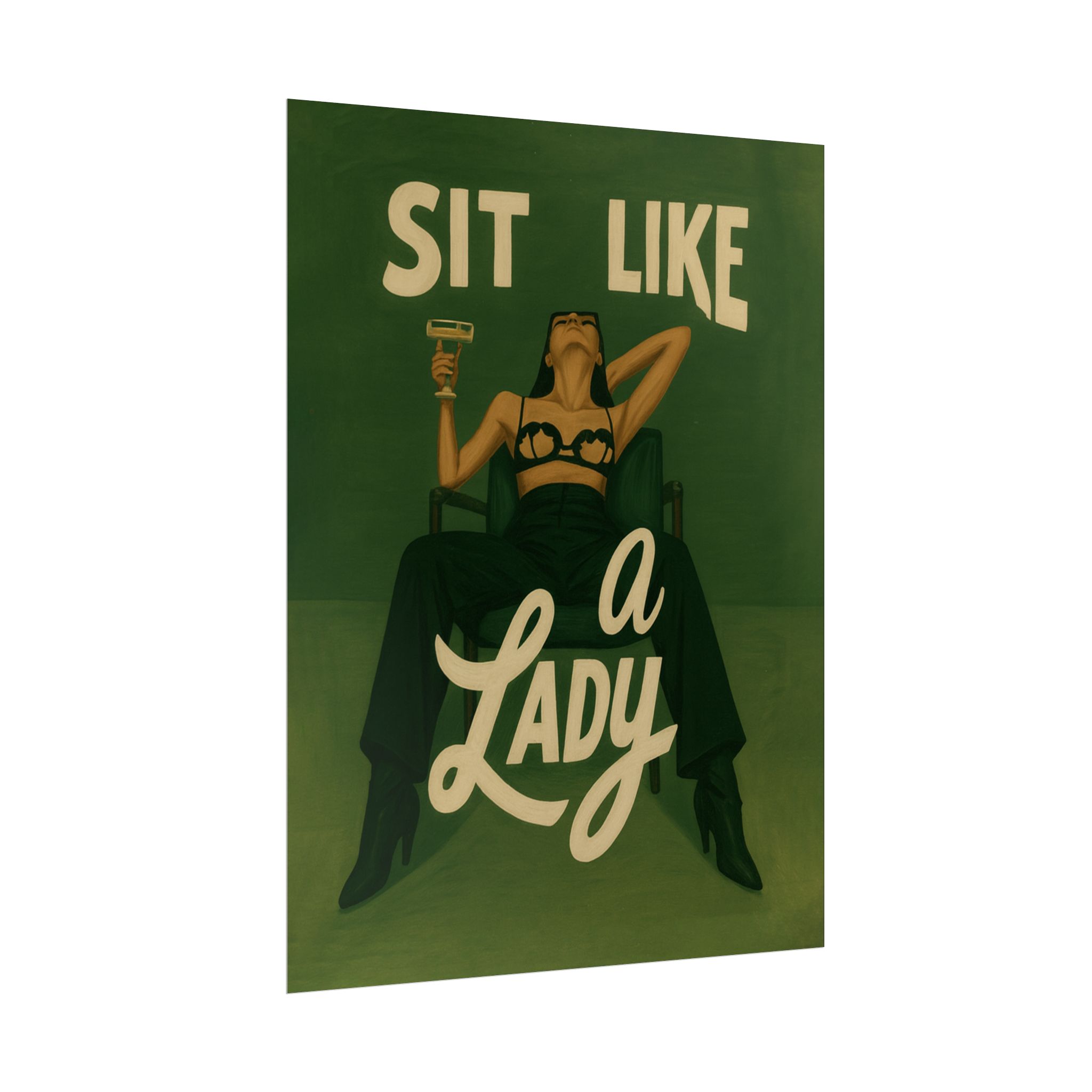 A rolled art poster that brings vintage attitude into modern spaces. Rich greens and warm cream tones render a bold, retro illustration of a confident woman reclining with a cocktail and the assertive headline “Sit Like a Lady.” The image feels both nostalgic and subversive — like finding an old travel or advertising poster with a sly wink. Hang it above a bar cart, lean it on a bookshelf, or roll it into a frame to add irreverent elegance to your living room, studio, or lounge. Available in horizontal and vertical layouts, and printed on your choice of semi‑gloss, matte, or textured fine‑art paper using long-lasting giclée inks. Each print arrives rolled for easy shipping and careful unwrapping, ready to style the corner where personality matters most.