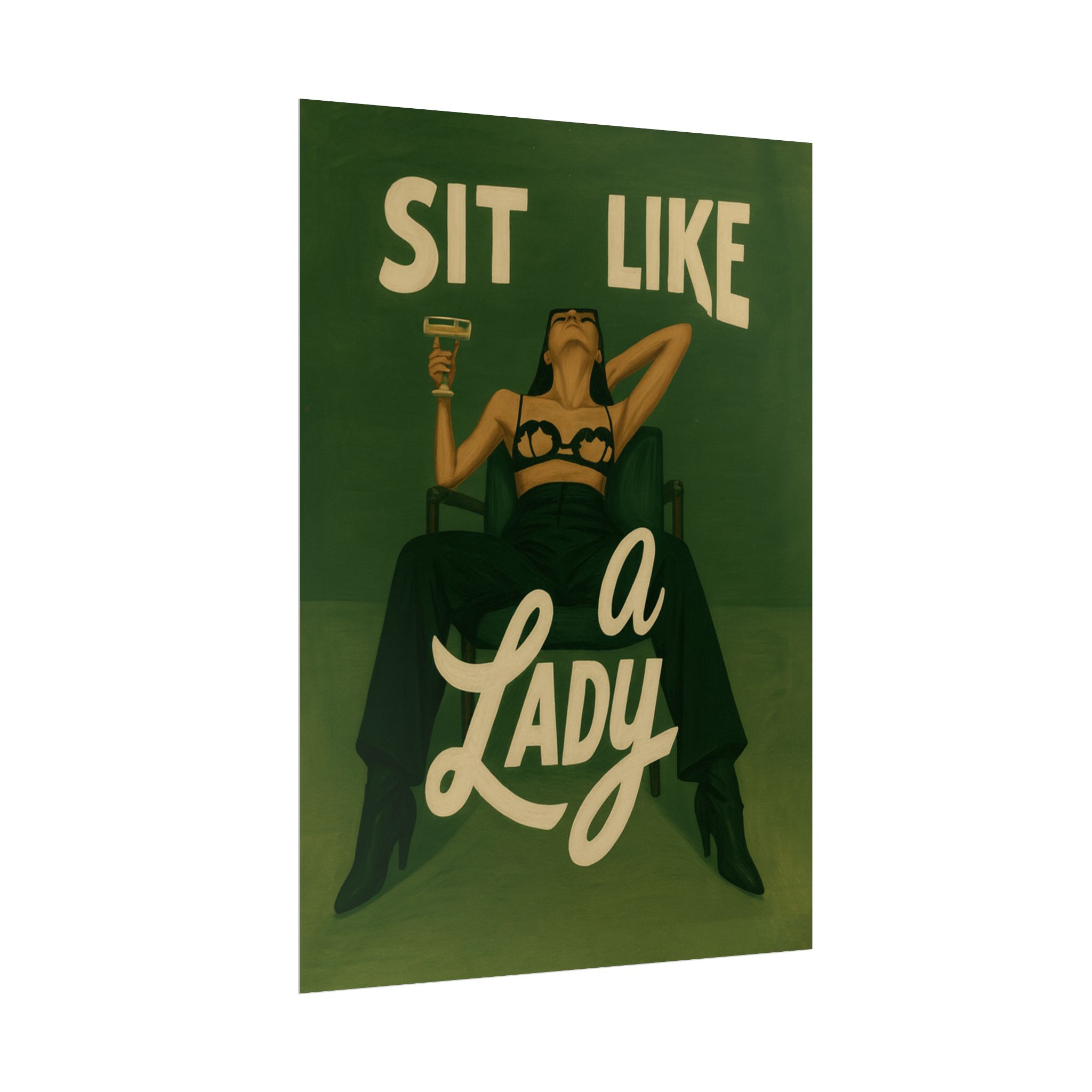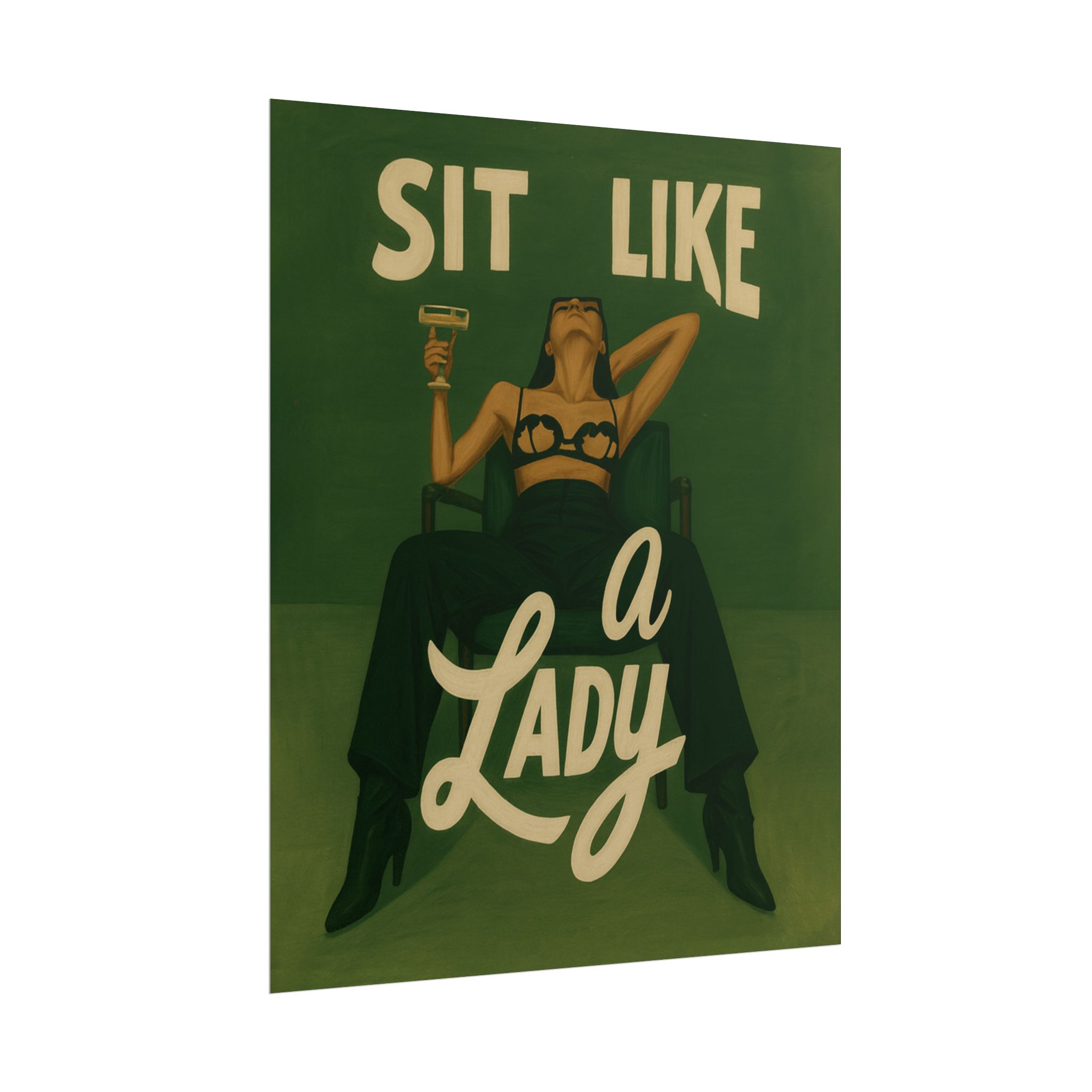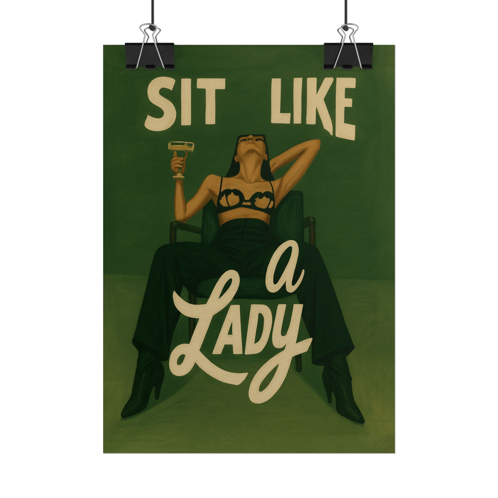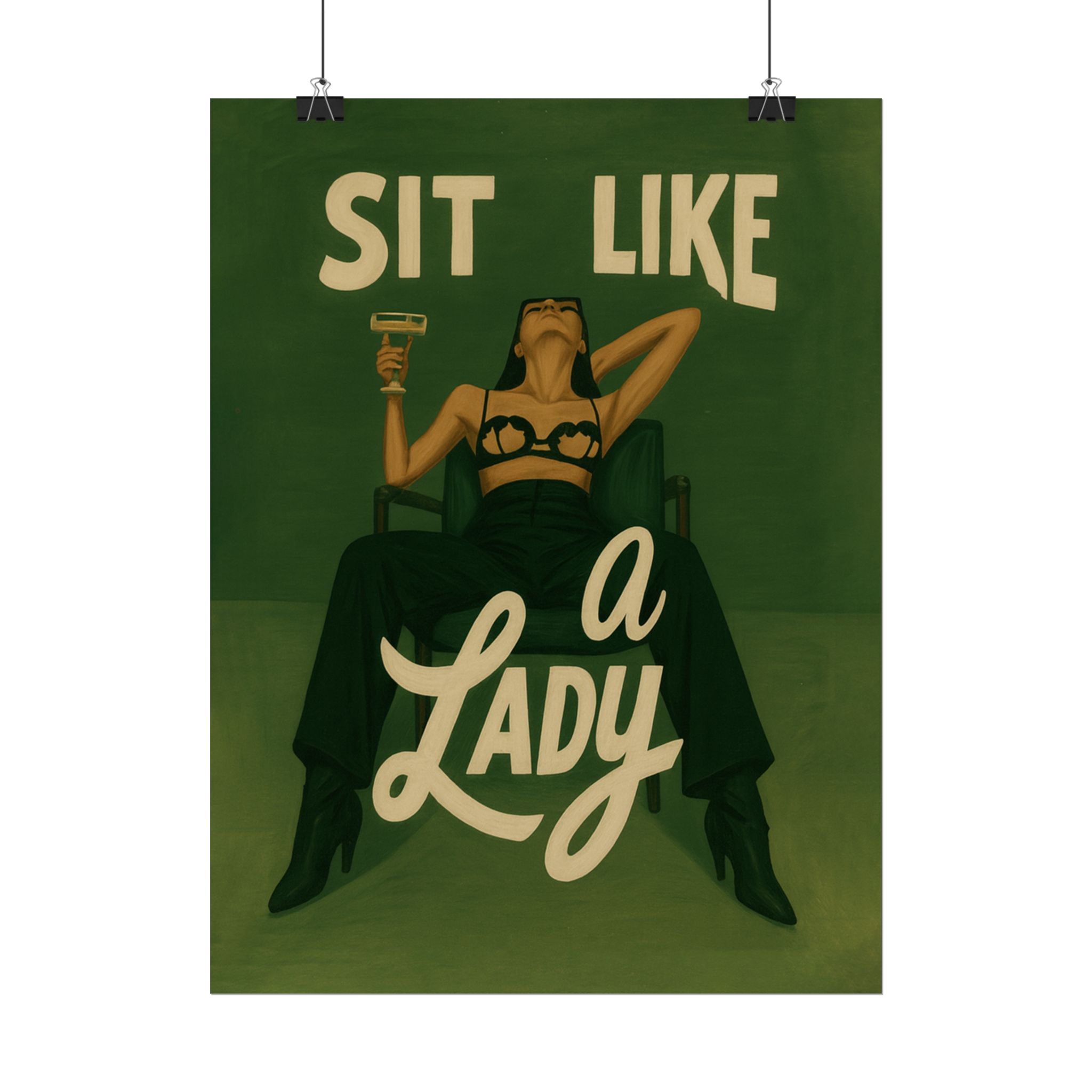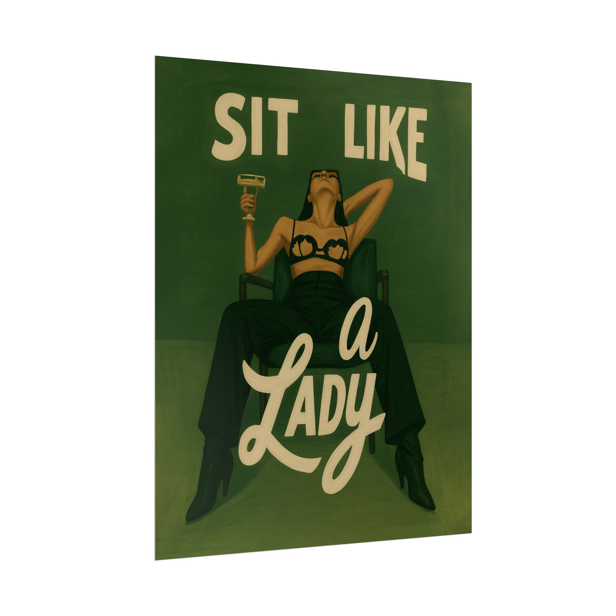 A rolled art poster that brings vintage attitude into modern spaces. Rich greens and warm cream tones render a bold, retro illustration of a confident woman reclining with a cocktail and the assertive headline “Sit Like a Lady.” The image feels both nostalgic and subversive — like finding an old travel or advertising poster with a sly wink. Hang it above a bar cart, lean it on a bookshelf, or roll it into a frame to add irreverent elegance to your living room, studio, or lounge. Available in horizontal and vertical layouts, and printed on your choice of semi‑gloss, matte, or textured fine‑art paper using long-lasting giclée inks. Each print arrives rolled for easy shipping and careful unwrapping, ready to style the corner where personality matters most.