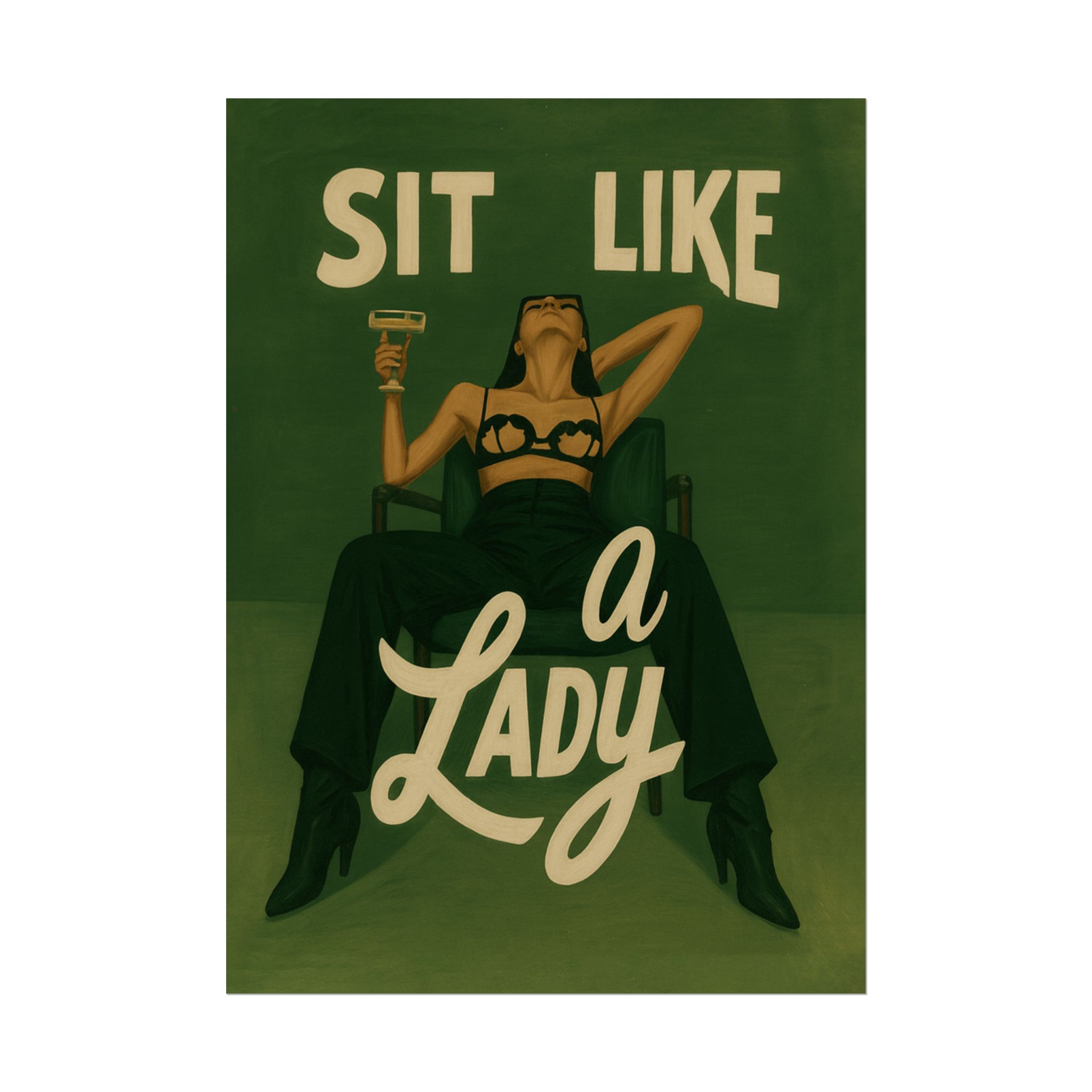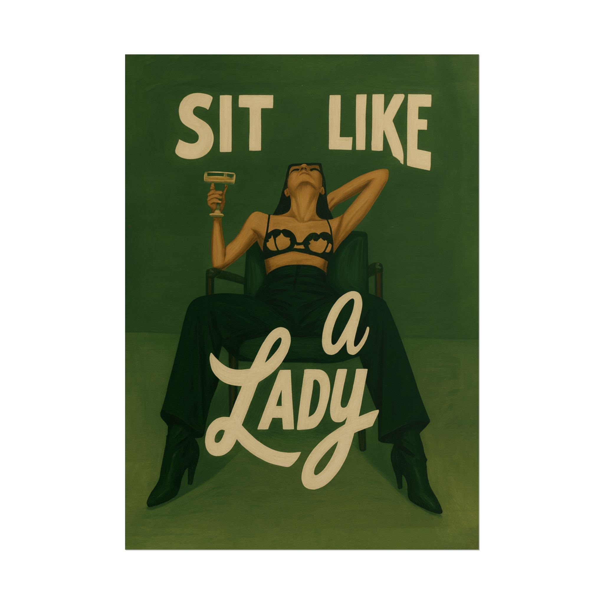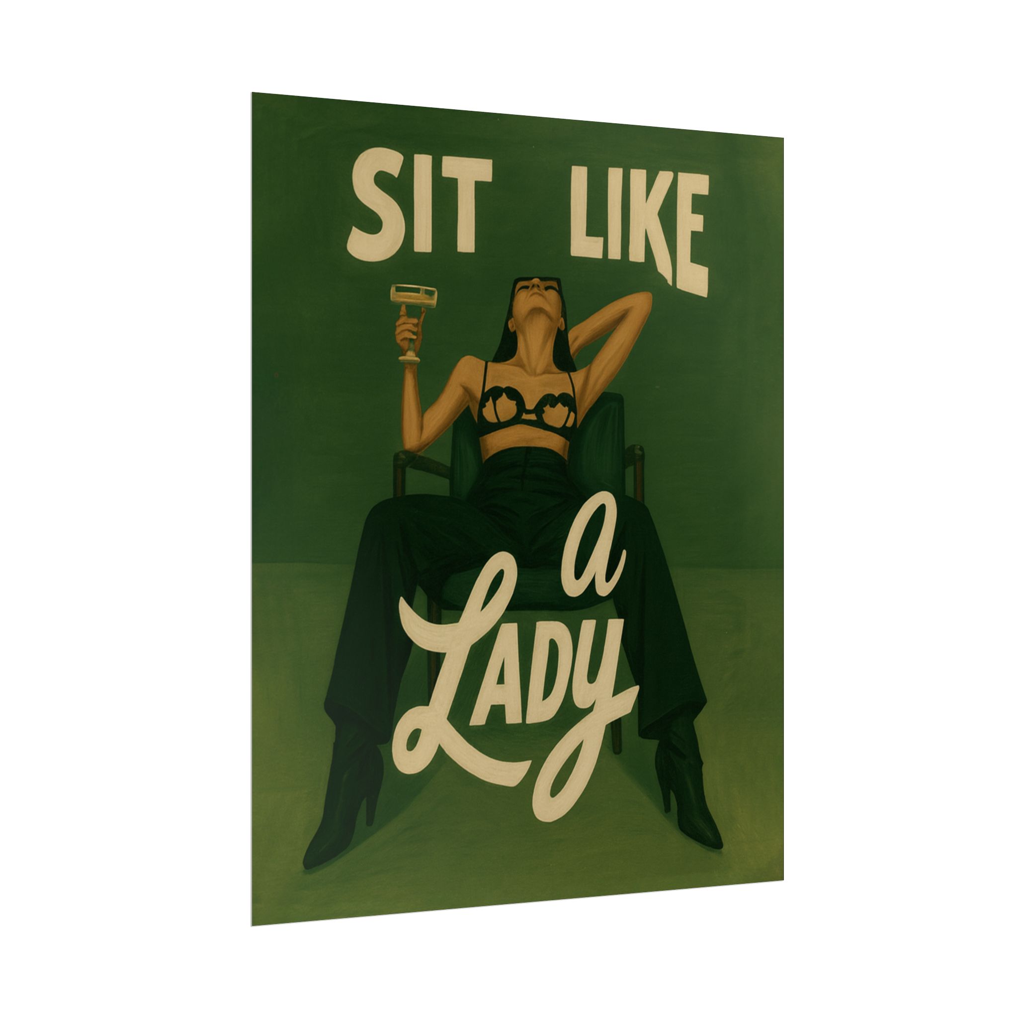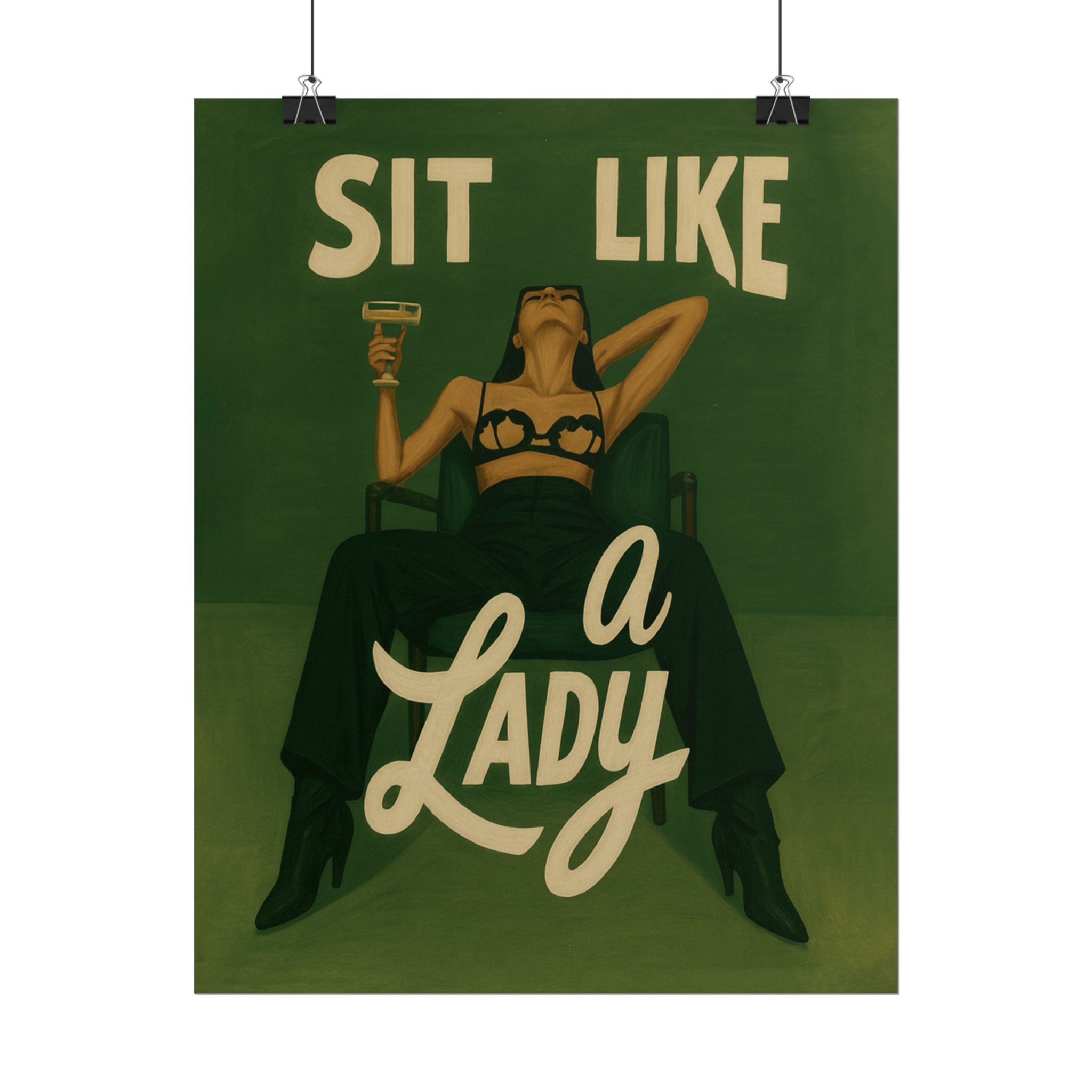 A rolled art poster that brings vintage attitude into modern spaces. Rich greens and warm cream tones render a bold, retro illustration of a confident woman reclining with a cocktail and the assertive headline “Sit Like a Lady.” The image feels both nostalgic and subversive — like finding an old travel or advertising poster with a sly wink. Hang it above a bar cart, lean it on a bookshelf, or roll it into a frame to add irreverent elegance to your living room, studio, or lounge. Available in horizontal and vertical layouts, and printed on your choice of semi‑gloss, matte, or textured fine‑art paper using long-lasting giclée inks. Each print arrives rolled for easy shipping and careful unwrapping, ready to style the corner where personality matters most.