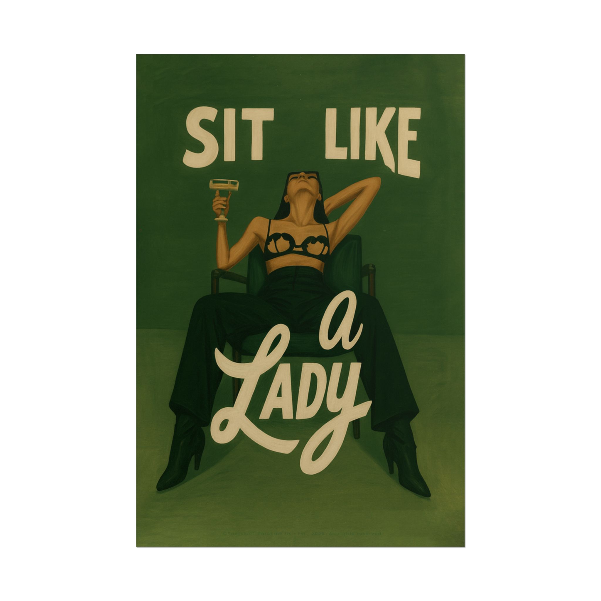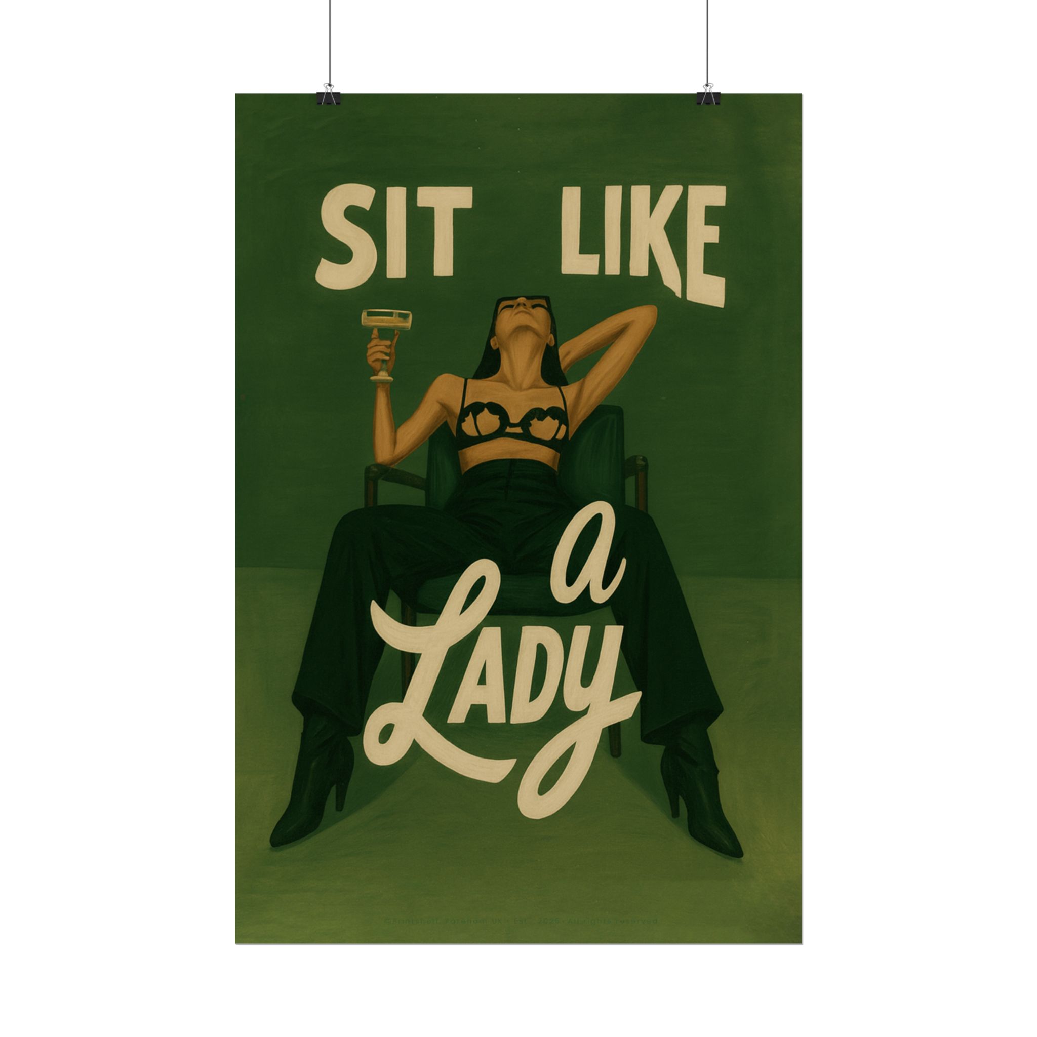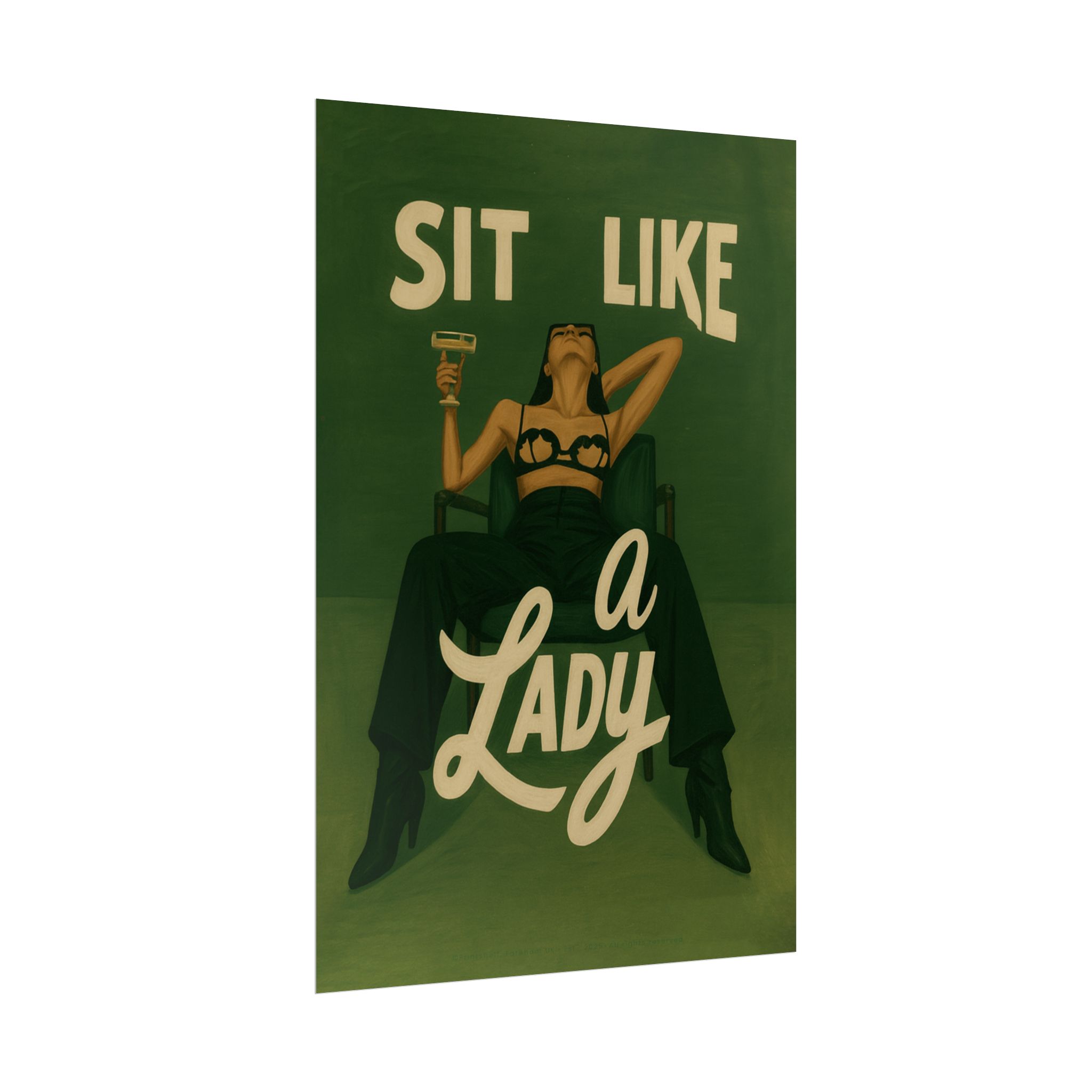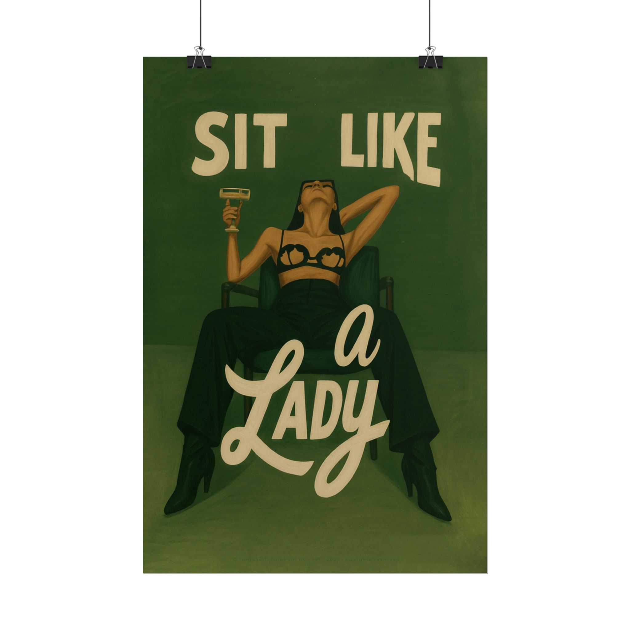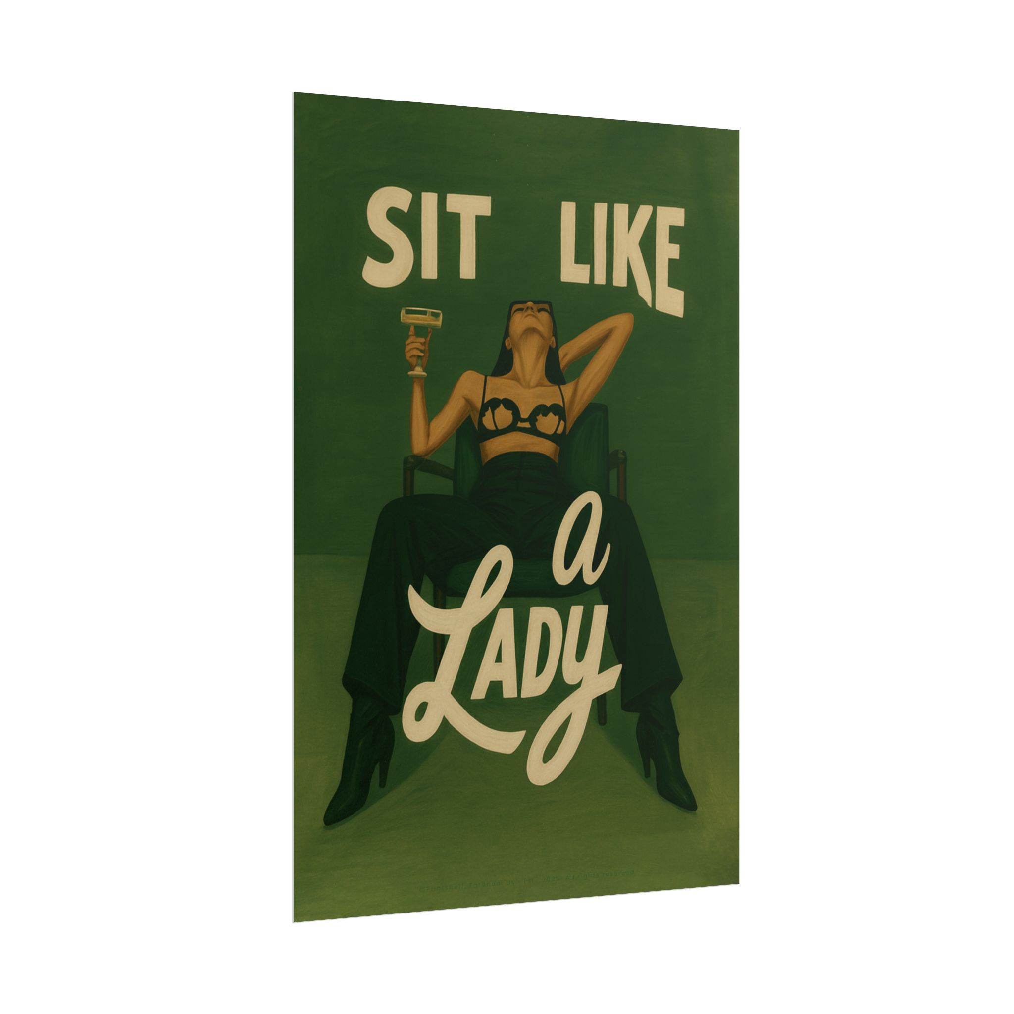 A rolled art poster that brings vintage attitude into modern spaces. Rich greens and warm cream tones render a bold, retro illustration of a confident woman reclining with a cocktail and the assertive headline “Sit Like a Lady.” The image feels both nostalgic and subversive — like finding an old travel or advertising poster with a sly wink. Hang it above a bar cart, lean it on a bookshelf, or roll it into a frame to add irreverent elegance to your living room, studio, or lounge. Available in horizontal and vertical layouts, and printed on your choice of semi‑gloss, matte, or textured fine‑art paper using long-lasting giclée inks. Each print arrives rolled for easy shipping and careful unwrapping, ready to style the corner where personality matters most.