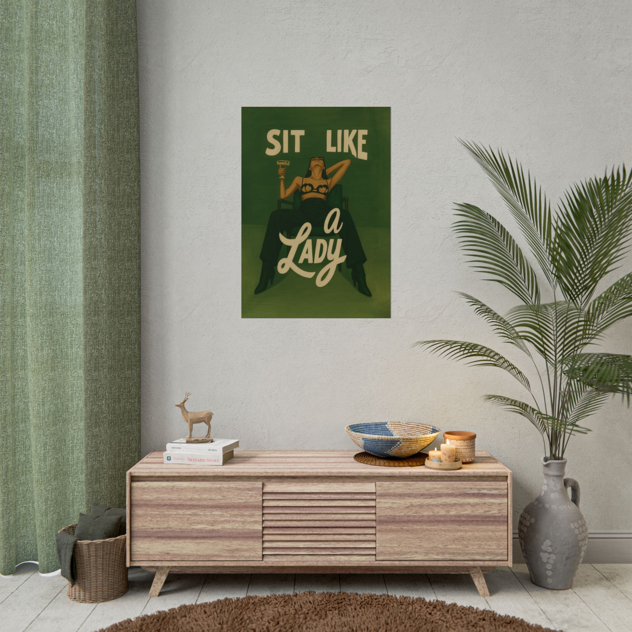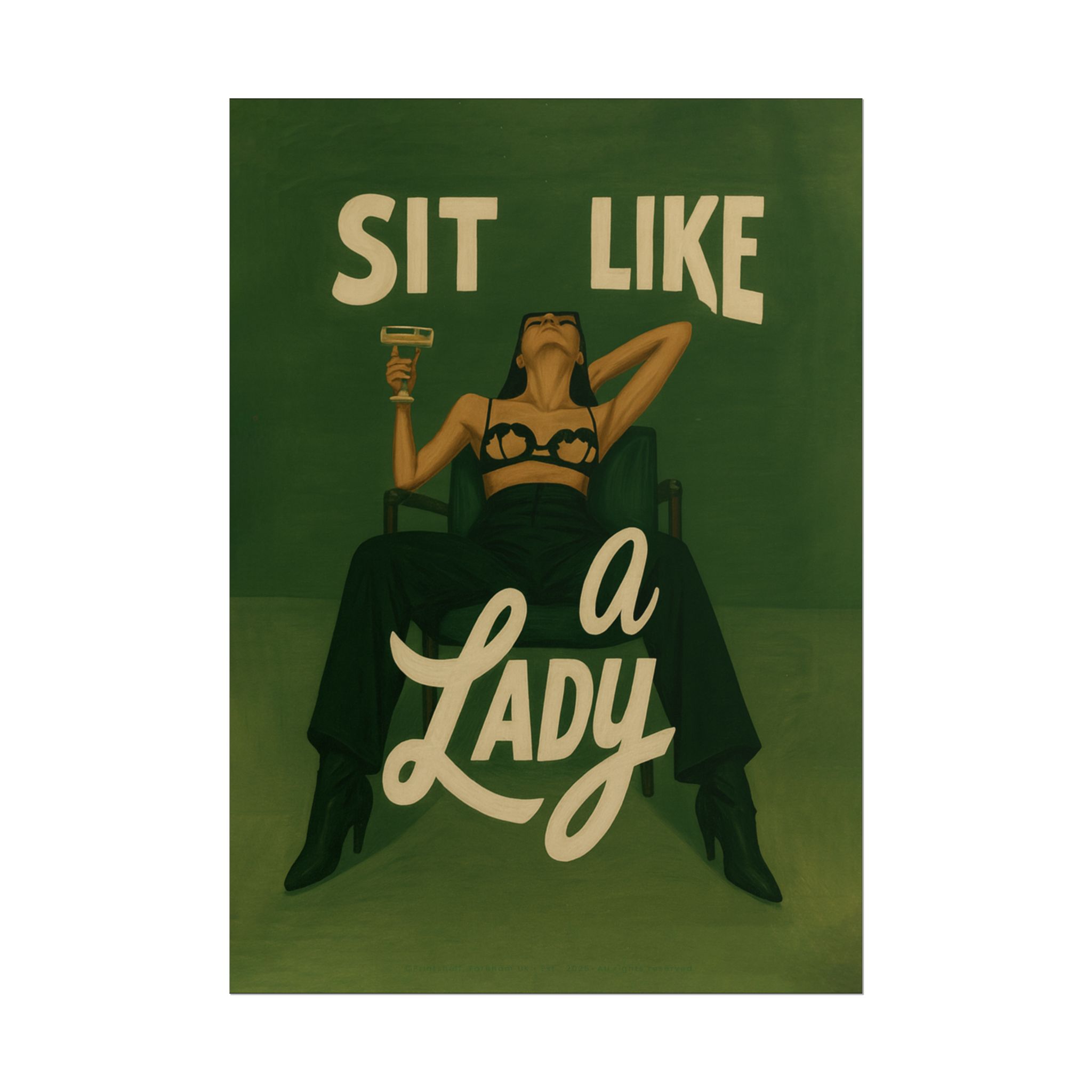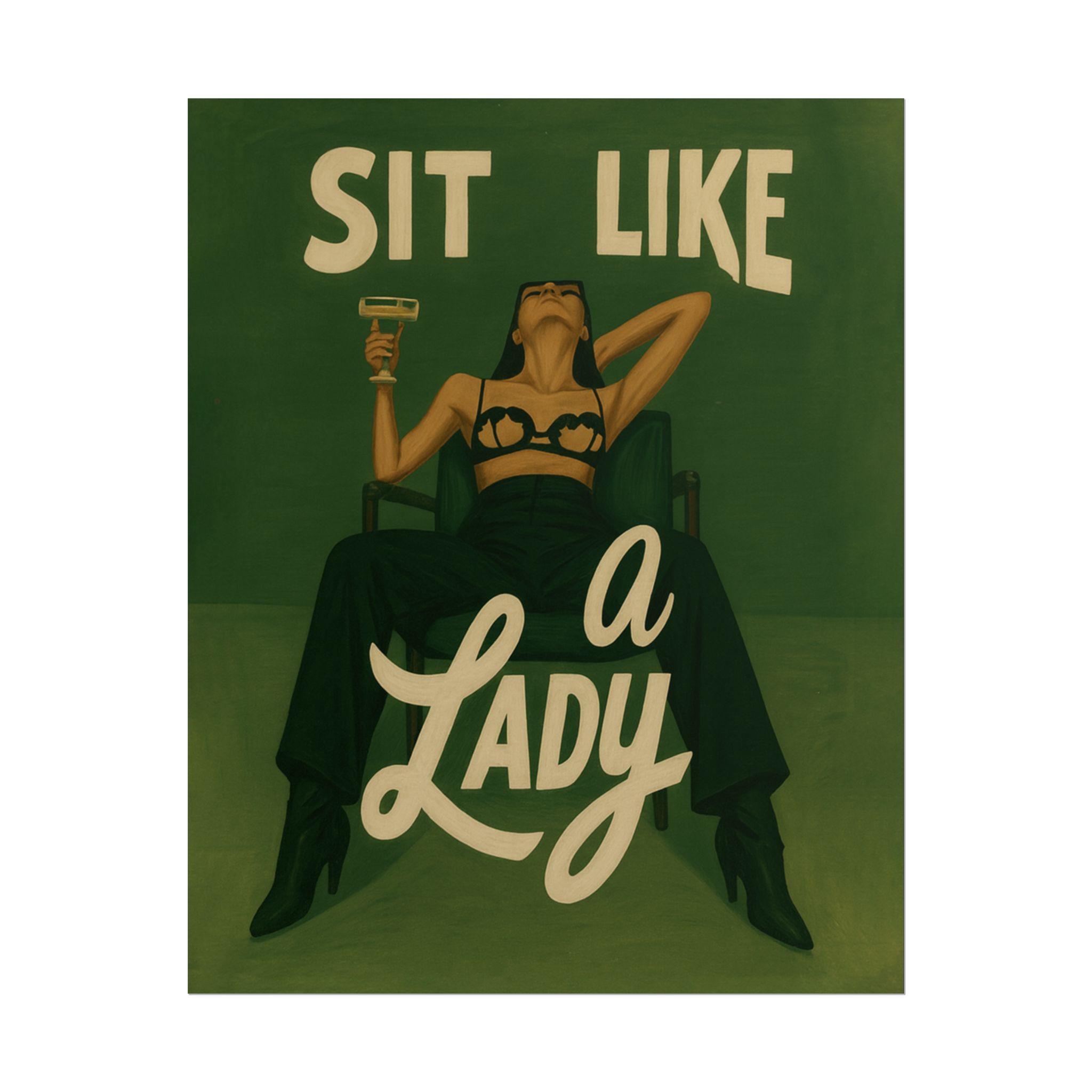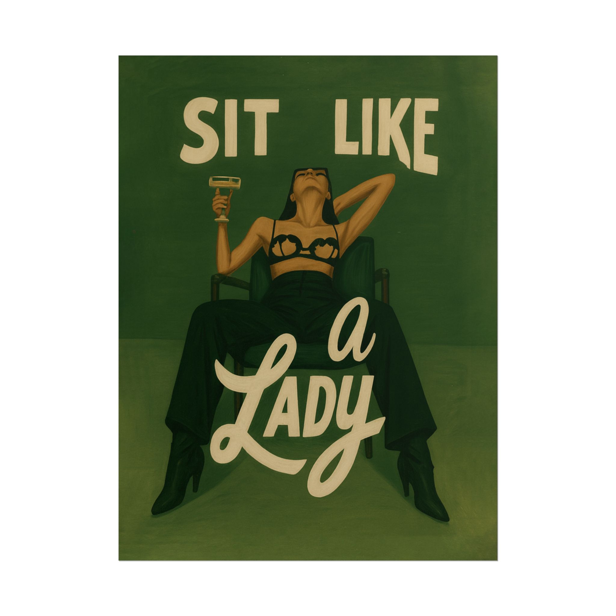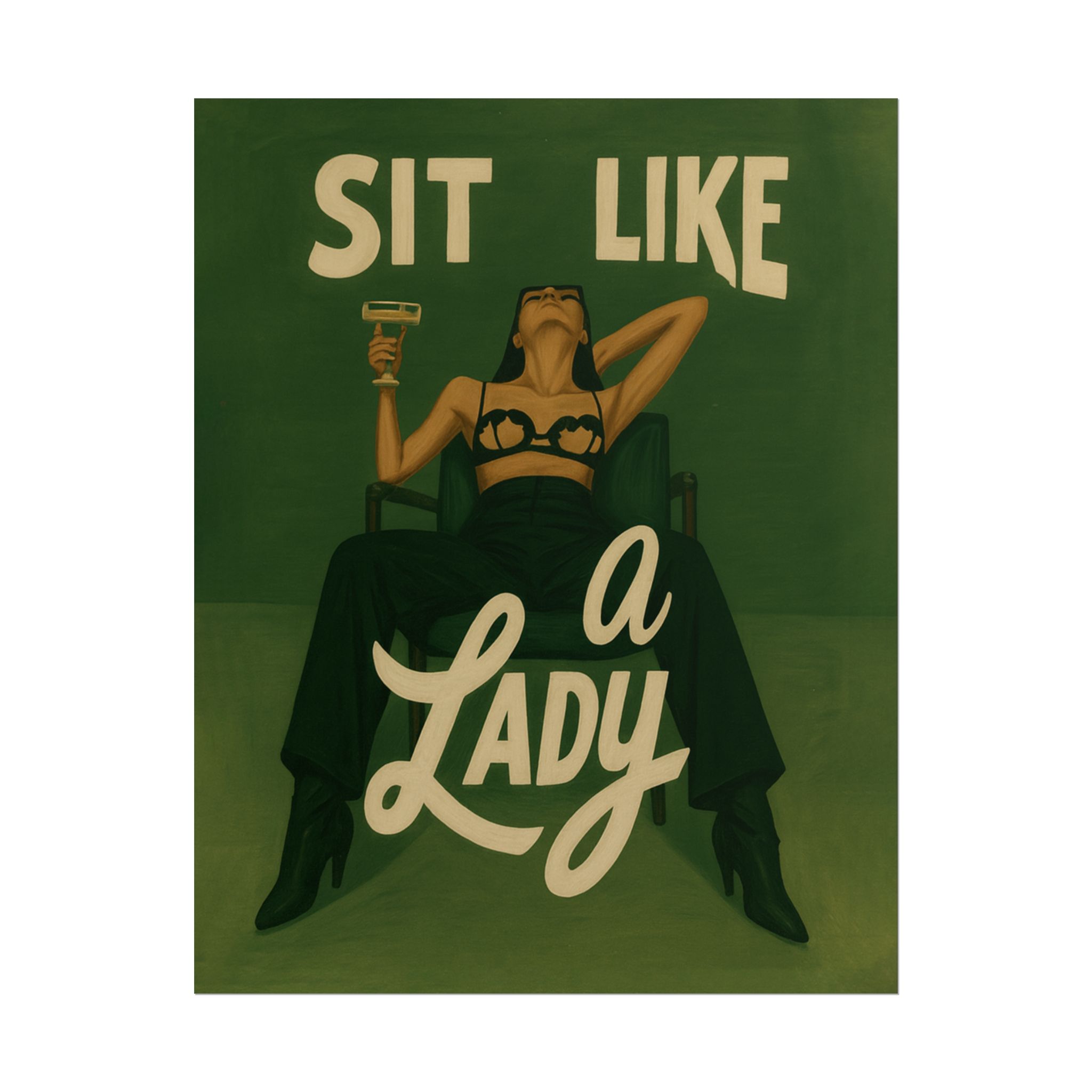 A rolled art poster that brings vintage attitude into modern spaces. Rich greens and warm cream tones render a bold, retro illustration of a confident woman reclining with a cocktail and the assertive headline “Sit Like a Lady.” The image feels both nostalgic and subversive — like finding an old travel or advertising poster with a sly wink. Hang it above a bar cart, lean it on a bookshelf, or roll it into a frame to add irreverent elegance to your living room, studio, or lounge. Available in horizontal and vertical layouts, and printed on your choice of semi‑gloss, matte, or textured fine‑art paper using long-lasting giclée inks. Each print arrives rolled for easy shipping and careful unwrapping, ready to style the corner where personality matters most.