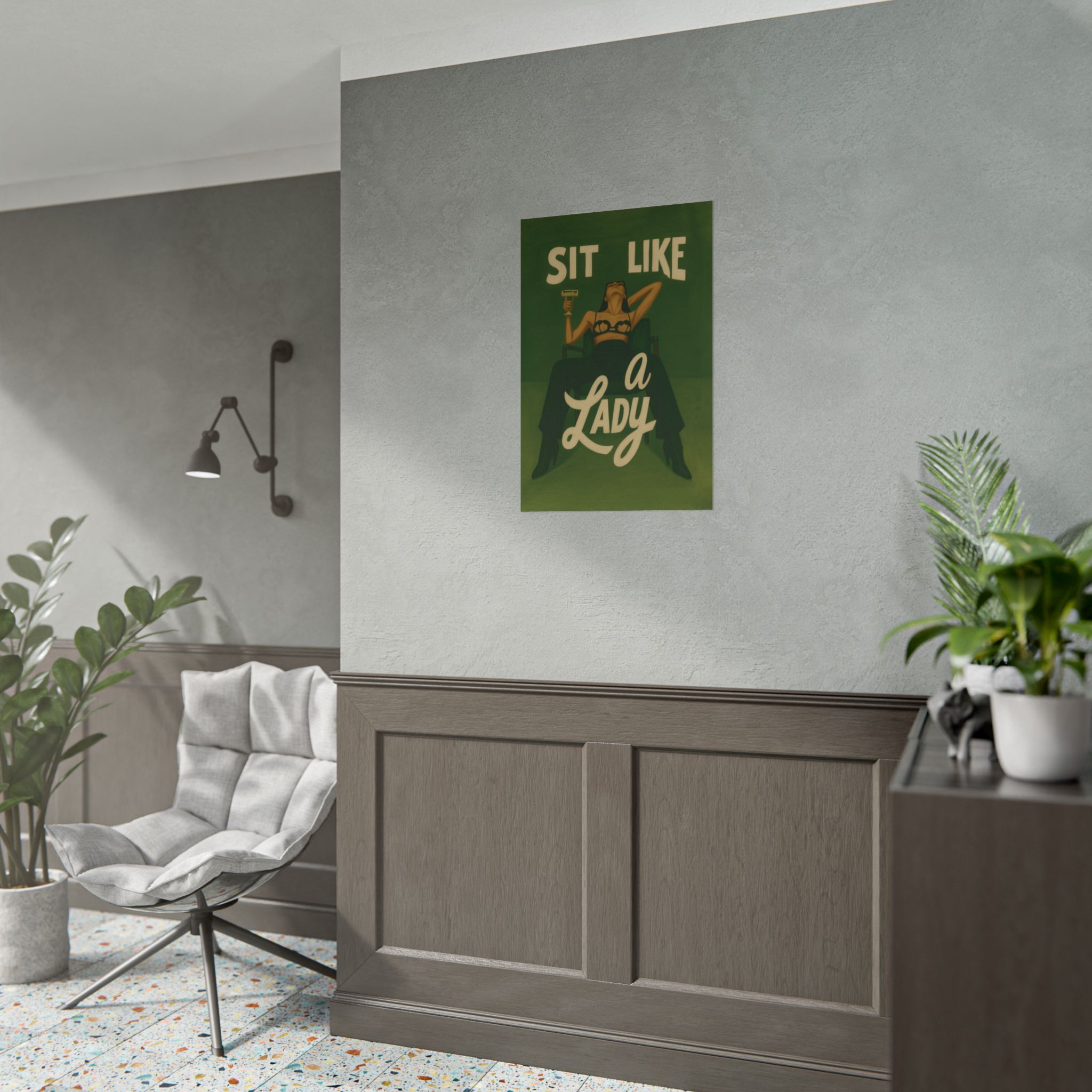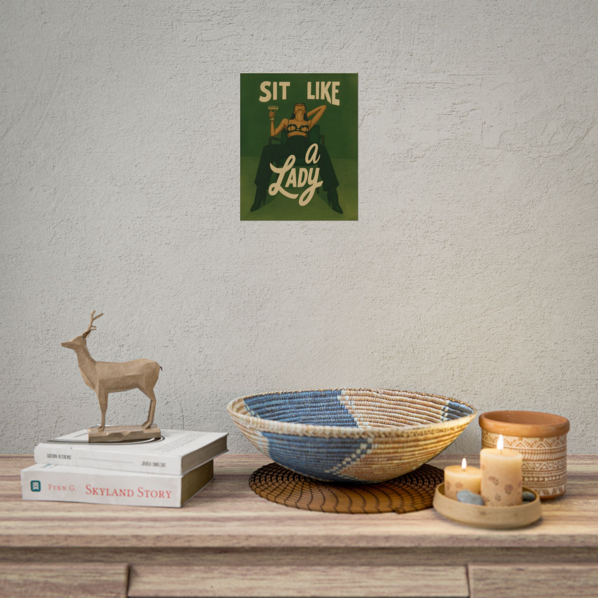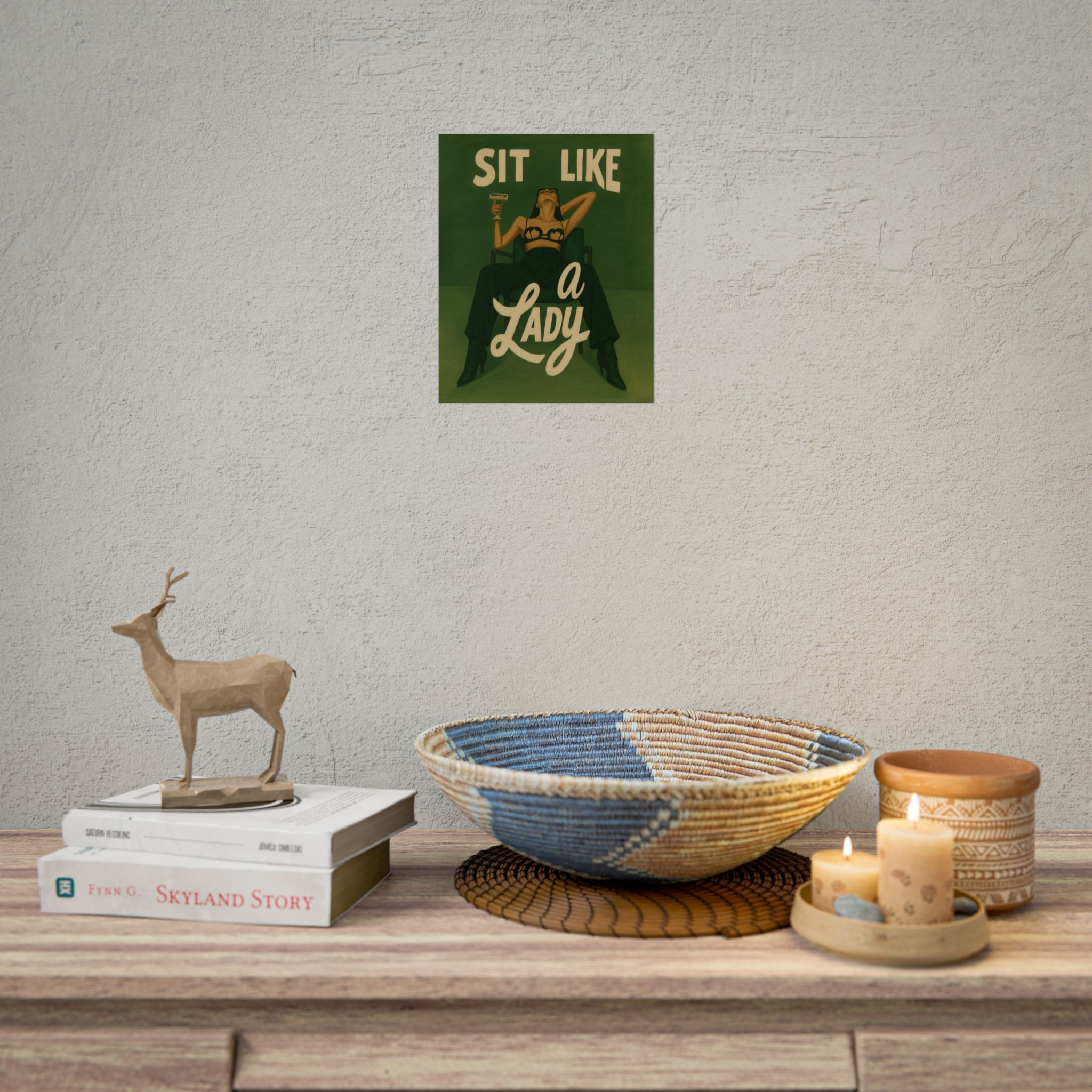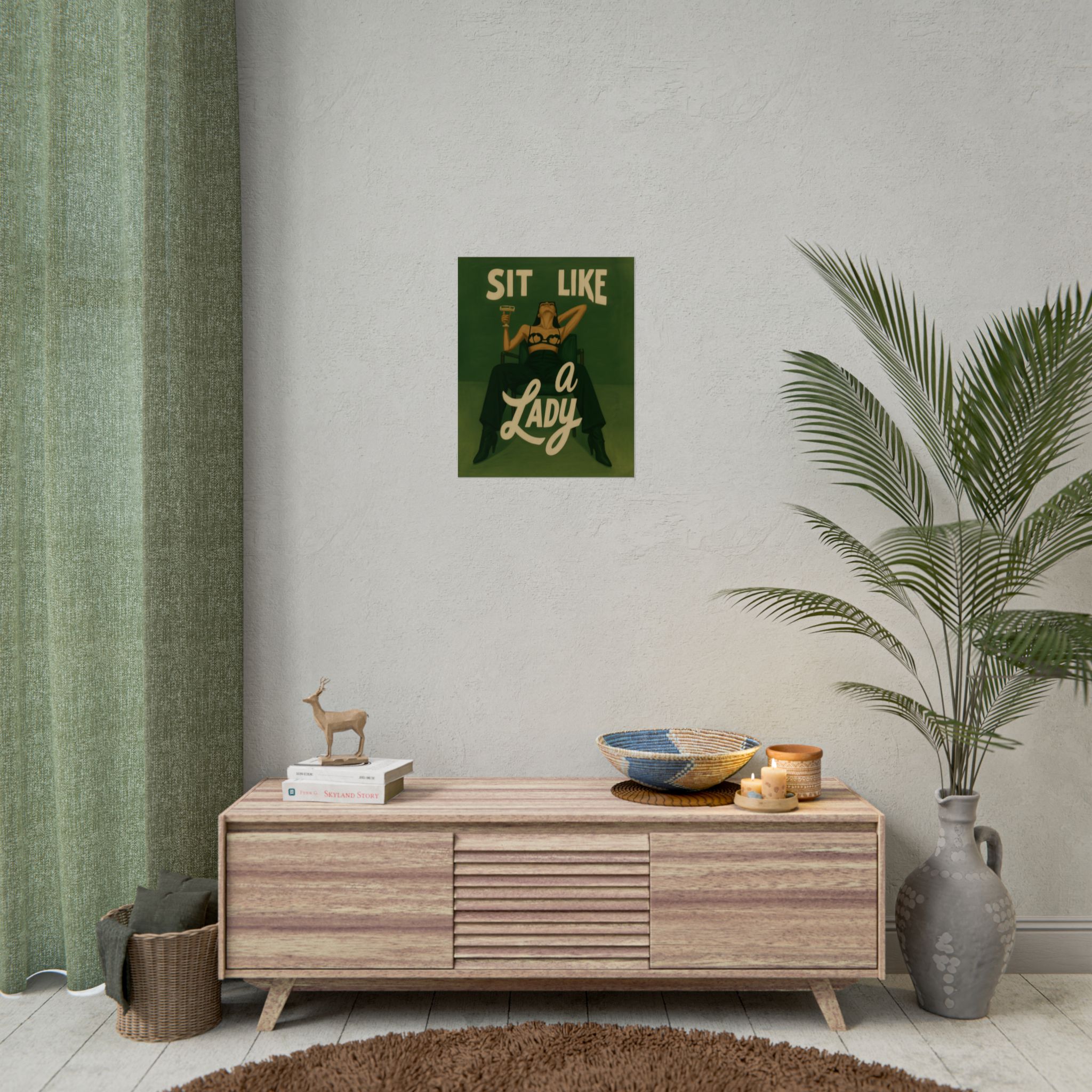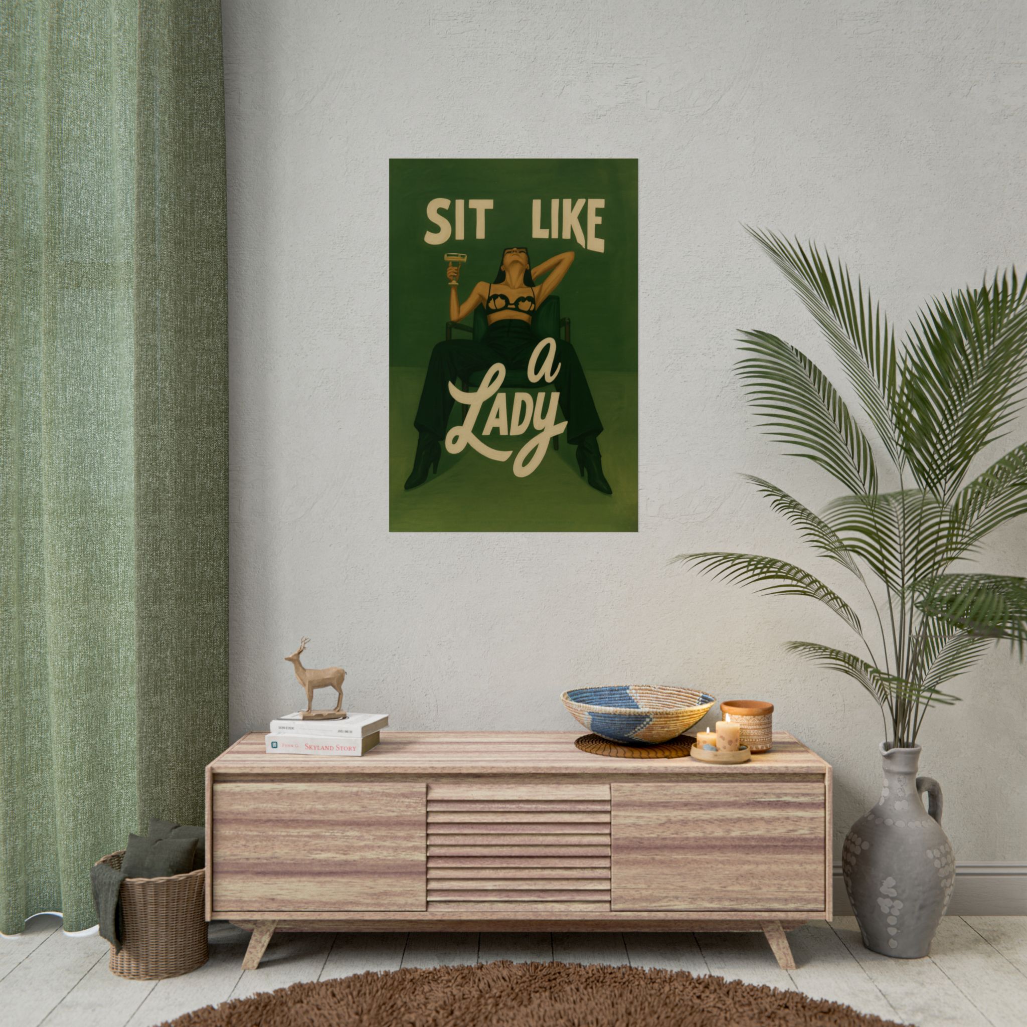 A rolled art poster that brings vintage attitude into modern spaces. Rich greens and warm cream tones render a bold, retro illustration of a confident woman reclining with a cocktail and the assertive headline “Sit Like a Lady.” The image feels both nostalgic and subversive — like finding an old travel or advertising poster with a sly wink. Hang it above a bar cart, lean it on a bookshelf, or roll it into a frame to add irreverent elegance to your living room, studio, or lounge. Available in horizontal and vertical layouts, and printed on your choice of semi‑gloss, matte, or textured fine‑art paper using long-lasting giclée inks. Each print arrives rolled for easy shipping and careful unwrapping, ready to style the corner where personality matters most.