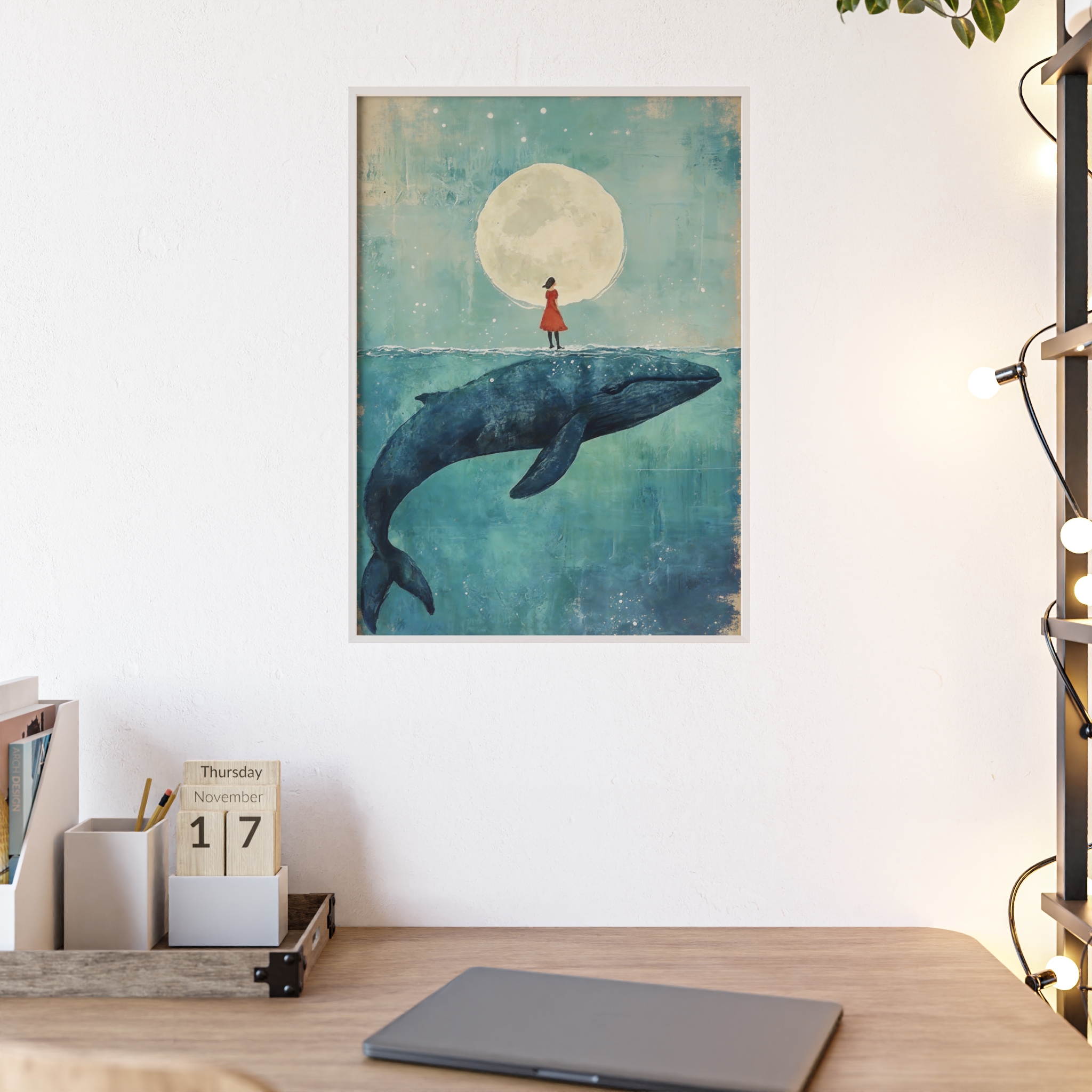 Under a midnight sky, a lone girl rides a gentle whale across a pool of moonlight. This framed poster brings that quiet, surreal voyage into your room — soft blues and silver highlights swim on high-quality photo paper while the pinewood frame tucks the scene into a calm, tactile edge. Hang it above a reading nook or beside a low lamp to invite evenings of daydreaming and slow storytelling. The image feels like a private fable: a slow, floating escape that fits walls where imagination lives.